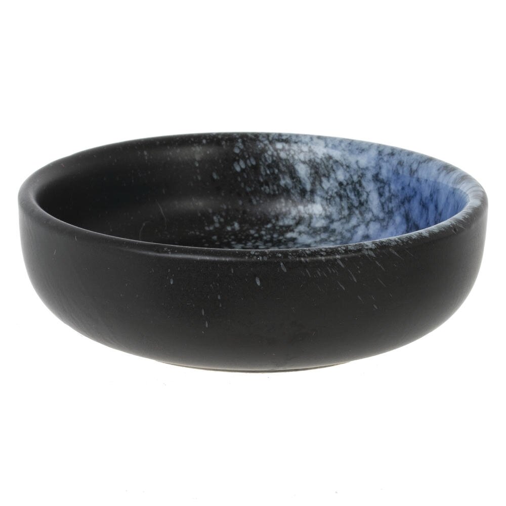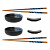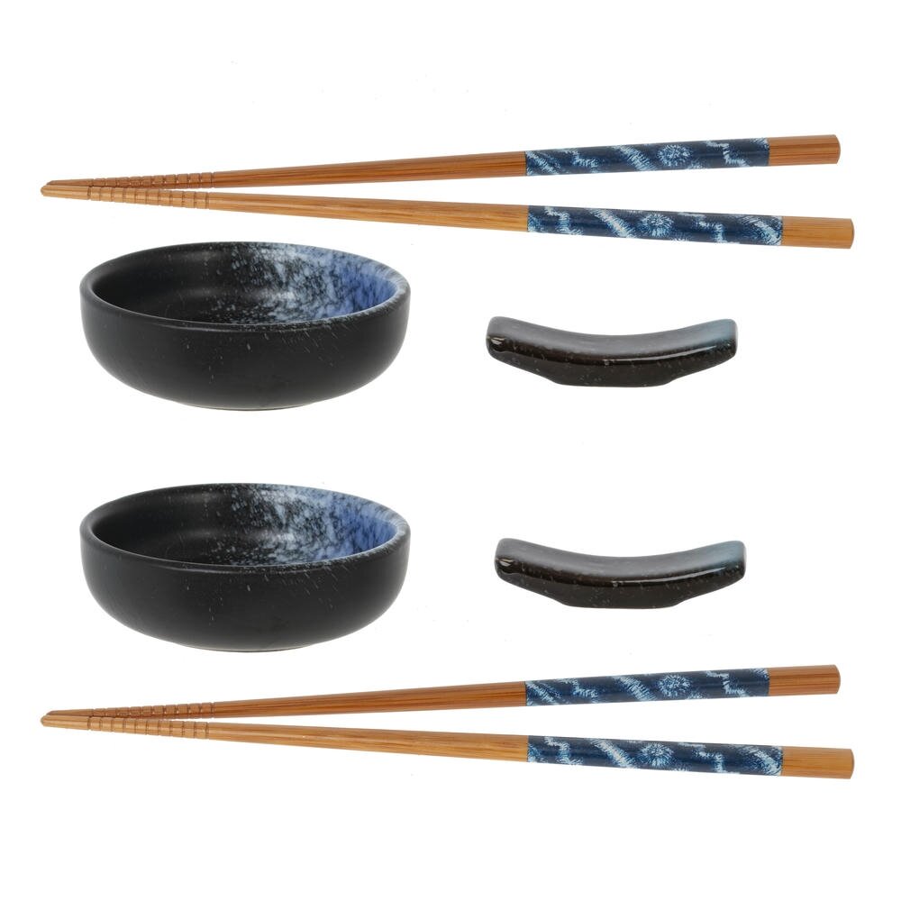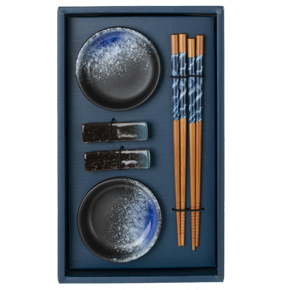 Набор для суши. В комплекте две фарфоровые пиалы объёмом по 70 мл для соевого соуса, унаги или дипов, две компактные фарфоровые подставки под палочки и два комплекта деревянных палочек. Чаши снаружи матово?чёрные, внутри сине?белый градиент с эффектом «морской пены». Палочки с рифлёными кончиками и синей декоративной вставкой, удобны в руке. Подставки поддерживают чистоту сервировки. Материалы: прочный фарфор и тёплое дерево. Подходит для роллов, сашими и темпуры, гармонирует с минималистичной посудой. Пиалы можно мыть в ПММ, палочки рекомендуется мыть вручную.