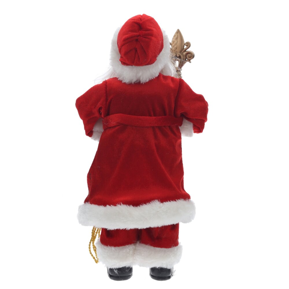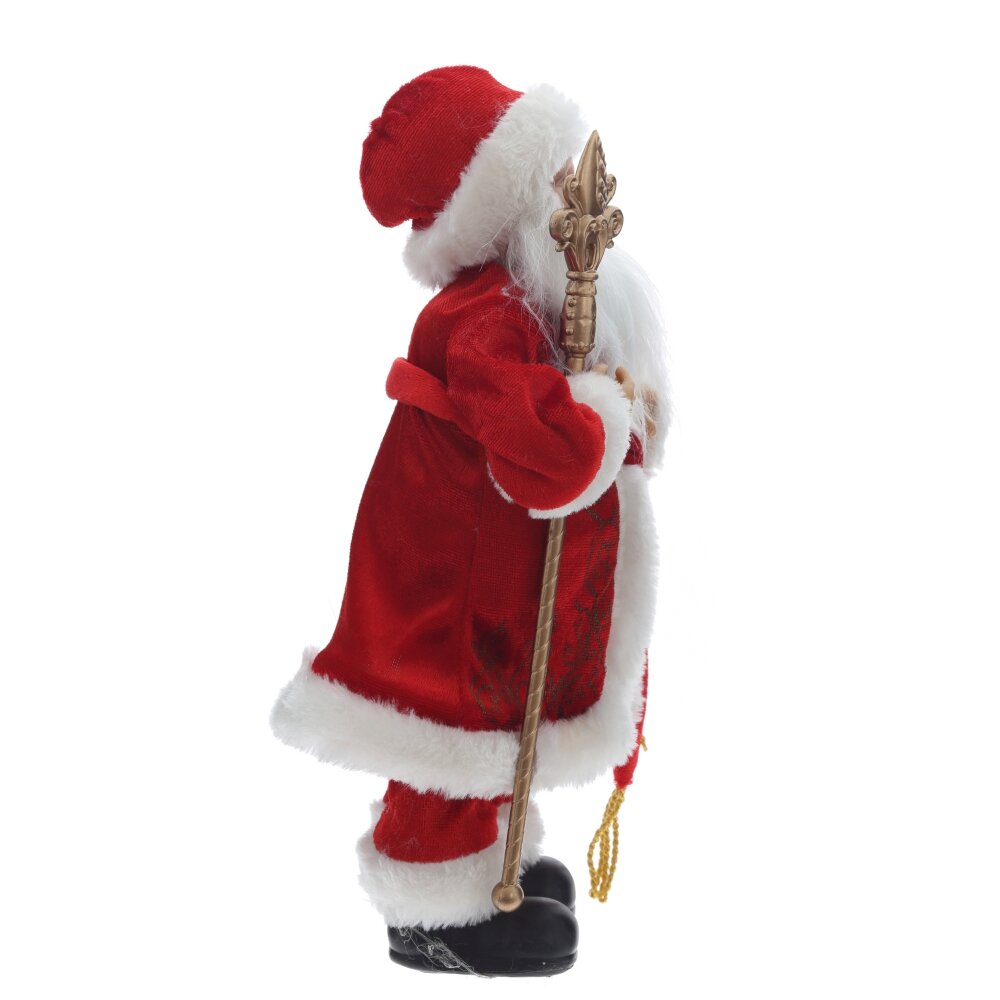 Дед-Мороз с посохом. Туловище мягконабивное, голова, ноги и руки из пластмассы. Кафтан из синтетической бархатной ткани красного цвета с золотой отделкой оторочен искусственным мехом.