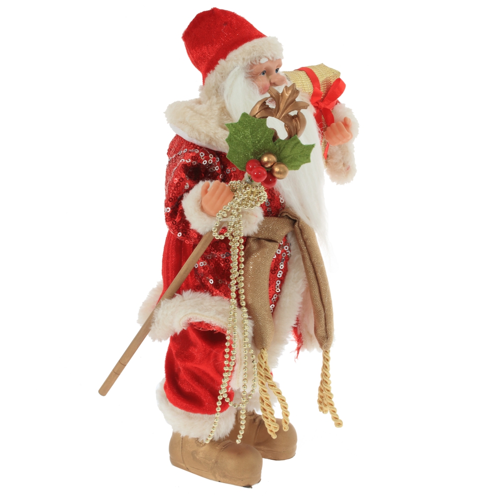 Дед Мороз в красной одежде с отделкой из искусственного меха, изготовлен из текстильных и полимерных материалов. Размер: L18 W7 H29 см.