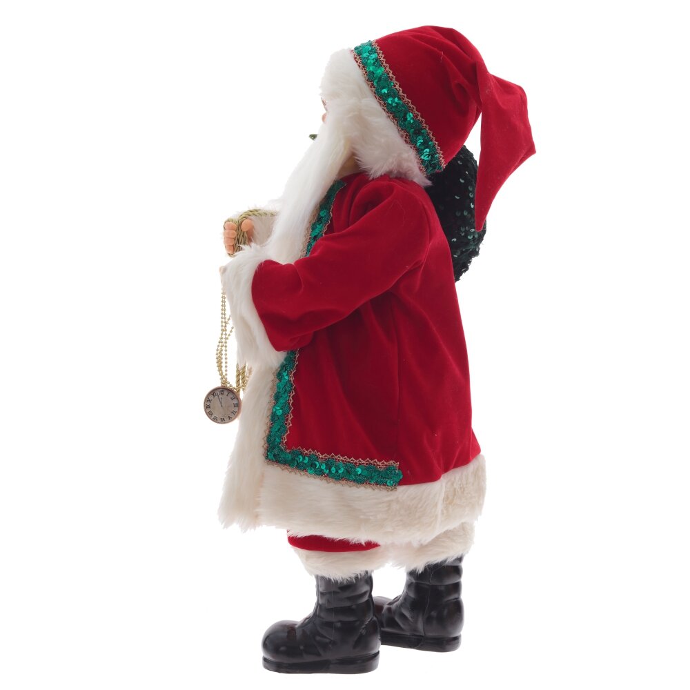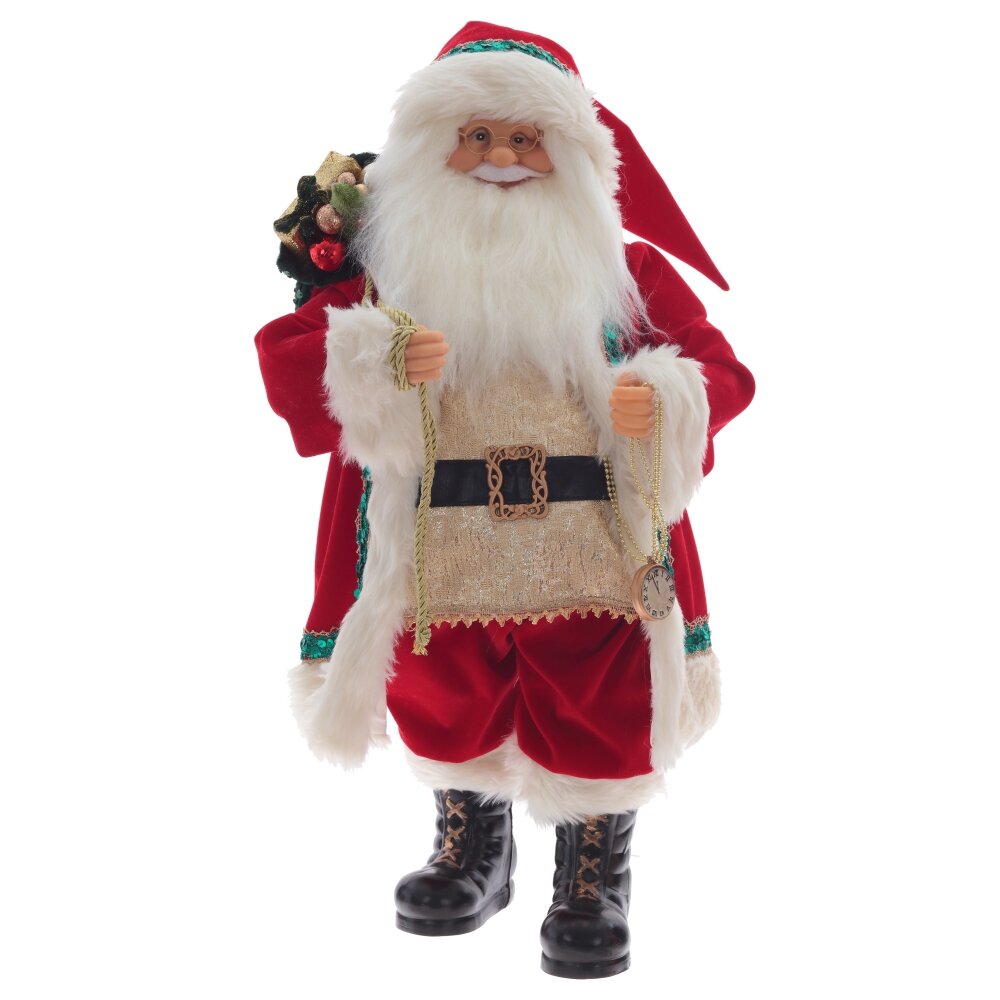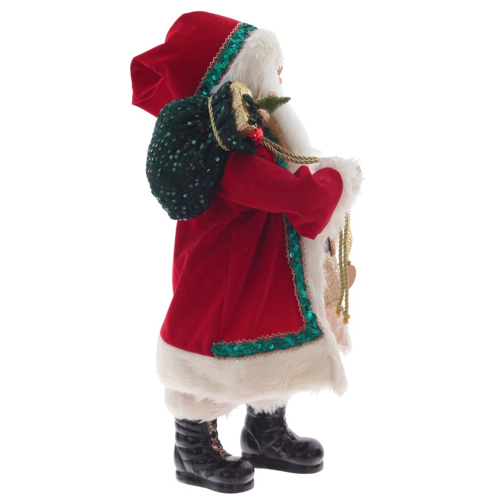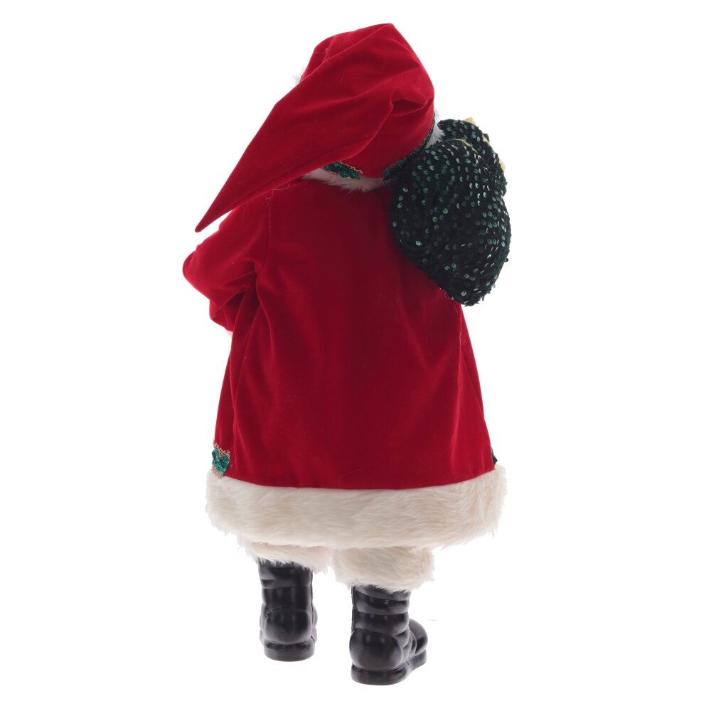 Дед Мороз впечатляет своим размером 34x28x92 см и детализацией. От костюма из красного бархата до выразительного лица - каждая деталь проработана великолепно. Из полимерных материалов выполнены лицо, руки и сапоги, придающие образу реализм. В руках у Деда Мороза мешок с подарками и даже часы на цепочке.