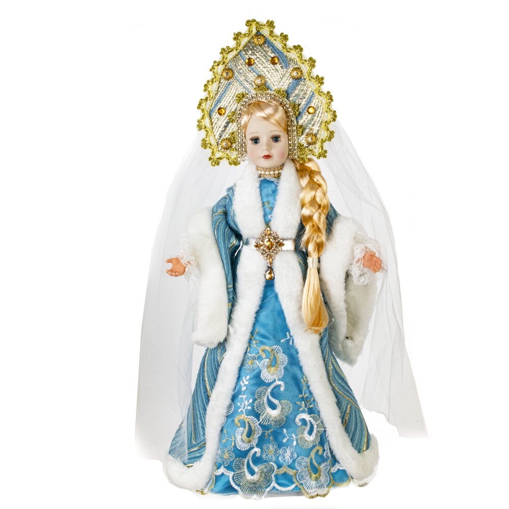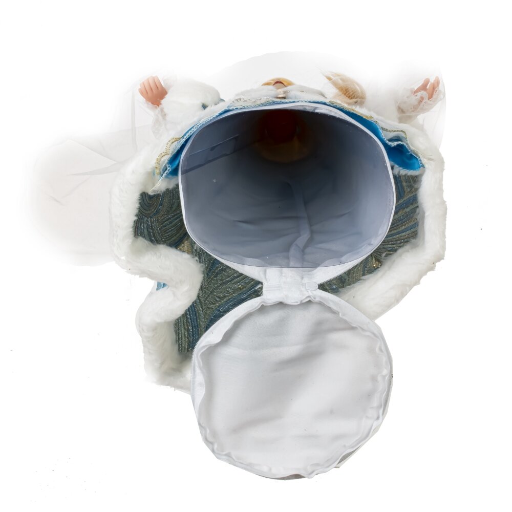 Снегурочка с ёмкостью для конфет — это невероятно красивая декоративная кукла высотой 53 см. Её изящное лицо и кисти рук выполнены из полимерных материалов. Она облачена в роскошный голубой наряд с меховой отделкой, украшенной золотыми деталями. На голове Снегурочки кокошник с фатой, а длинная светлая коса добавляет её образу очарования. Под платьем находится ёмкость для конфет, что делает эту куклу прекрасным подарком для маленьких и больших любителей сладостей.