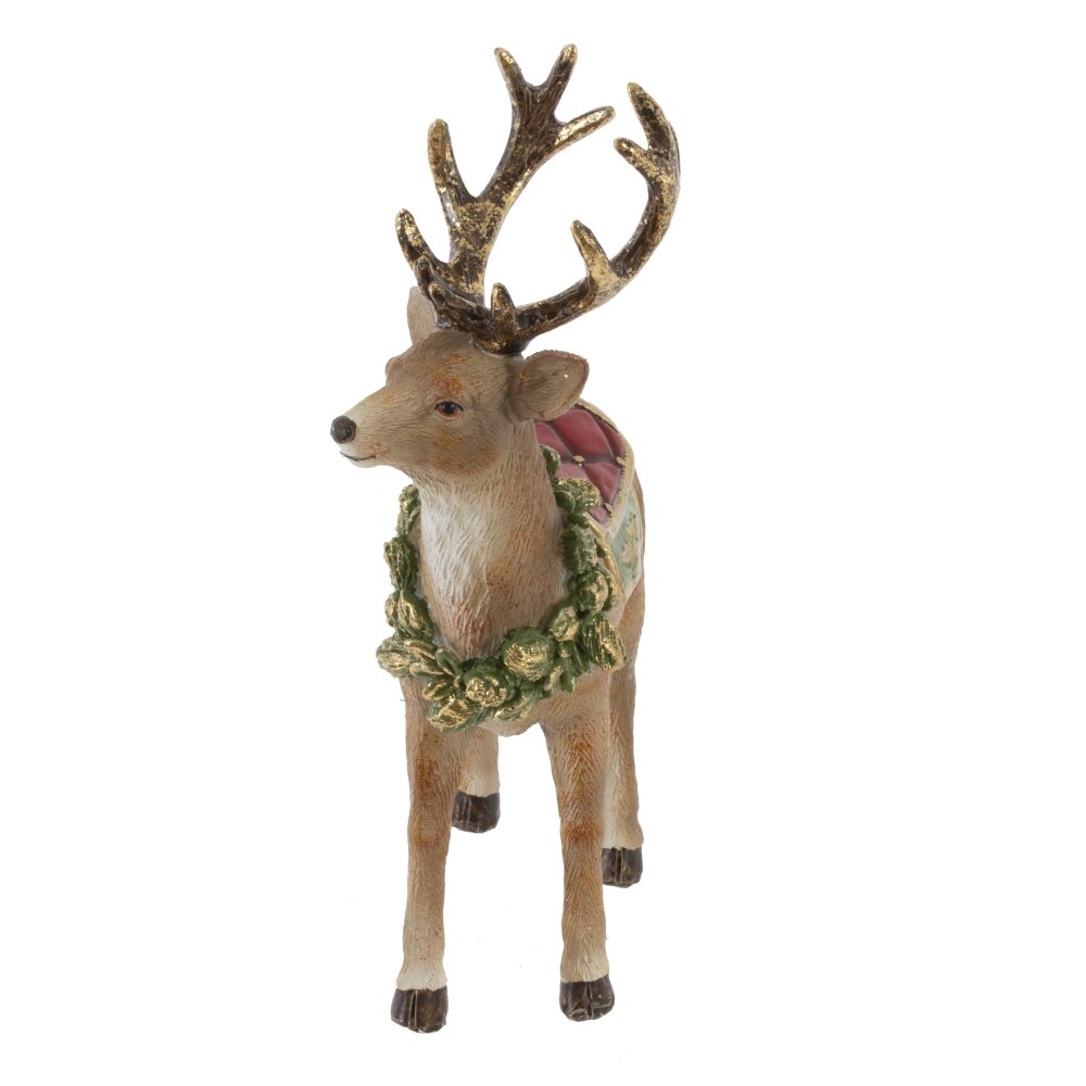 Фигурка декоративная "Олень" — это великолепное новогоднее украшение, выполненное из полимерного материала. Этот грациозный и реалистичный олень поражает своим очарованием. Он украшен новогодним венком и ярким седлом, что придает ему особый праздничный вид. Красивые рога оленя добавляют ему мощи и изящества. Эта новогодняя статуэтка станет идеальным акцентом в вашем интерьере, создавая уютную и праздничную атмосферу. Подарите себе и своим близким ощущение волшебства с этой стильной фигуркой!