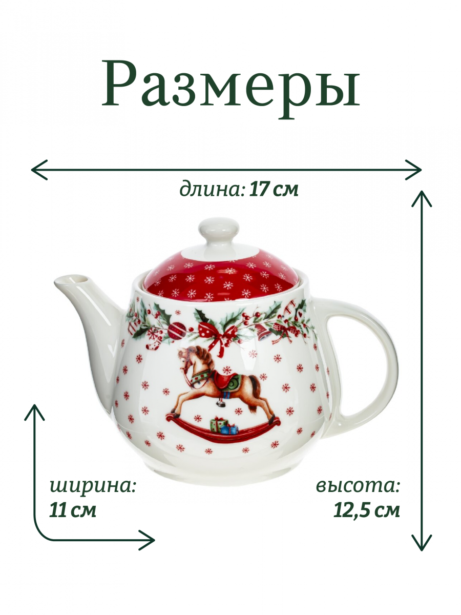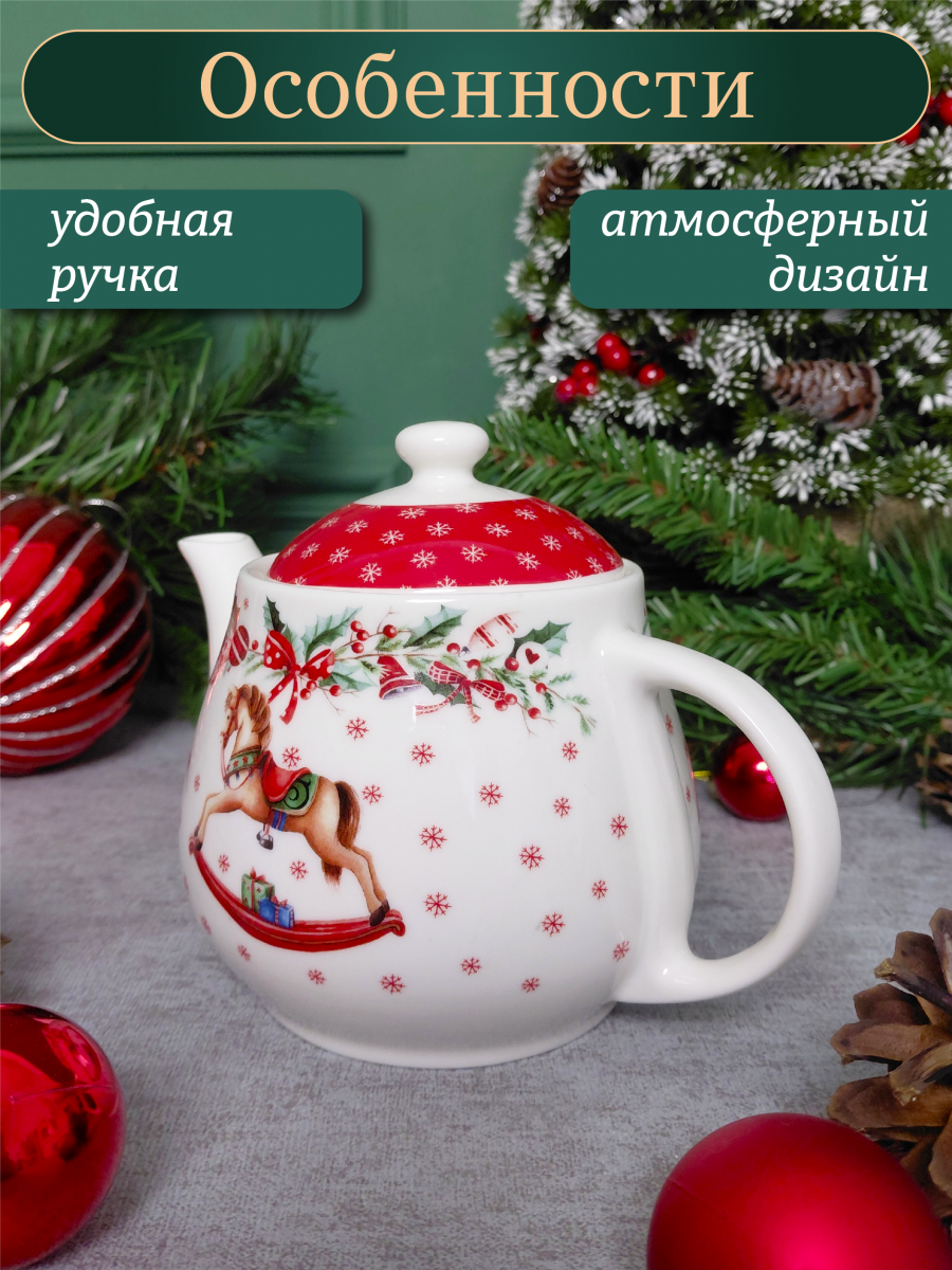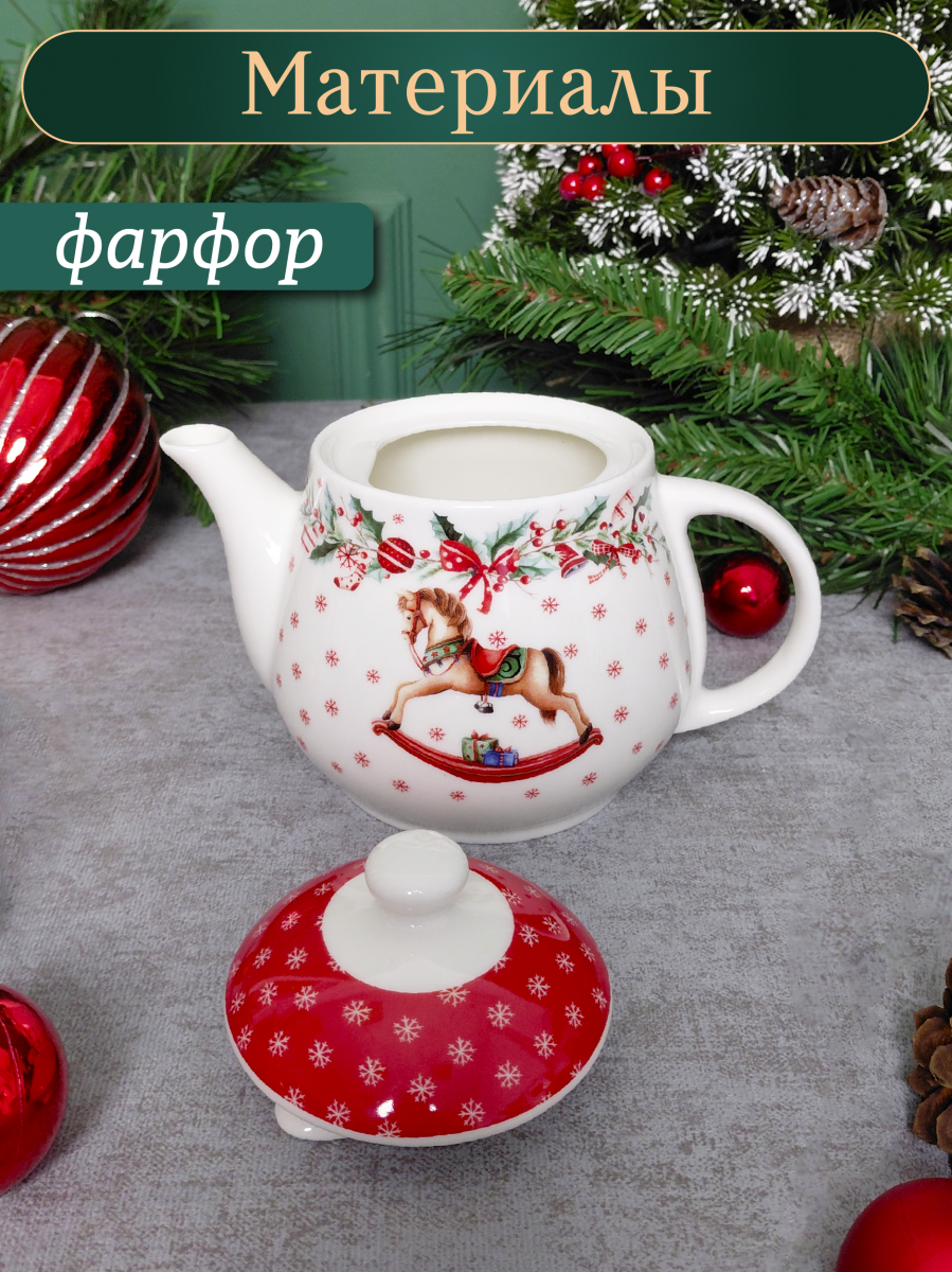 Чайник заварочный объемом 700мл, изготовлен из высококачественного фарфора. Его размеры: длина - 17 см (с ручкой и носиком) и 13,5 (без ручки, но с носиком), ширина - 11 см, высота - 12,5 см (с крышкой) и 9,5 см (до крышки), диаметр горлышка - 6 см, длина носика - 3,5 см. Чайник выполнен в белом цвете с красной крышкой, а на его боку изображёна лошадка с рождественским венкомЭтот новогодний чайник привнесет в ваш дом атмосферу волшебства и праздника! Яркие изображения придают ему особый шарм. Фарфор, из которой выполнено изделие, обеспечивает прочность и долговечность. Этот прекрасный предмет добавит торжественности и настроения на ваш новогодний стол и станет незаменимым атрибутом вашего праздника Носик чайничка БЕЗ сеточки. Такой интересный дизайн, несомненно, придется по вкусу тем, кто ценит красоту и изящество. Чайник можно использовать для детского чаепития, на новогодний утренник. Этот милый кувшинчик порадует и взрослых и детей. Заварочный чайник украсит любую чайную церемонию и послужит отличным подарком на любой праздник