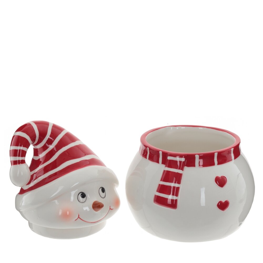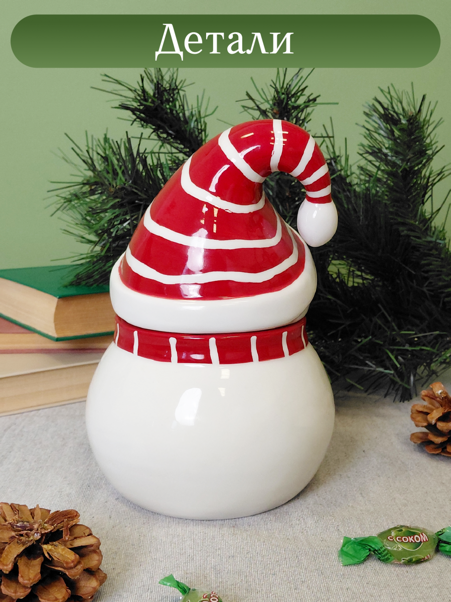 Керамическая емкость выполнена в виде снеговика с милой мордашкой. Она украсит новогоднюю сервировку стола и непременно поднимет настроение гостям.