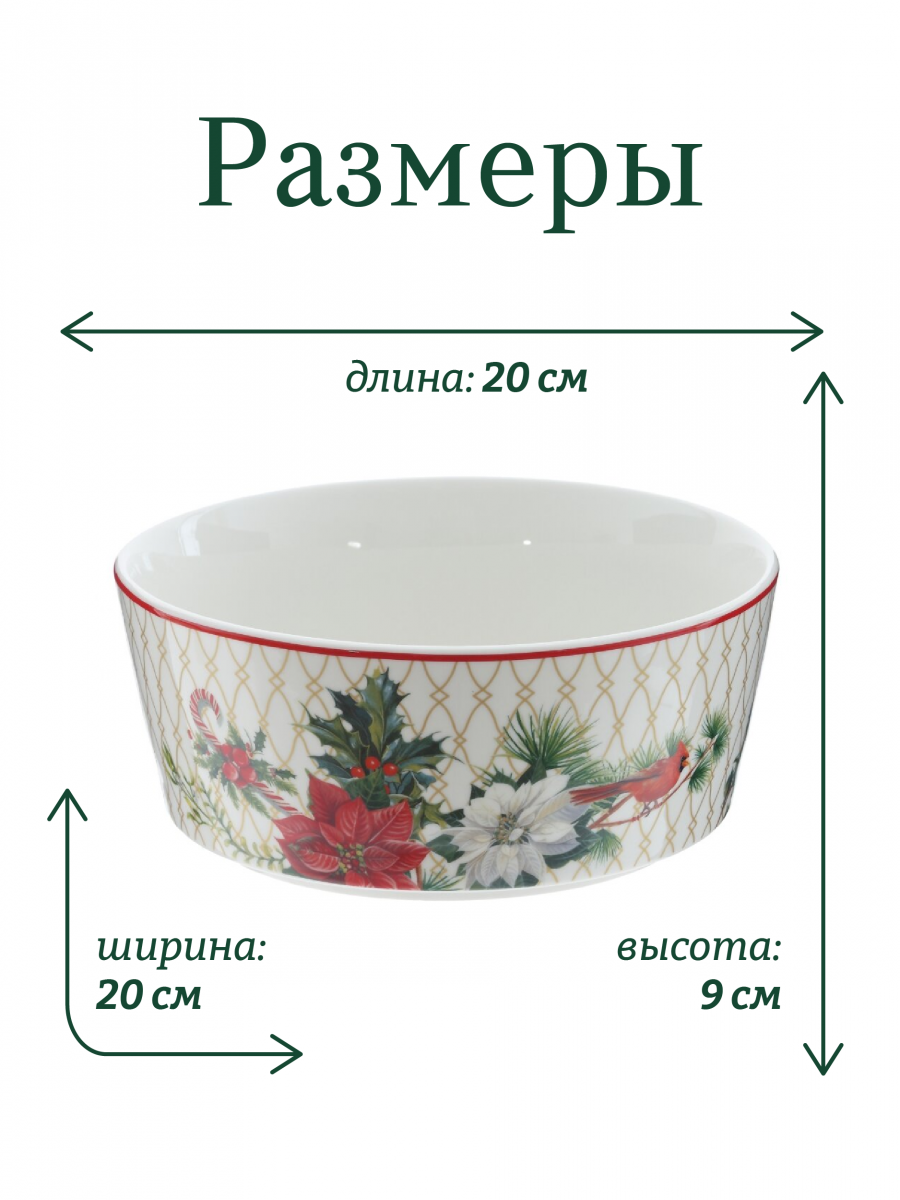 Салатник "Зимнее волшебство" с диаметром 20 см и высотой 8 см, выполненный из тонкостенного фарфора, станет великолепным дополнением к любому новогоднему столу. Его изящный золотой сетчатый узор придаёт атмосфере изысканность и роскошь, а праздничные элементы, такие как новогодние ветви, ягоды и красная птичка-кардинал, создают особое очарование и новогоднее настроение. На дне салатника изображены яркие цветы пуансеттии, которые символизируют Рождество. Уникальный дизайн этого салатника делает его не только эффектным элементом сервировки, но и замечательным подарком для ценителей красоты и необычных вещей.