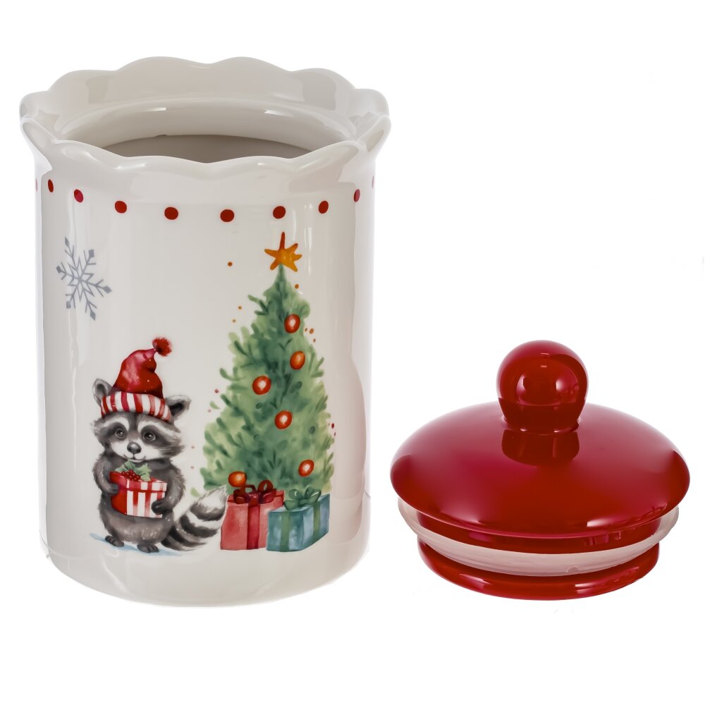 Ёмкость для сыпучих продуктов "Новогодний подарок" вместимостью 850 мл, изготовленная из керамики, украшена рисунком милого енота с подарками и елочкой. Крышка красного цвета с ручкой оснащена силиконовым уплотнителем. Подойдет для хранения чая, кофе или сахара, а также может стать хорошим подарком для близких в новогодние праздники.