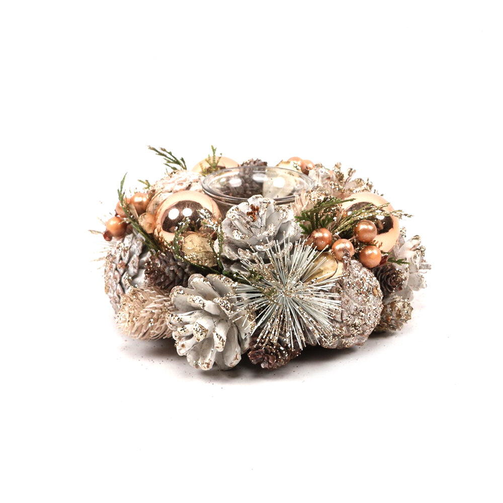 Подсвечник из натуральных шишек на одну свечу. Декорирован элементами из искусственных еловых веток с украшениями из пластика ( ягоды, шарики, листья). Превосходное новогоднее украшение интерьера.