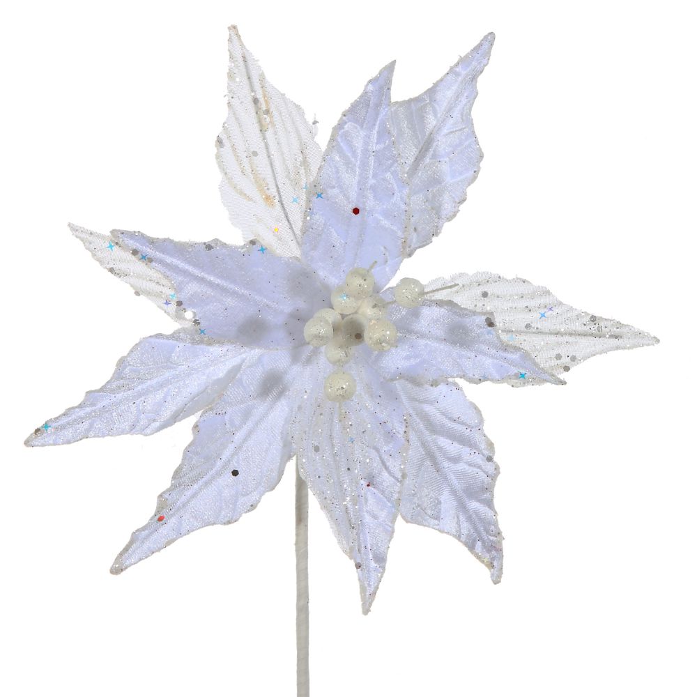 Искусственная пуансеттия смотрится очень волнующе, а усыпанные мелкими блестками лепестки сияют и переливаются от светящихся огоньков новогодней елки.