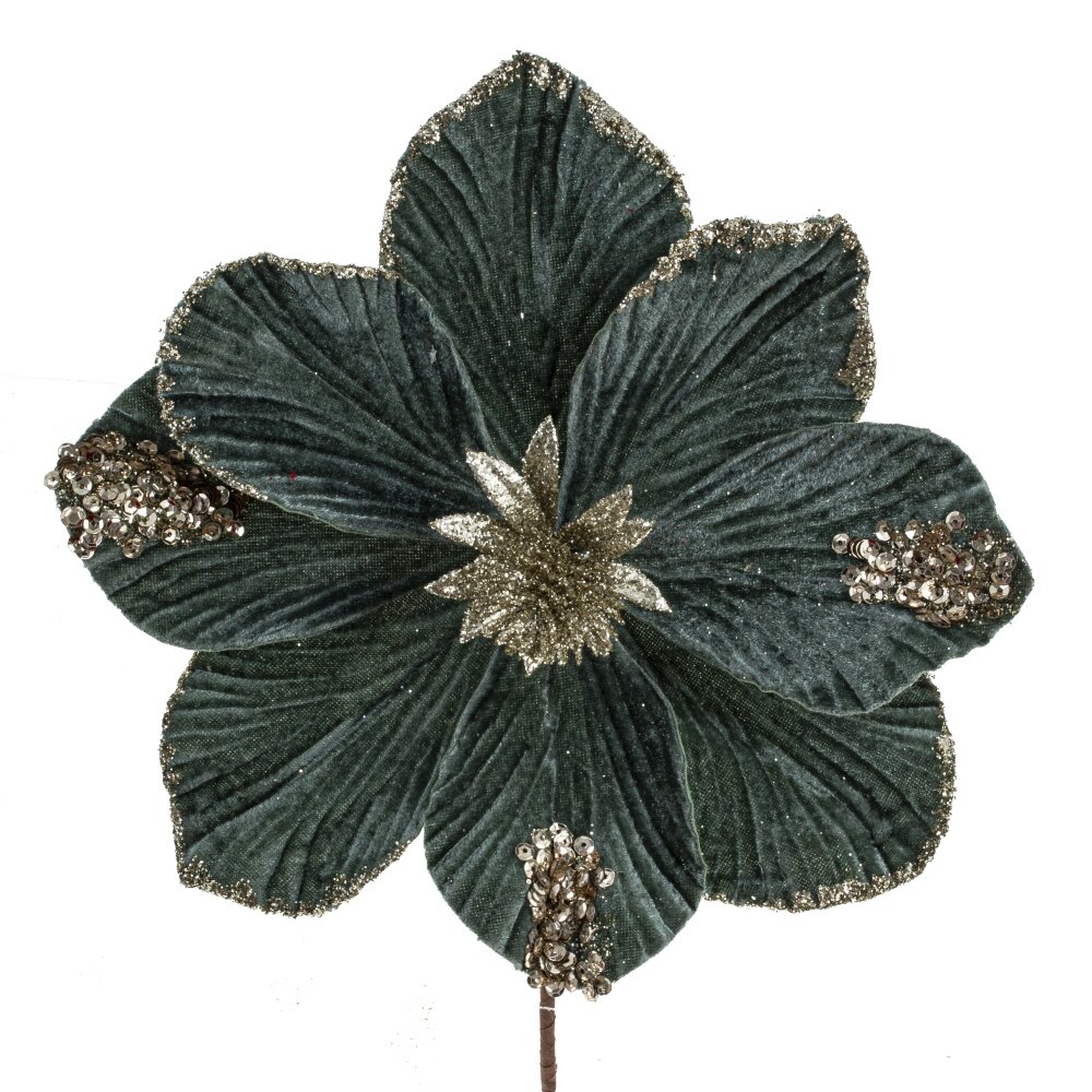 Прекрасный цветок из бархатистой ткани - это великолепное украшение для новогодней ели. Цветок украшен глиттером, который придает ему искрящийся блеск, дополняя праздничную атмосферу.