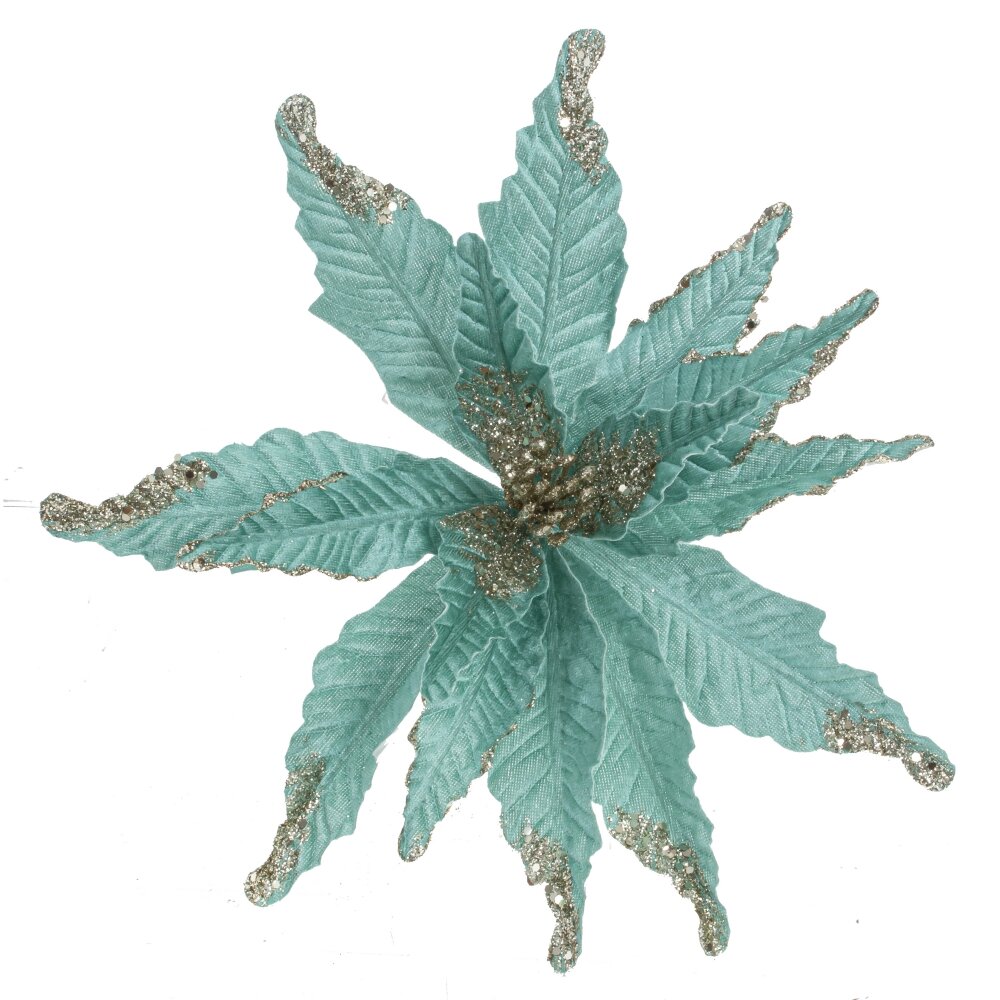 Искусственная пуансеттия смотрится очень волнующе, а усыпанные мелкими блестками лепестки сияют и переливаются от светящихся огоньков новогодней елки.