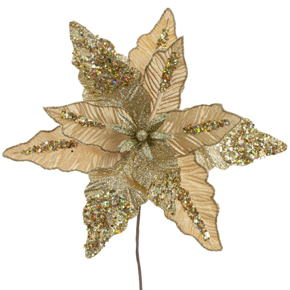 Прекрасный цветок из бархатистой ткани - это великолепное украшение для новогодней ели. Цветок украшен глиттером и пайетками, которые придают ему искрящийся блеск, дополняя праздничную атмосферу.