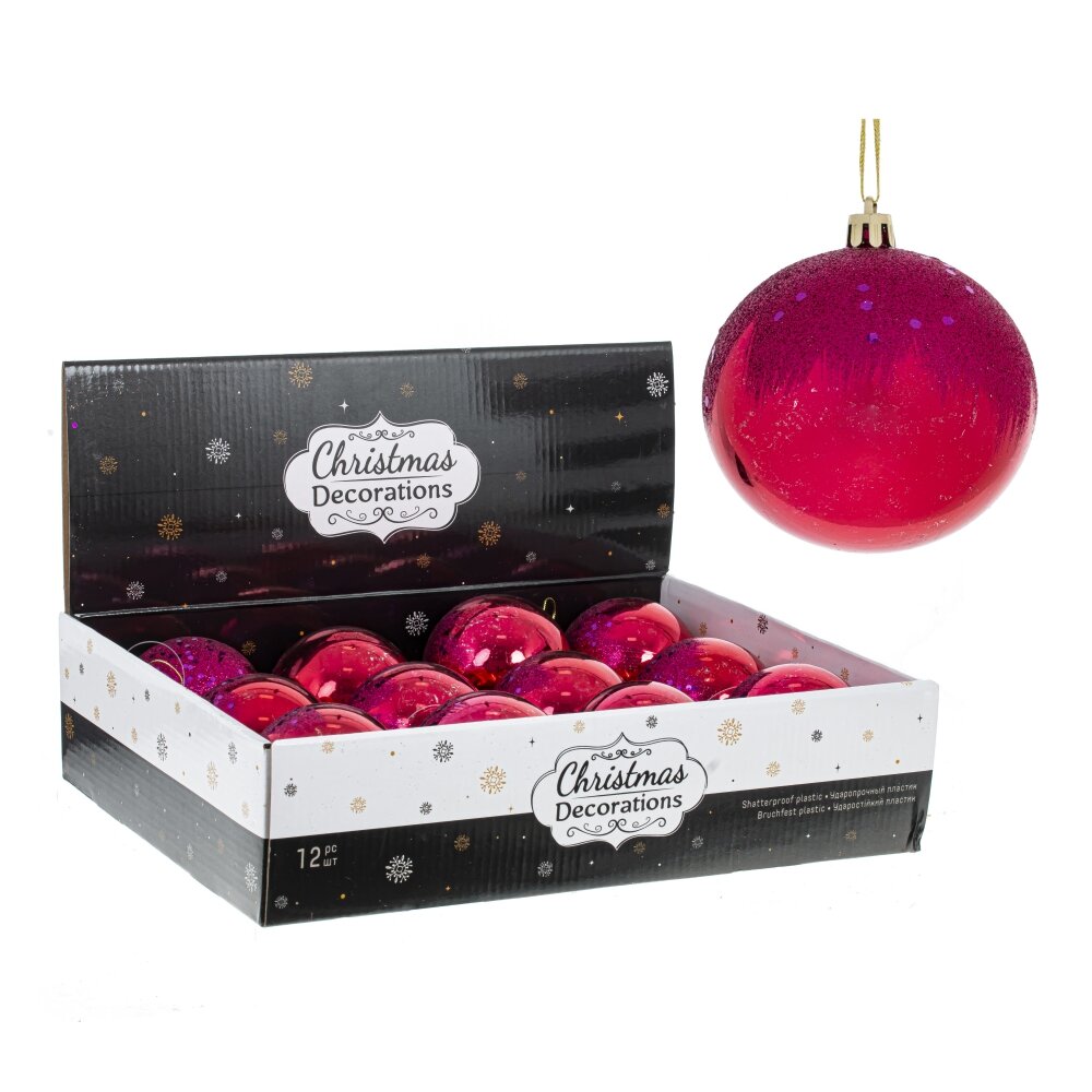 Набор из 12-ти шаров для елки в шоу-боксе. Эти новогодние шары из пластика, непременно, порадуют вас своим изяществом и прекрасно дополнят праздничный наряд лесной красавицы.