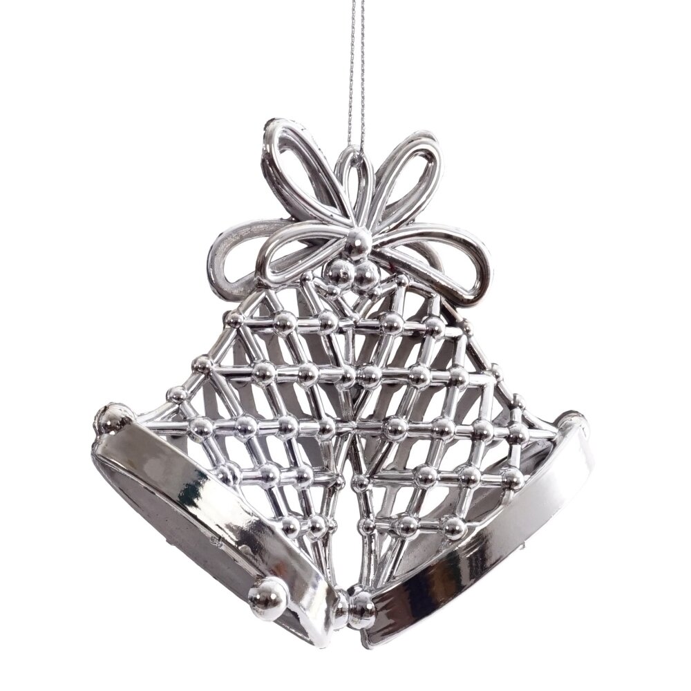 Новогоднее украшение «Колокольчик» выполнено из лёгкого полимера в изящном серебряном цвете. Представляет собой пару связанных между собой колокольчиков с полой внутренней частью и сетчатыми стенками, создающими воздушный и лёгкий эффект. Это элегантное украшение добавит блеска и праздничного настроения вашему интерьеру, подчёркивая изящество и утончённость новогоднего декора.