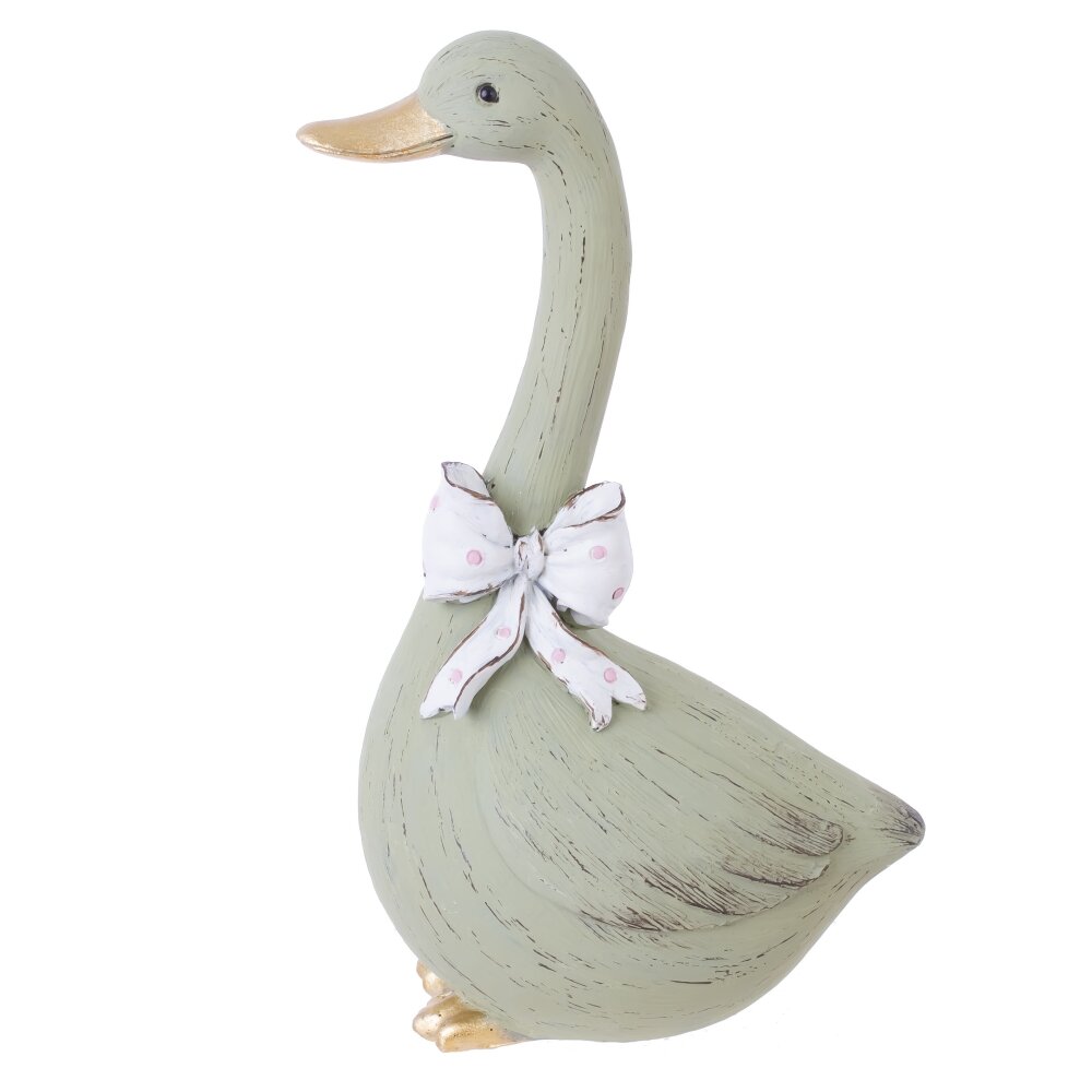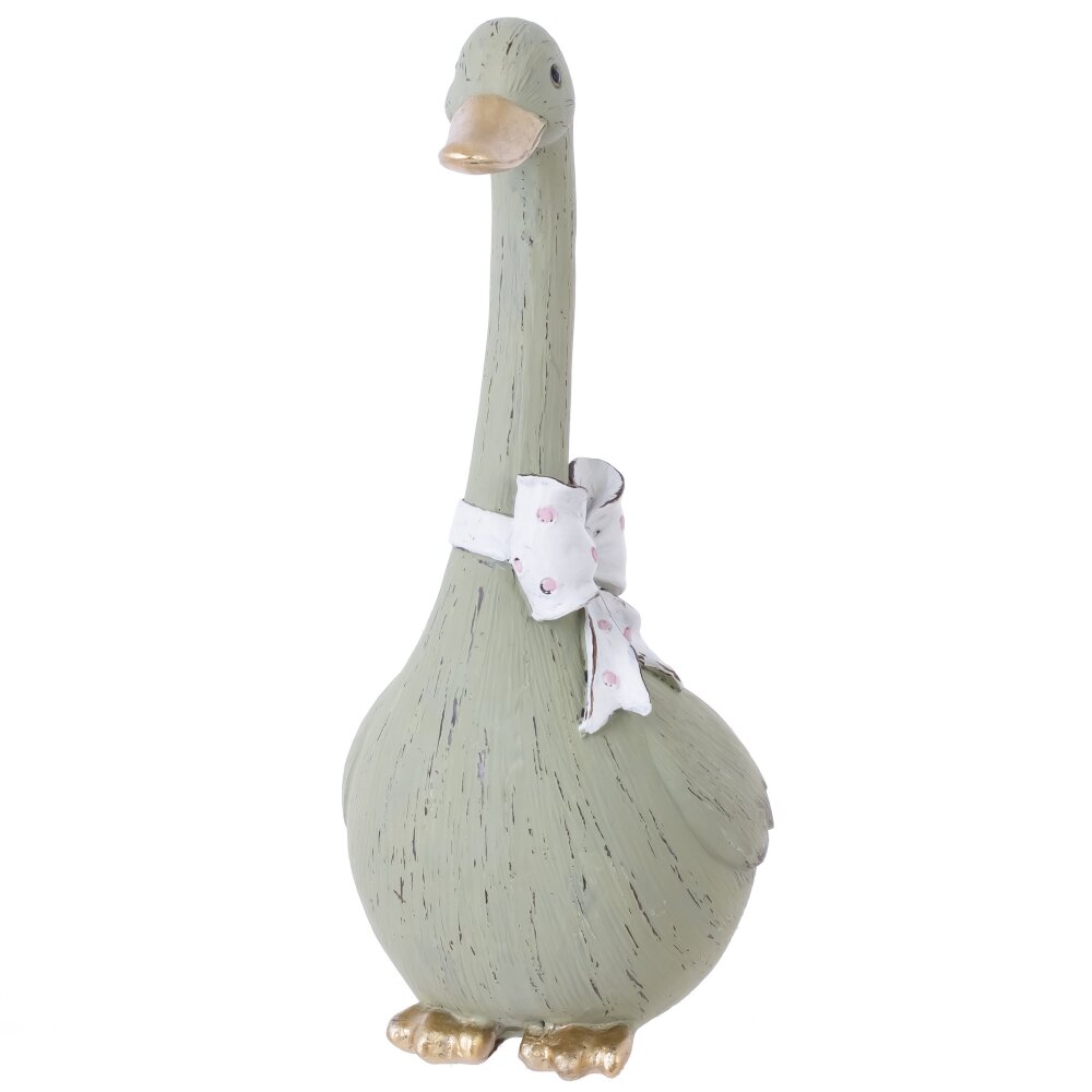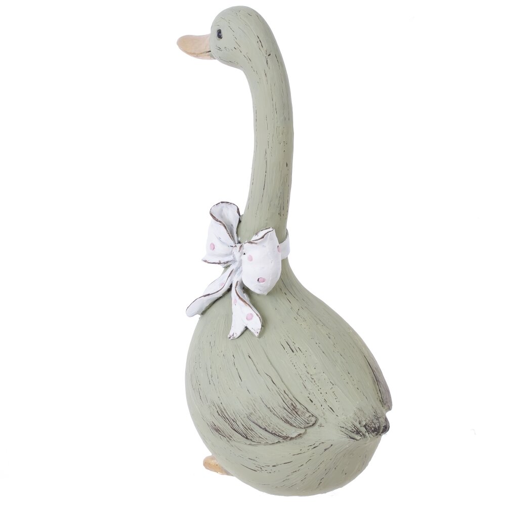 Декоративная фигурка «Гусь» станет очаровательным акцентом в вашем интерьере. Изделие выполнено из прочных полимерных материалов и окрашено в мягкий пастельно?зелёный оттенок с лёгким эффектом потертости, что придаёт ему винтажный шарм. Изогнутая шея и плавные линии корпуса передают грациозный силуэт птицы, а аккуратный белый бантик с розовыми горошками добавляет фигурке игривости и уюта. Такой гусь прекрасно впишется в интерьер в стиле прованс, кантри или shabby chic, украсит полку, каминную зону, подоконник или детскую комнату. Подойдёт как небольшое, но запоминающееся дополнение к подарку на новоселье, день рождения или семейный праздник.