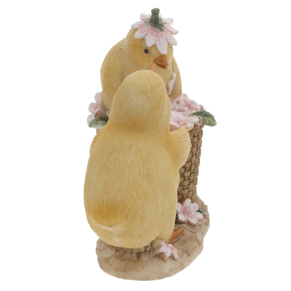 Декоративная фигурка в виде Цыплят станет трогательным акцентом весеннего и праздничного декора в Вашем доме. Размер декоративной фигурки: длина 9 см, ширина 4,5 см, высота 9 см. Один милый желтый цыпленок выглядывает из плетёной корзинки, полной розовых цветов, другой тянется к нему, создавая трогательную сцену заботы и дружбы. Мелкая проработка перышек, лепестков и корзинки делает композицию особенно выразительной. Фигурка выполнена из прочного полимерного материала, устойчива и легко очищается от пыли. Интерьерная фигурка идеальна для украшения пасхального стола, подоконника, детской комнаты или подарка близким. Пасхальная фигурка создаёт атмосферу уюта и весеннего настроения, подходит для любого стиля интерьера. Независимо от места размещения, она принесёт радость и эстетическое удовольствие, украшая интерьер своим очаровательным образом. Декоративная статуэтка может стать замечательным подарком для детей и взрослых, поддерживая дух веселья и невидимой связи с традициями. Такой подарок обязательно порадует любого, кто любит красивые и нежн