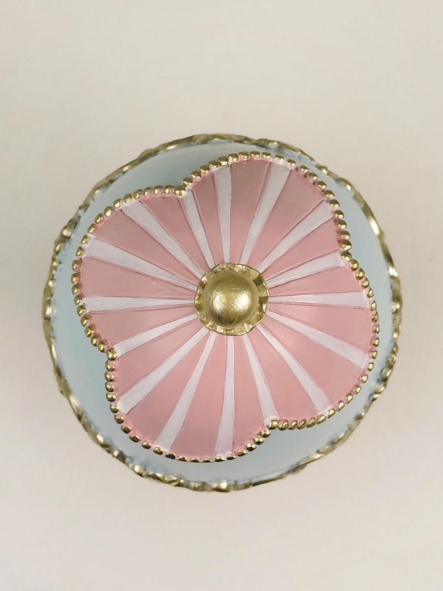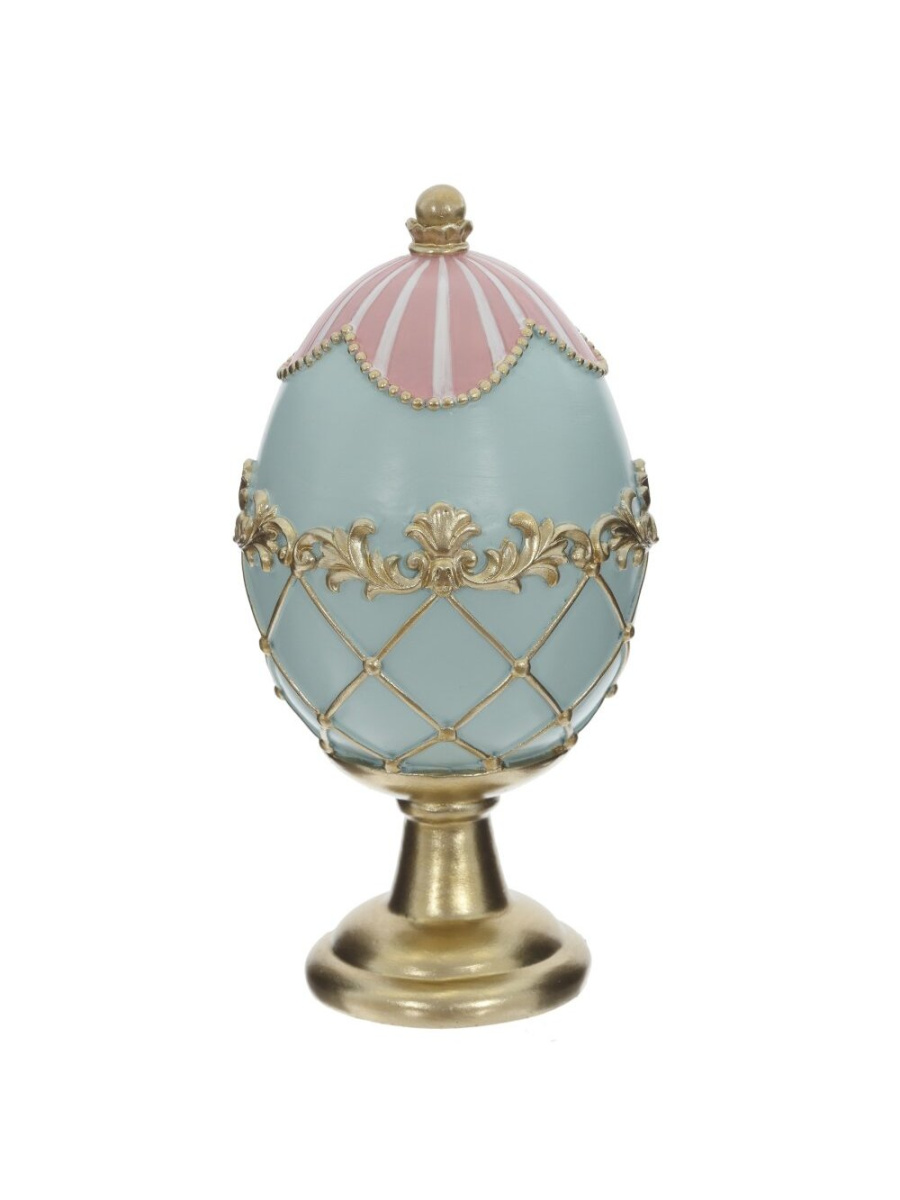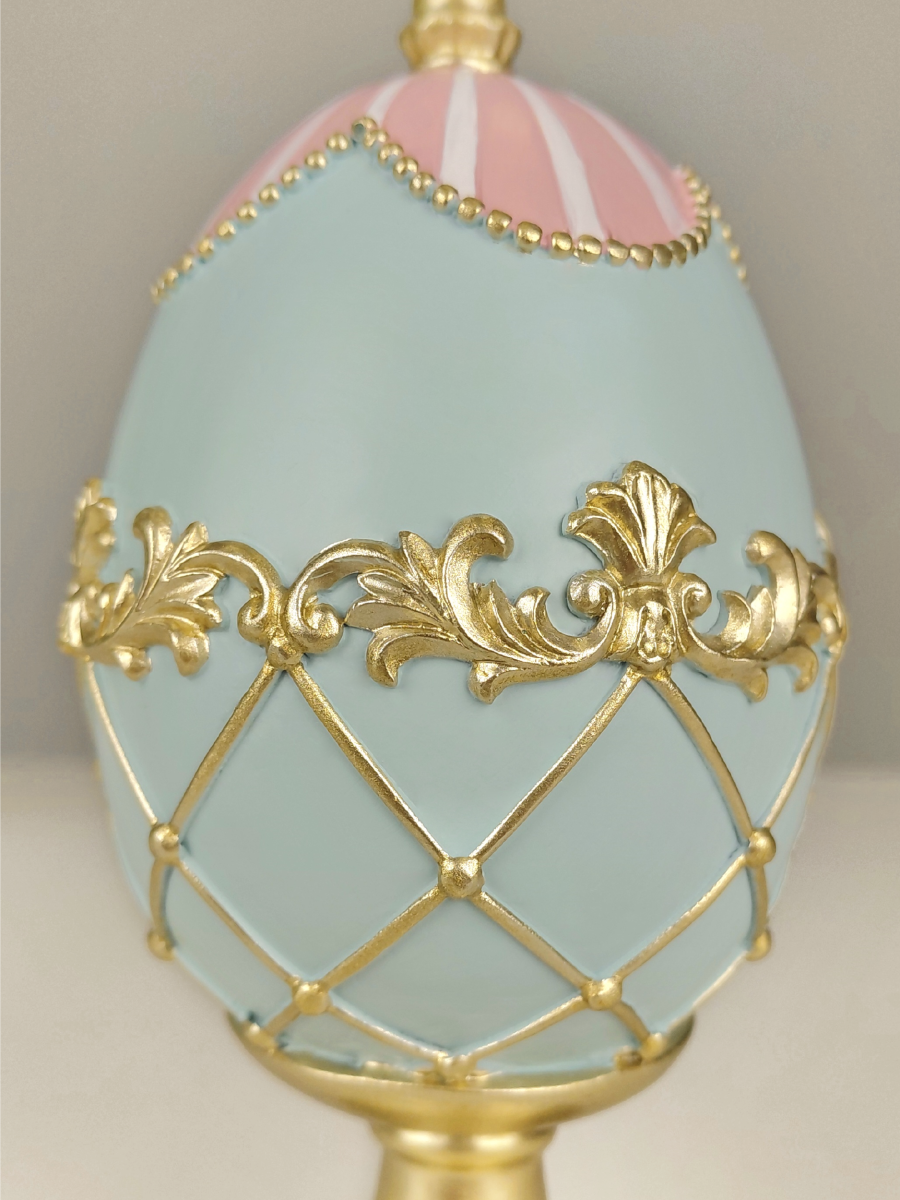 Элегантная пасхальная фигурка в форме декоративного яйца на подставке станет ярким акцентом вашего праздничного интерьера. Размер декоративной фигурки: высота 15 см, ширина 7 см, длина 7 см. Изделие выполнено из прочных полимерных материалов, выдержанных в нежных пастельных тонах. Верхняя часть пасхального яйца оформлена розово-белыми полосами, основа — в мягком мятном цвете. Золотистый декор с изящным растительным орнаментом и «решёткой» придаёт фигурке стиль в духе знаменитых ювелирных пасхальных яиц.