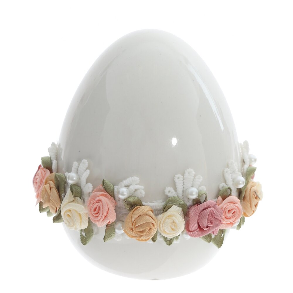 Изящная пасхальная фигурка в форме яйца, выполненная из гладкого белого фарфора, станет утонченным акцентом праздничного декора. Размер декоративной фигурки: диаметр 9 см, высота 10 см. Центральную часть изделия опоясывает декоративный венок из миниатюрных текстильных розочек нежных пастельных оттенков – кремового, персикового, розового. Цветы дополнены зелёными листочками и аккуратными жемчужными бусинами, создающими ощущение легкости и весенней свежести. Фигурка гармонично смотрится на сервированном столе, на полке, в композиции с свечами и другими пасхальными украшениями. Идеально подходит в качестве красивого сувенира к светлому празднику Пасхи или дополнения к подарку близким.