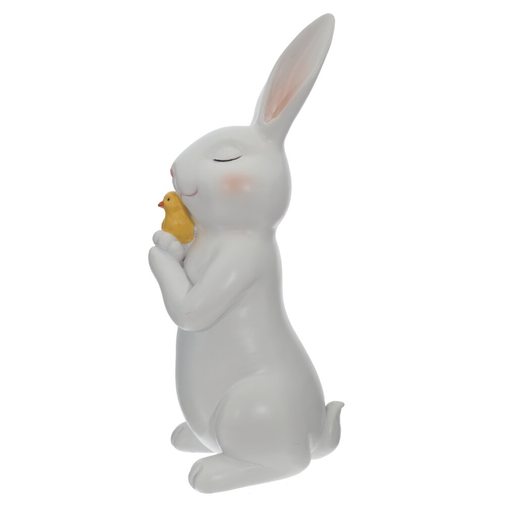 Декоративная пасхальная фигурка из полимерных материалов в виде белого кролика, нежно прижимающего к груди желтого цыпленка. Трогательное выражение мордочки, румянец на щечках и аккуратно прорисованные детали придают украшению особое очарование и создают атмосферу тепла и уюта. Фигурка станет ярким акцентом пасхной композиции: её можно поставить на праздничный стол, подоконник, полку или в детской комнате. Легкий и прочный материал устойчив к повреждениям и прост в уходе, поэтому украшение будет радовать вас не один сезон. Отличный вариант для подарка к Пасхе друзьям и близким.