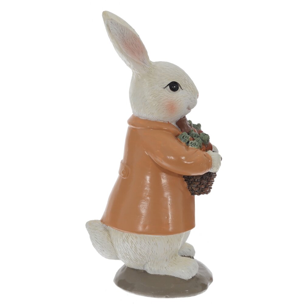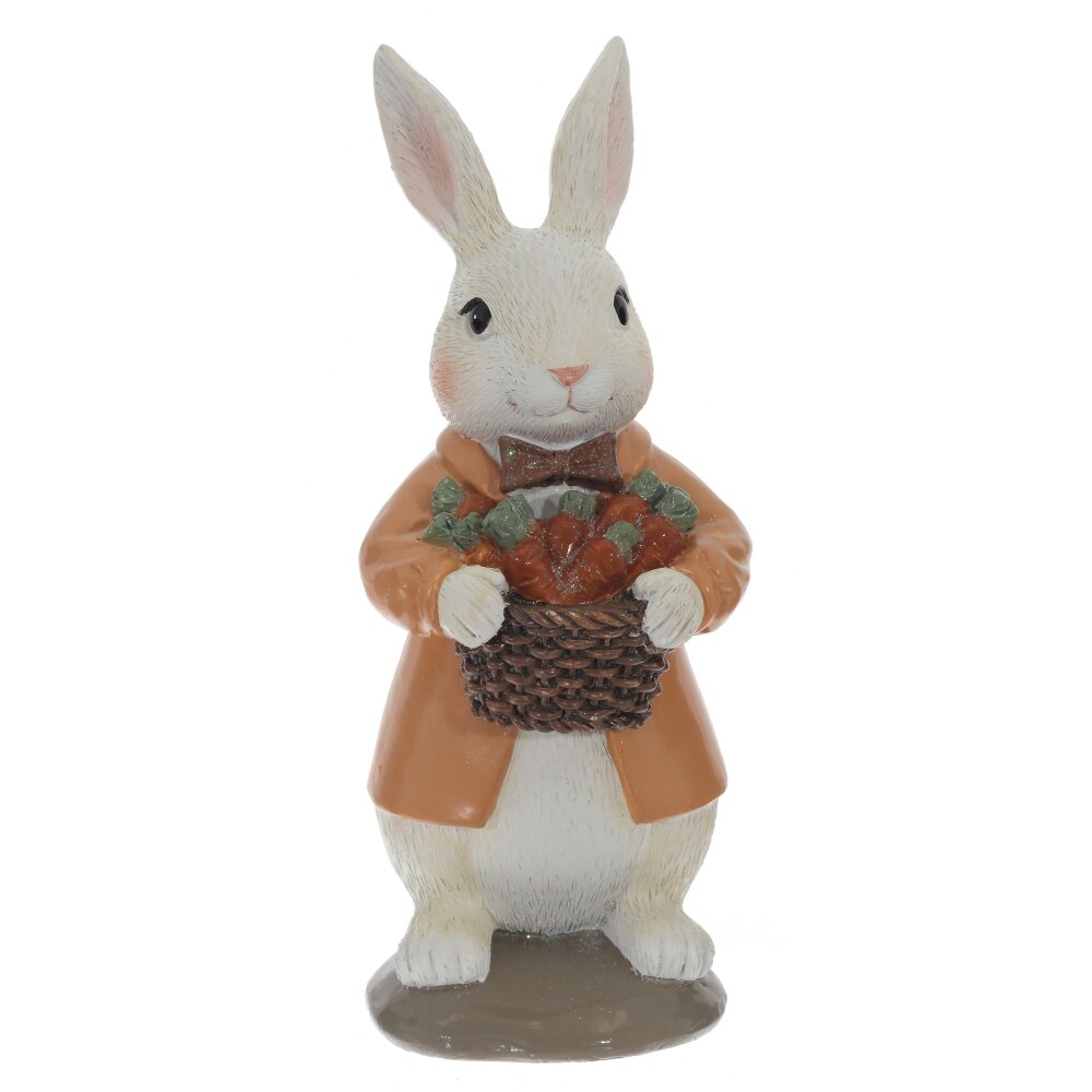 Декоративная фигурка в виде Пасхального кролика с цветами станет трогательным украшением вашего дома к светлому весеннему празднику. Размеры фигурки составляют: длина 7 см, ширина 8 см и высота 17,5 см, что делает ее идеальным украшением для любой полки или стола. Милый белый кролик в светло-коричневом пальто и бабочке держит плетёную корзинку, наполненную яркими морковками. Тщательно проработанные детали мордочки, ушек и одежды создают ощущение ручной работы и придают изделию особое очарование. Фигурка гармонично смотрится на праздничном столе, подоконнике, каминной полке или в детской комнате, сочетается с живыми цветами, свечами и другими пасхальными украшениями. Подойдёт в качестве оригинального подарка к Пасхе, а также как приятный сувенир для коллекционеров декоративных статуэток. Декоративная фигурка подойдёт в подарок на 8 марта или день рождения. Зайчик порадует детей и взрослых, гармонично впишется в интерьер в стиле прованс или шебби-шик, добавляя дому оригинальности и весеннего настроения.