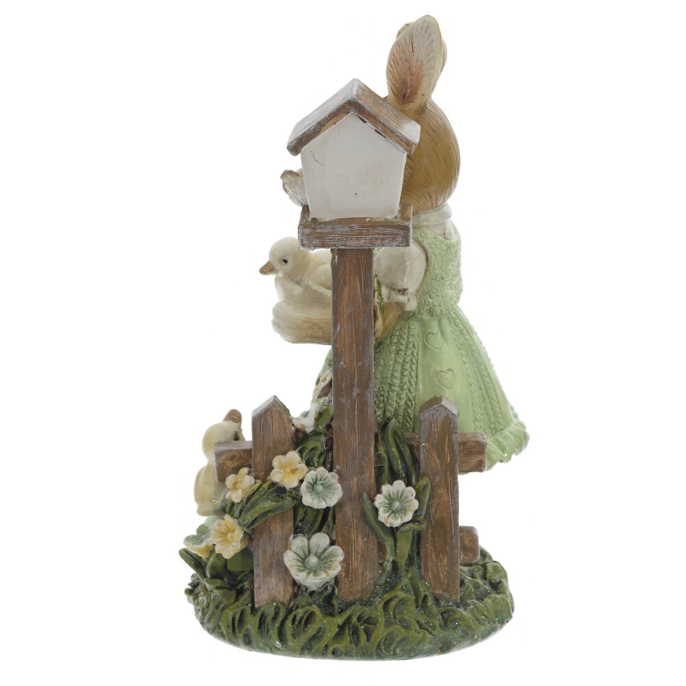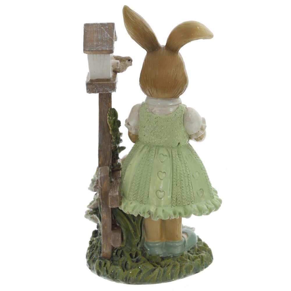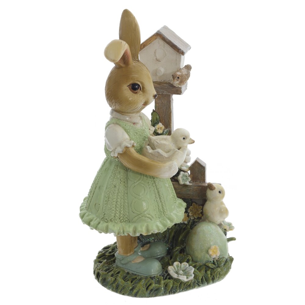 Декоративная фигурка в виде милой зайчихи в зелёном платье создаст в доме атмосферу весеннего праздника и уюта. Размер пасхальной фигурки выполненной из полистоуна: высота 15 см, длина 10,5 см, ширина 8 см. Пасхальная композиция изображает милую зайку, которая бережно держит в лапках цыплёнка, у её ног расположился ещё один жёлтый пушистик. Рядом с пасхальным зайчиком размещен деревянный домик для птиц, украшенный нежными цветами. Тщательно проработанные детали, мягкие пастельные оттенки и устойчивое основание делают фигурку эффектным акцентом для сервировки пасхального стола, оформления каминной полки, подоконника или детской. Фигурка выполнена из прочного материала с тщательной проработкой фактуры шерсти и перьев, выглядит как миниатюрная сказочная скульптура. Интерьерная фигурка подойдет в качестве милого подарка к Пасхе и весенним праздникам. Фигурка декоративная это милый подарок на день рождения, 8 марта или новый год для детей и взрослых.