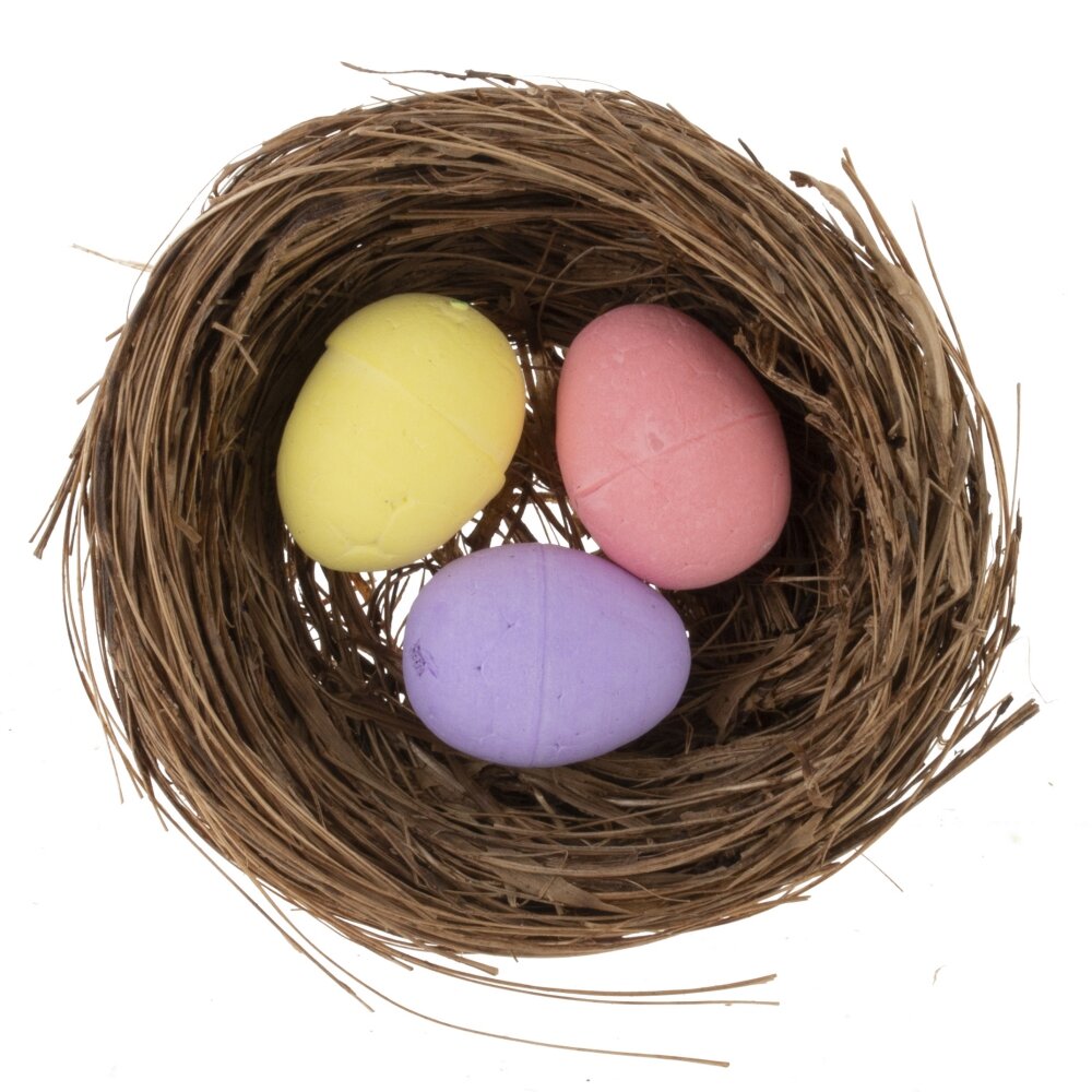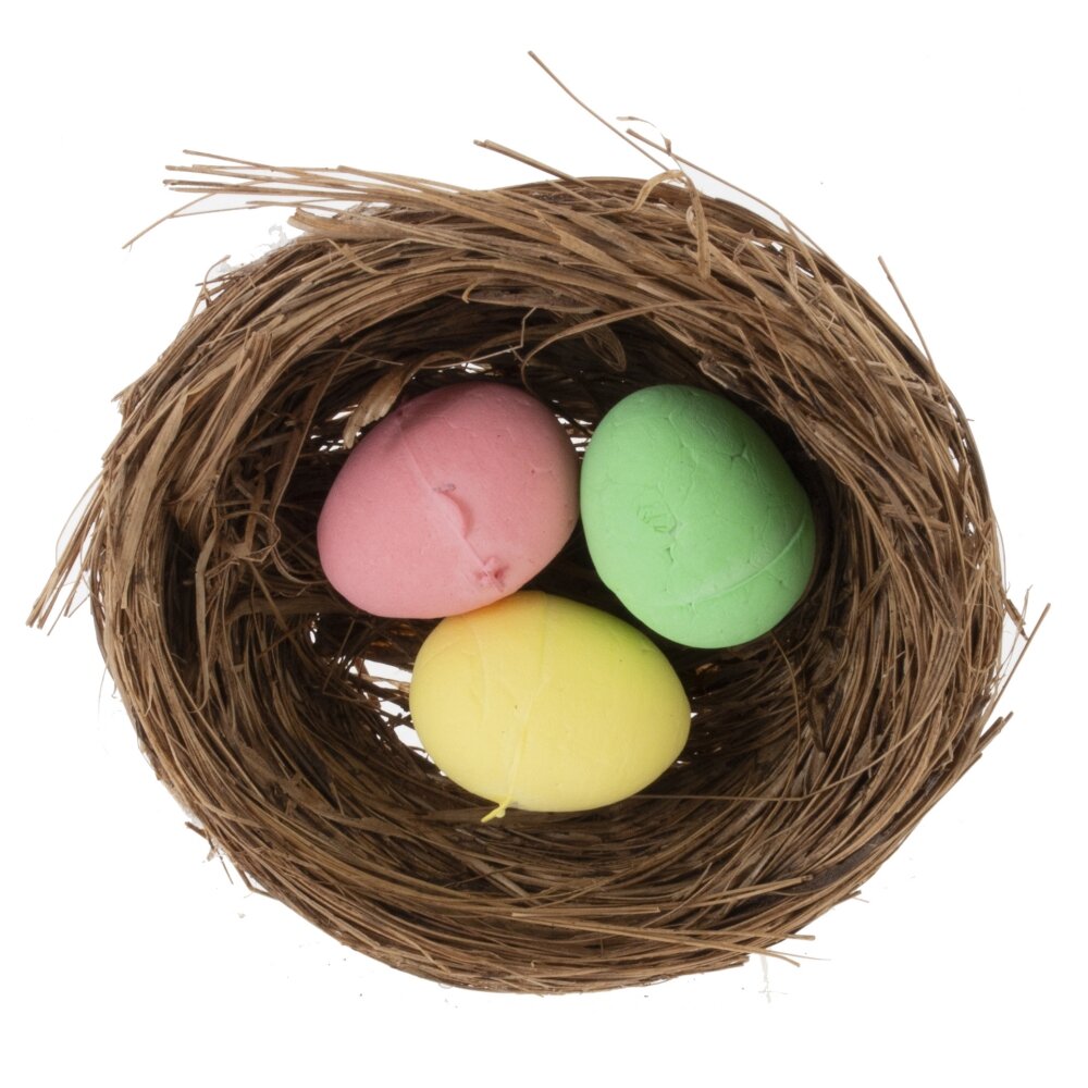 Декоративное изделие «Гнездо пасхальное» — изящный элемент весеннего декора, который создаст атмосферу праздника в доме. Основание выполнено из натуральных материалов, имитирующих настоящие веточки и сухую траву, благодаря чему гнездо выглядит максимально естественно. Внутри расположены три миниатюрных пасхальных яичка из полимерных материалов нежных пастельных оттенков. Композицию можно использовать для сервировки праздничного стола, оформления корзин, витрин, подарков или как самостоятельный акцент в интерьере. Идеально подходит для тематических фотосъёмок и творческих композиций к Пасхе. Представлено в трех вариантах.