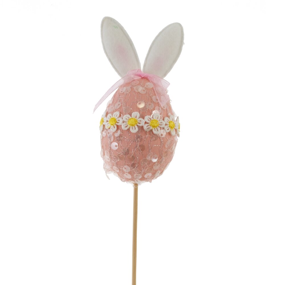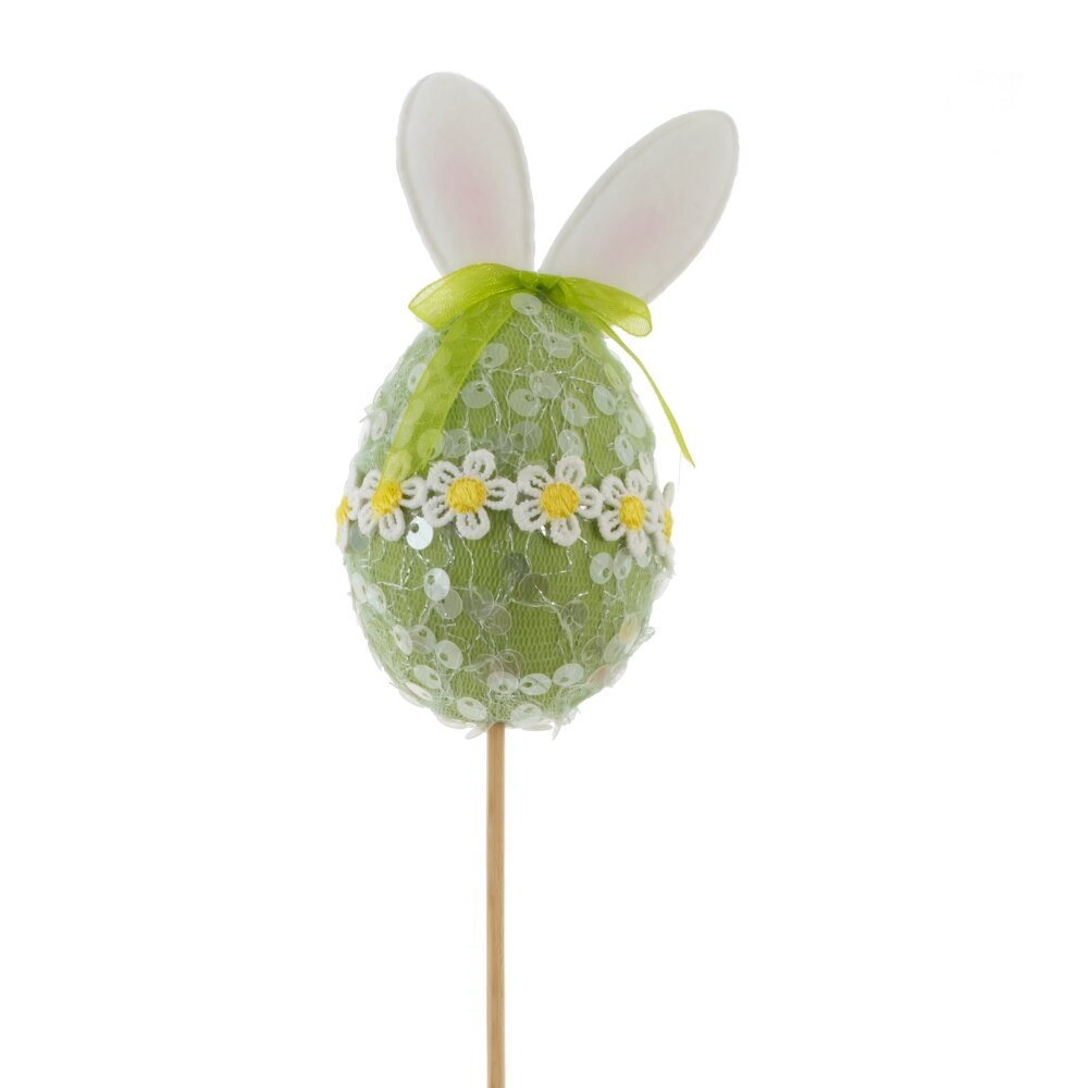 Декоративная вставка «Яйцо» – нежный пасхальный акцент для оформления интерьера и праздничных композиций. Яйцо украшено ажурным текстильным кружевом и декором из миниатюрных ромашек, сверху дополнено ушками зайчика и тонким бантиком из атласной ленты. Изделие закреплено на деревянной палочке, благодаря чему его удобно использовать в цветочных букетах, пасхальных корзинах, композициях в кашпо и вазонах, а также для декорирования подарков и сервировки стола. Полимерные и текстильные материалы отличаются легкостью и сохранением формы, дерево придает устойчивость и натуральный вид.