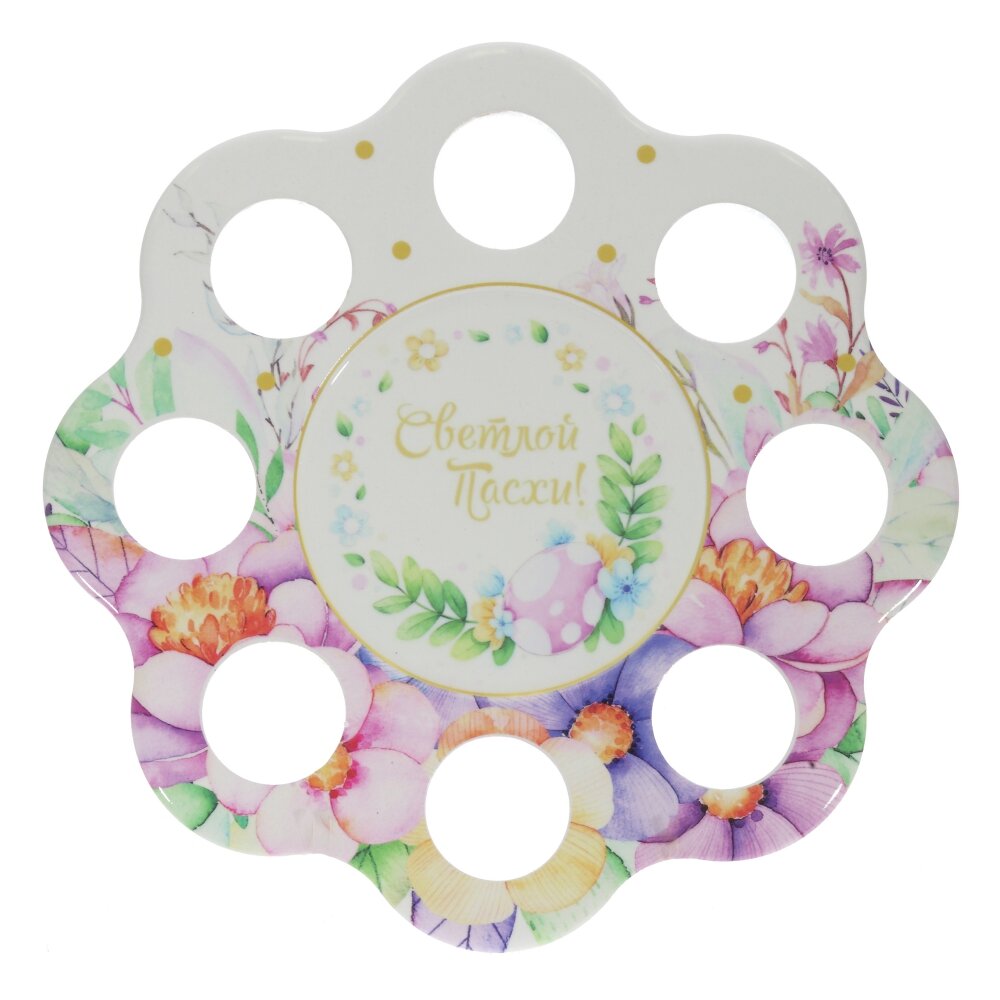 Пасхальная подставка для 8 яиц из прочной керамики – стильное украшение праздничного стола. Изделие выполнено в форме цветка с аккуратными отверстиями для яиц и ярким акварельным рисунком весенних цветов. В центре расположена поздравительная надпись «Светлой Пасхи!». Подставка надёжно фиксирует крашенки, помогает красиво подать угощение и создать тёплую атмосферу праздника. Легко моется, подходит для многолетнего использования и станет приятным пасхальным сувениром для родных и друзей.