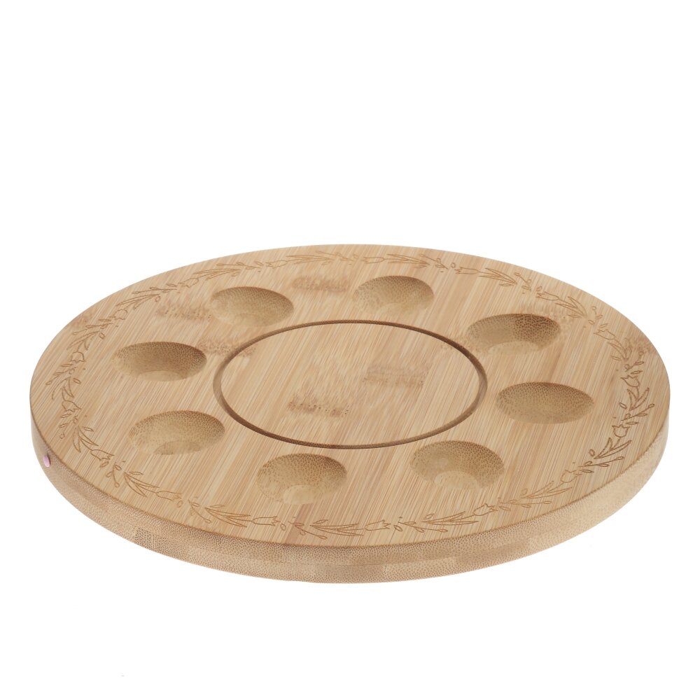 Подставка под яйца - диаметр 24 см, высота 1,5 см. Деревянная подставка для пасхальных яиц на 8 штук – стильный и практичный аксессуар для праздничного стола. Круглая форма с аккуратными углублениями надежно фиксирует яйца и предотвращает их скатывание. В центре предусмотрено отдельное круглое место для пасхального кулича, свечи или небольшой композиции. Изготовлена из прочного, экологичного бамбука с красивой натуральной текстурой и декоративной гравировкой по краю. Такая подставка подчеркнёт атмосферу Пасхи, подойдёт для сервировки дома, в гостях или на фото, а в остальное время может использоваться как оригинальное блюдо для подачи закусок. Стильный, практичный и долговечный пасхальный декор, подчеркнёт заботу о деталях и станет прекрасным подарком к Пасхе. Пасхальную тарелку можно преподнести в качестве подарка на день рождения и любой другой праздник.