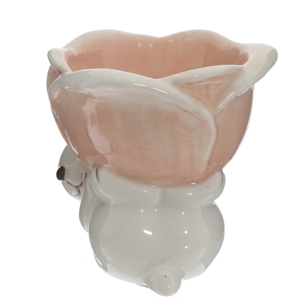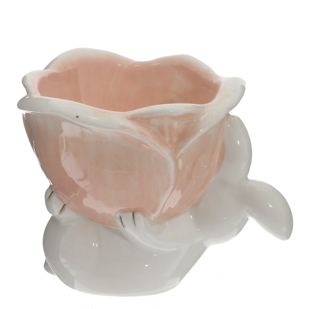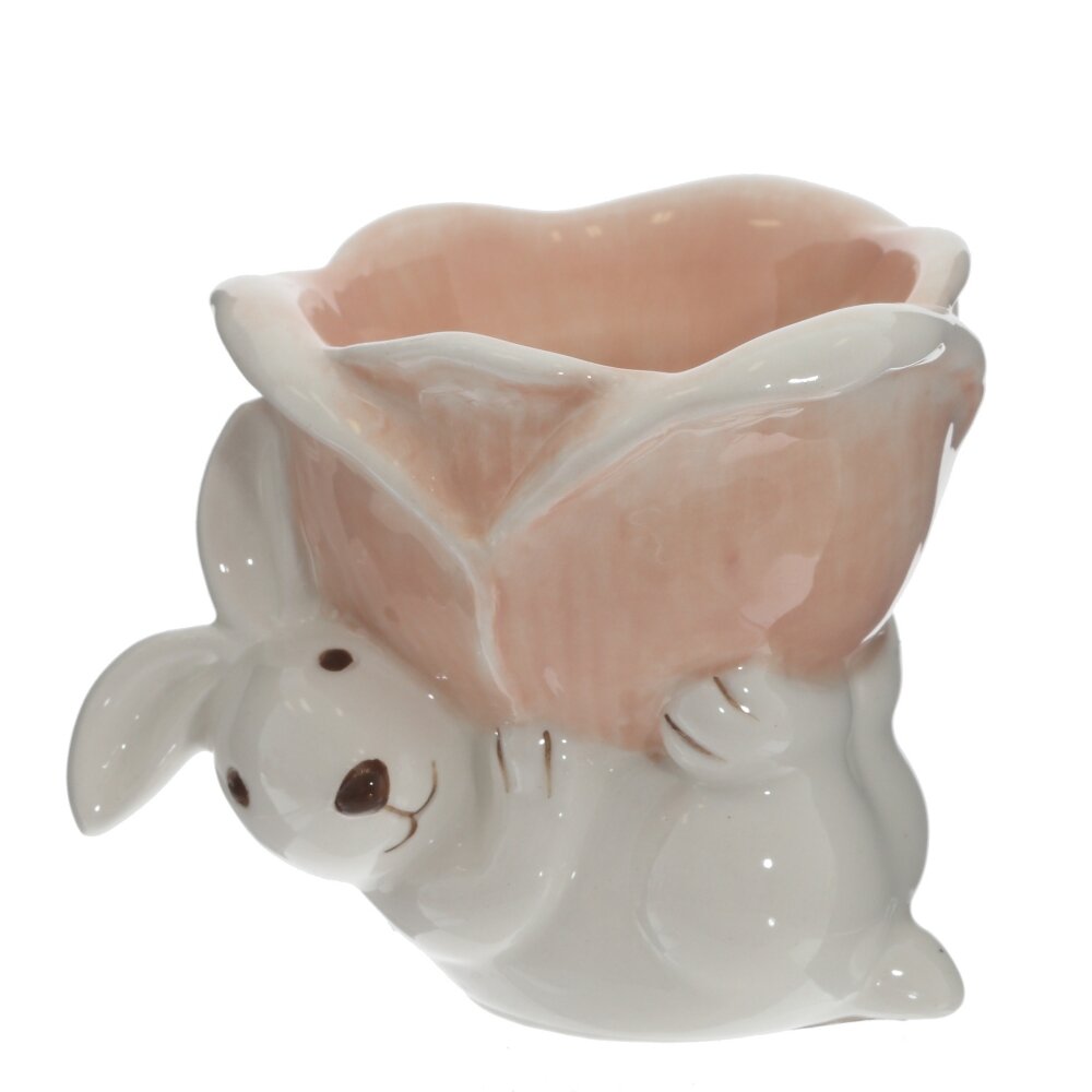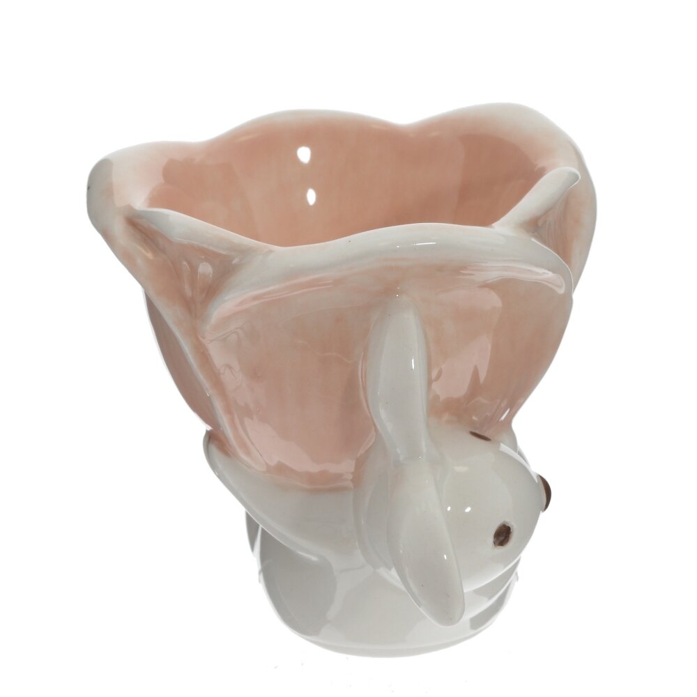 Керамическая подставка для яйца "Романтичный зайка" с пасхальным мотивом – стильный и практичный аксессуар для праздничного стола. Размер подставки для пасхального яйца: высота 6 см, длина 7,5 см, ширина 6 см. Очаровательная пасхальная подставка для яйца из керамики в виде белого кролика, держащего нежно-розовый цветок ни кого не оставит равнодушным. Глянцевая глазурь придаёт изделию изысканный блеск. Фигурка декоративная устойчивая, что обеспечивает надёжное положение яйца, а гладкие края делают использование комфортным и безопасным. Подставка идеально подойдёт для варёных яиц на пасхальном завтраке, для сервировки крашенок или украшения праздничной композиции. Пасхальная подставка для яйца легко сочетается с другой посудой и текстилем в деревенском или классическом стиле.Станет милым праздничным акцентом на кухне, а также приятным сувениром для родных и друзей. Милого зайчика так же можно подарить на день рождение или 8 марта в качестве подставки для мелочей или ювелирных украшений. В нежный розовый цветок можно, например, положить кольца на время готовки, что бы не повреждать их поверхность.