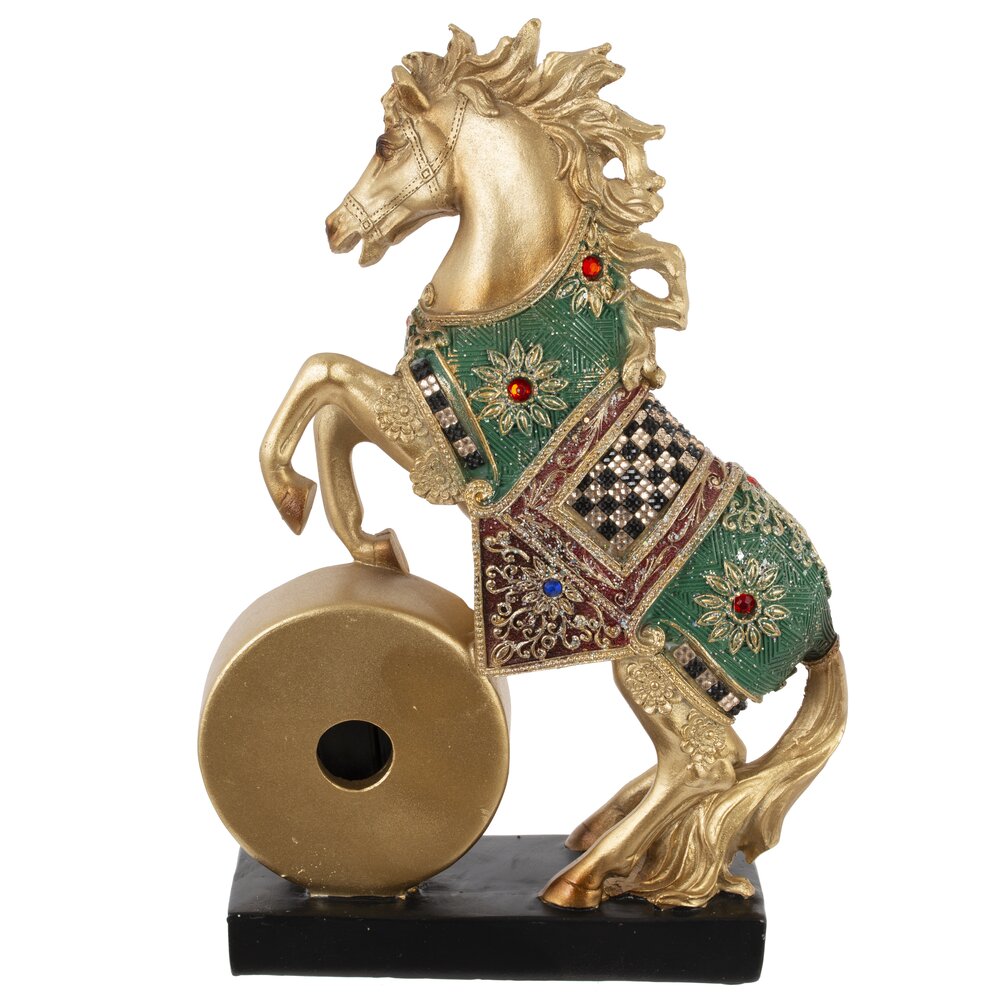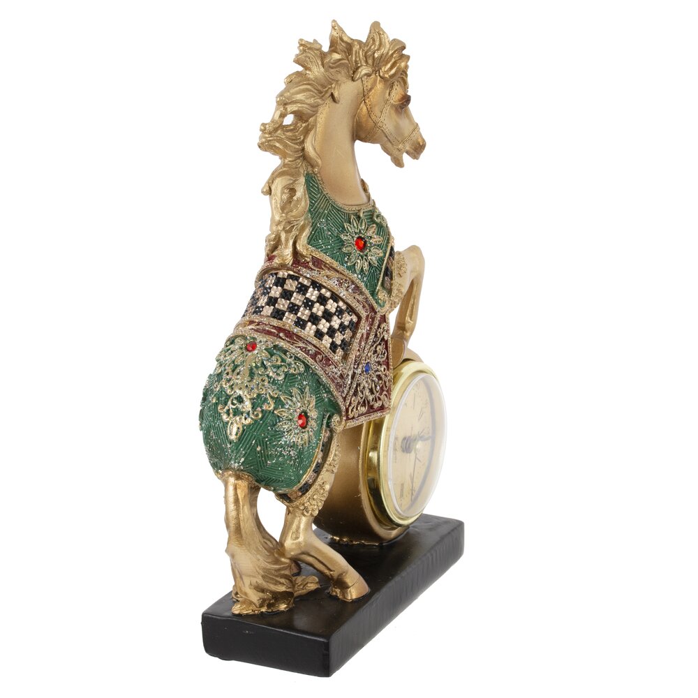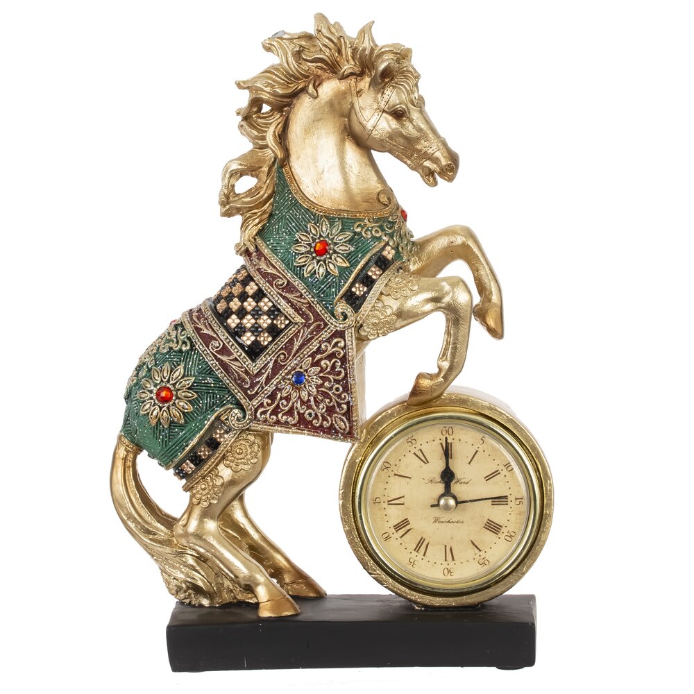Декоративная фигурка "Лошадь" с часами — это изысканный и функциональный акцент для вашего интерьера, сочетающий элегантность и практичность! Выполнена из прочного полистоуна, устойчивого к царапинам и пыли. Установлена на подставке. Фигурка изображает реалистичную золотую лошадь в динамичной позе курбет (на задних ногах), с высокой детализацией: мускулистое тело, выразительная морда, развивающаяся грива и хвост, словно ожившие под ветром. Нарядная зеленая попона украшена изысканным узором и старазми, придающим праздничный шарм. Круглые часы с диаметром циферблата 6 см имеют римские цифры и работают от одной батарейки ААА (батарейки не прилагаются). Это практичный подарок как символ года Лошади, идеальный для коллекционеров, любителей лошадей и ценителей стильного декора. Прекрасно дополнит полку, стол или витрину, принося нотку грации и функциональности в любое пространство!