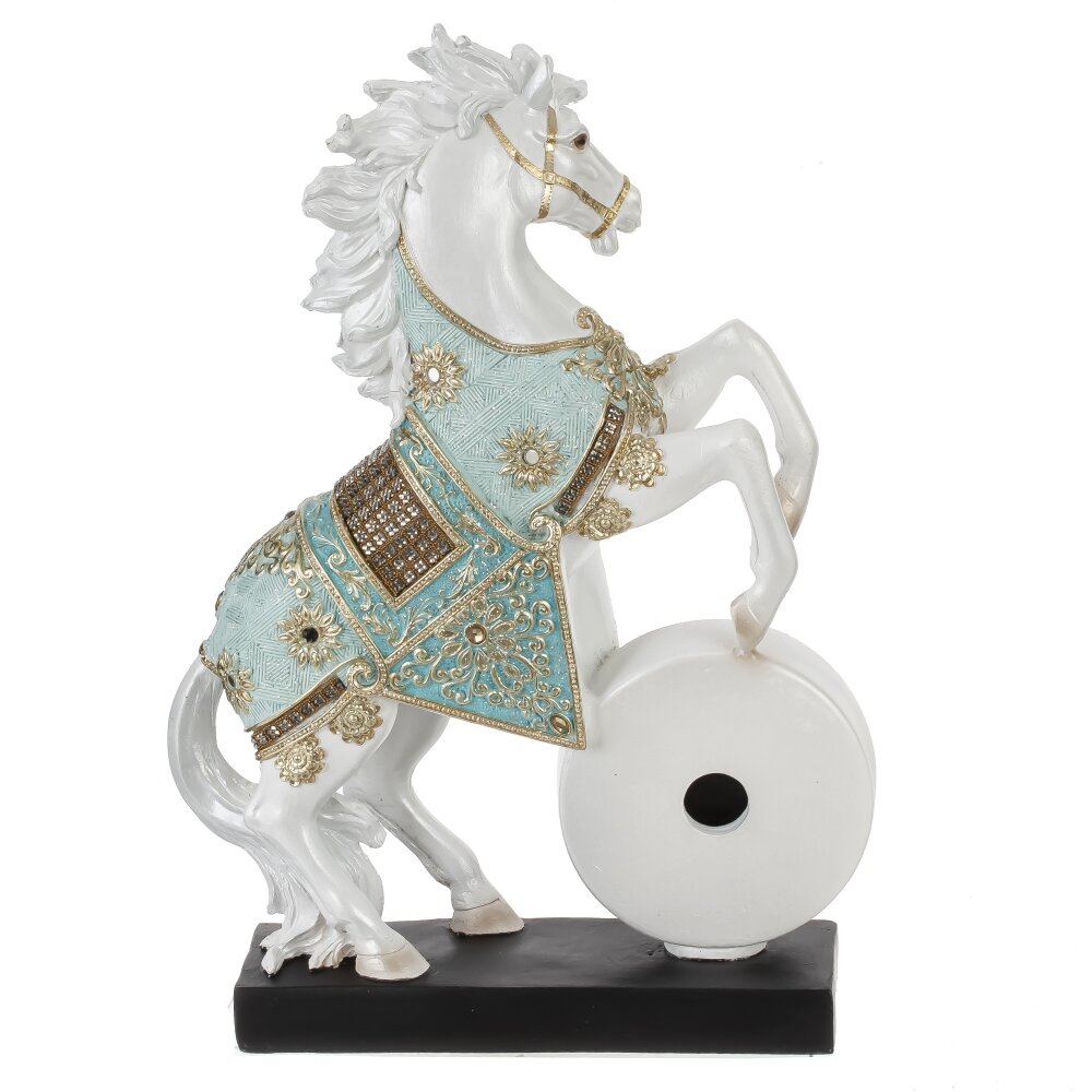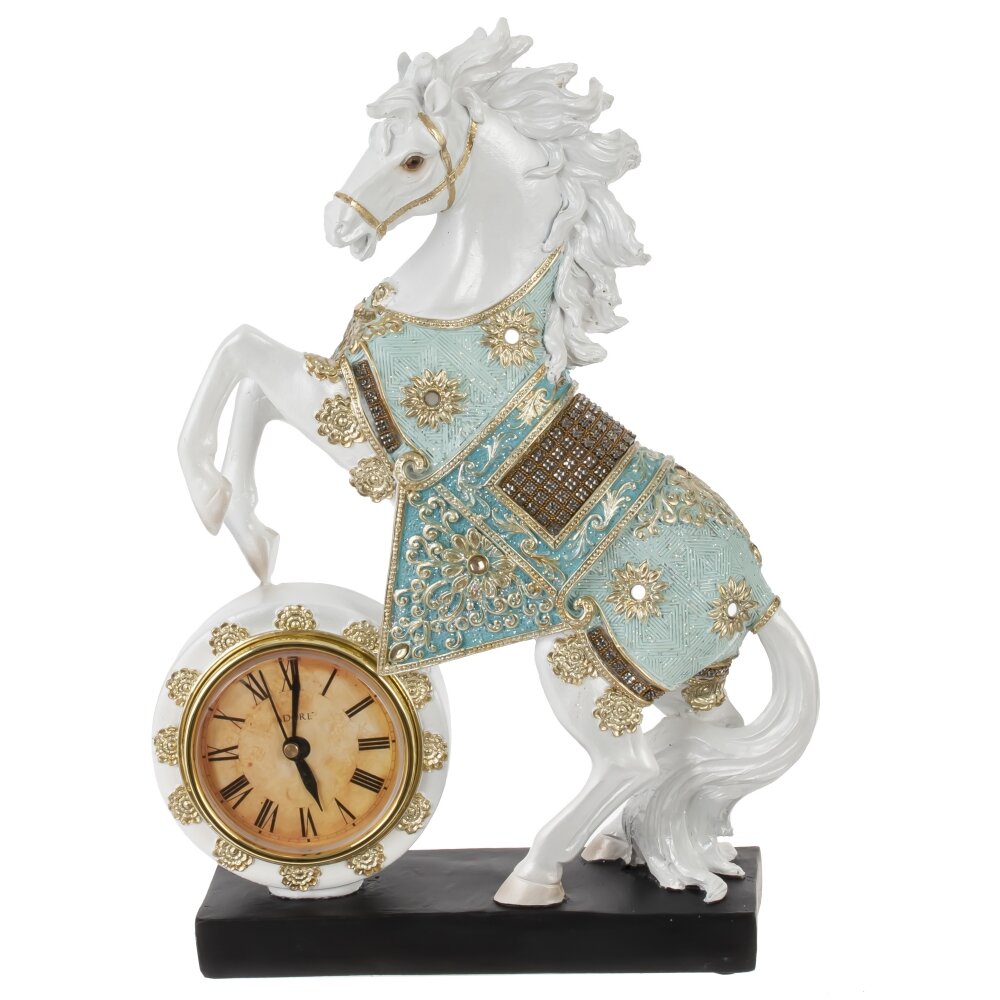 Декоративная фигурка "Лошадь" с часами — это изысканный и функциональный акцент для вашего интерьера, сочетающий элегантность и практичность! Выполнена из прочного полистоуна, устойчивого к царапинам и пыли. Установлена на подставке. Фигурка изображает реалистичную белую лошадь в динамичной позе курбет (на задних ногах), с высокой детализацией: мускулистое тело, выразительная морда, развивающаяся грива и хвост, словно ожившие под ветром. Нарядная бирюзовая попона украшена изысканным золотым узором, придающим праздничный шарм. Круглые часы с диаметром циферблата 7 см имеют римские цифры и работают от одной батарейки АА (батарейки не прилагаются). Это практичный подарок как символ года Лошади, идеальный для коллекционеров, любителей лошадей и ценителей стильного декора. Прекрасно дополнит полку, стол или витрину, принося нотку грации и функциональности в любое пространство!