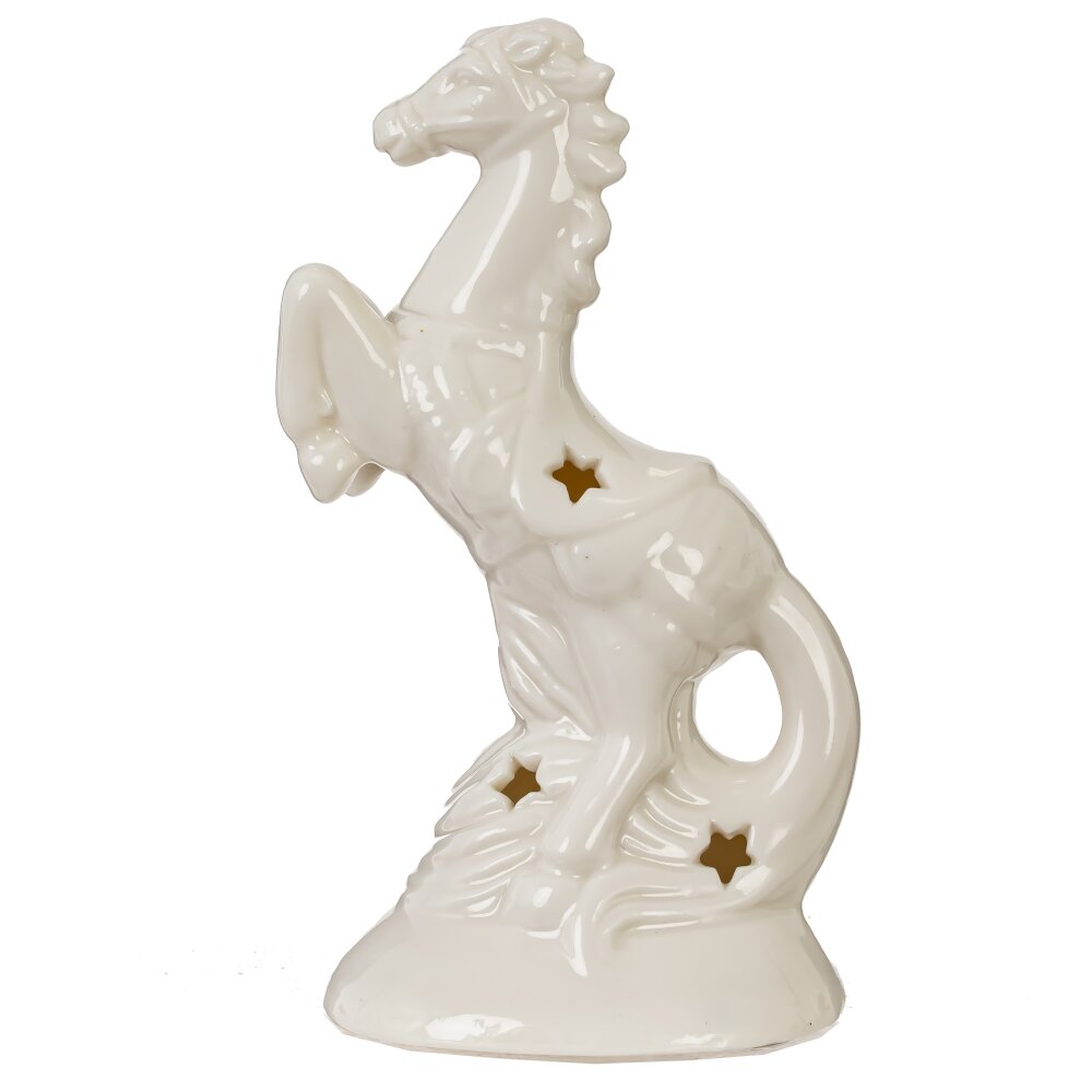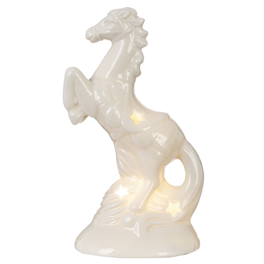 Декоративная  фигурка из белого фарфора Лошадь с подсветкой — это элегантное и стильное украшение, которое привнесет в ваш дом атмосферу уюта и изысканности. Фигурка выполнена из высококачественного белого фарфора, что придает ей утончённый и светлый вид. Особенностью изделия является встроенная подсветка, которая создаёт мягкое, тёплое сияние, подчеркивающее детали фарфоровой поверхности и придающее декору особое очарование в тёмное время суток. Такое украшение идеально подойдет  оформления интерьера в праздничный период или как самостоятельный акцент на полке, столе или окне. Лёгкость и изысканность фарфора в сочетании с нежным светом создают волшебную атмосферу и привлекают внимание, становясь ярким и незаменимым элементом декора.