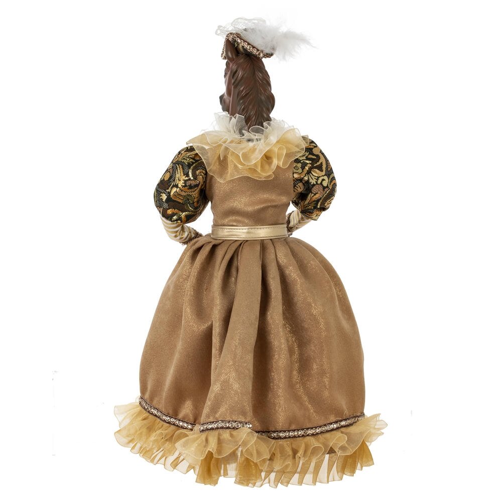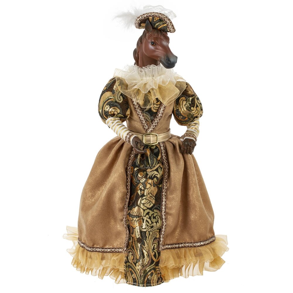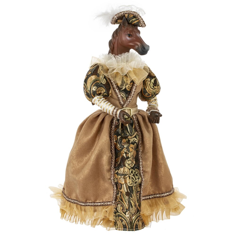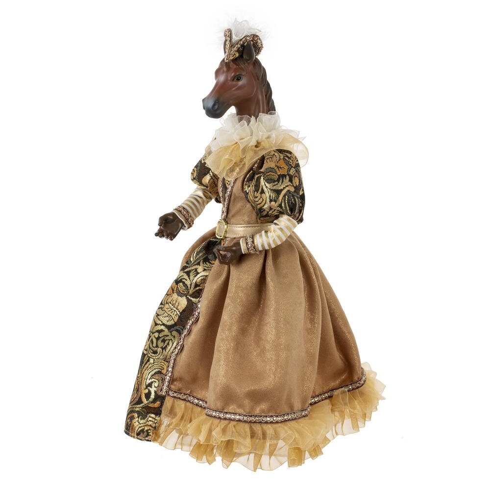 Набивная игрушка "Лошадь" в придворном платье — изящный и необычный элемент новогоднего или интерьерного декора. Мягкая фигурка лошади выполнена с особым вниманием к деталям: роскошное платье из блестящей ткани придаёт образу торжественность и сказочность. Игрушка создаёт атмосферу уюта и волшебства, отлично смотрится под ёлкой, на полке или в композиции с другими праздничными аксессуарами. Подойдёт как украшение, сувенир или оригинальный подарок.Стоит отметить, что голова игрушки выполнена из пластмассы, что делает изделие более легким, чем другие полимерные материалы.