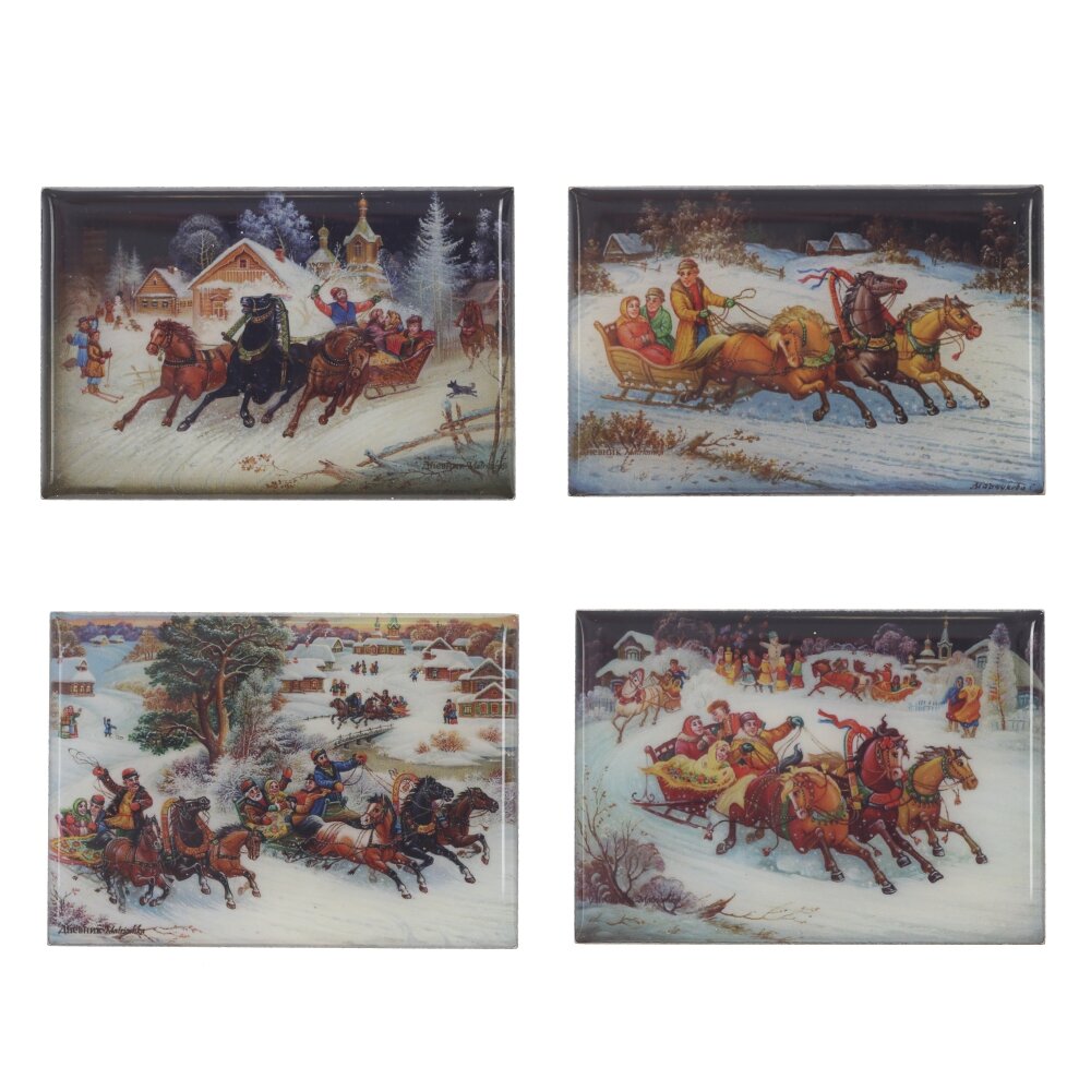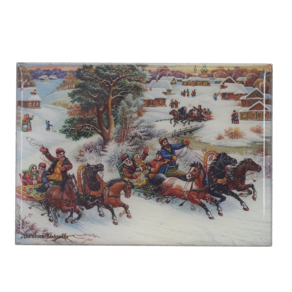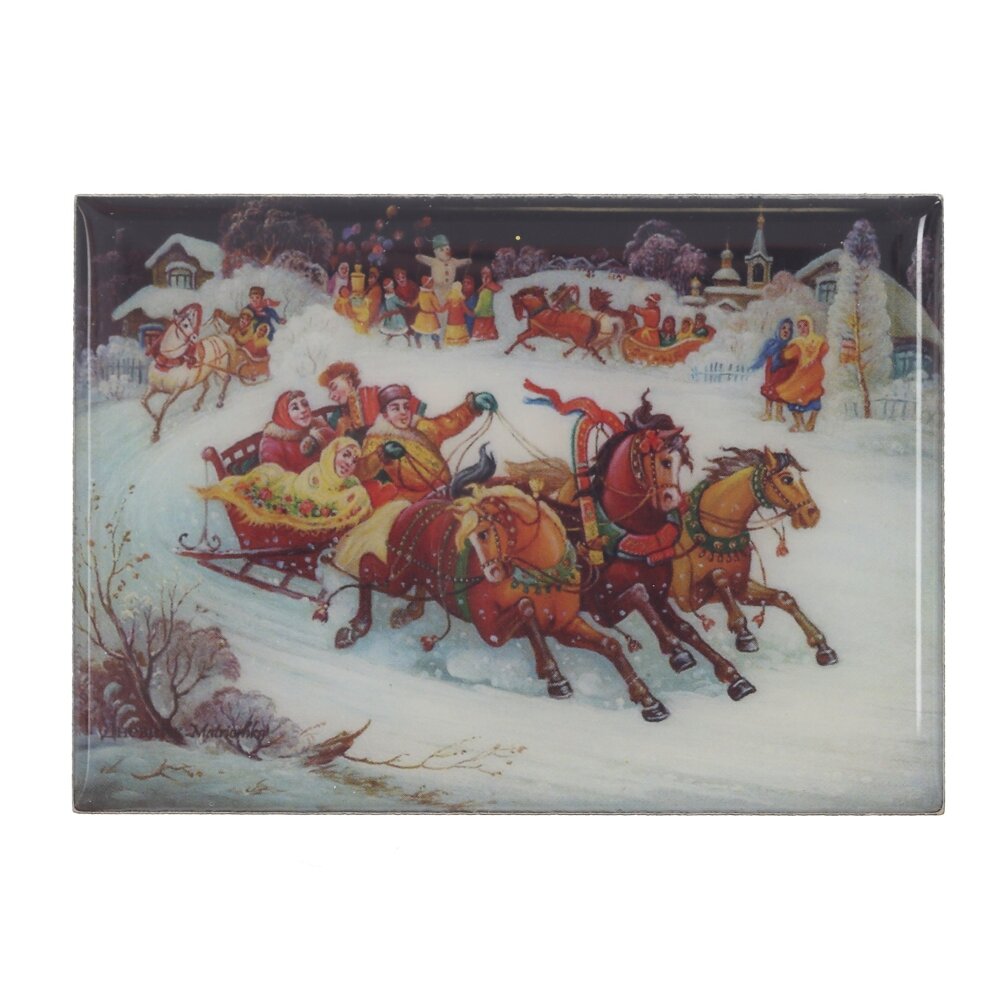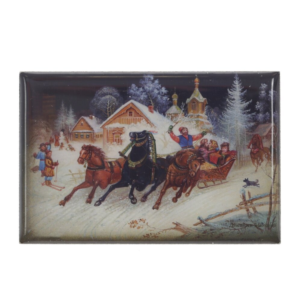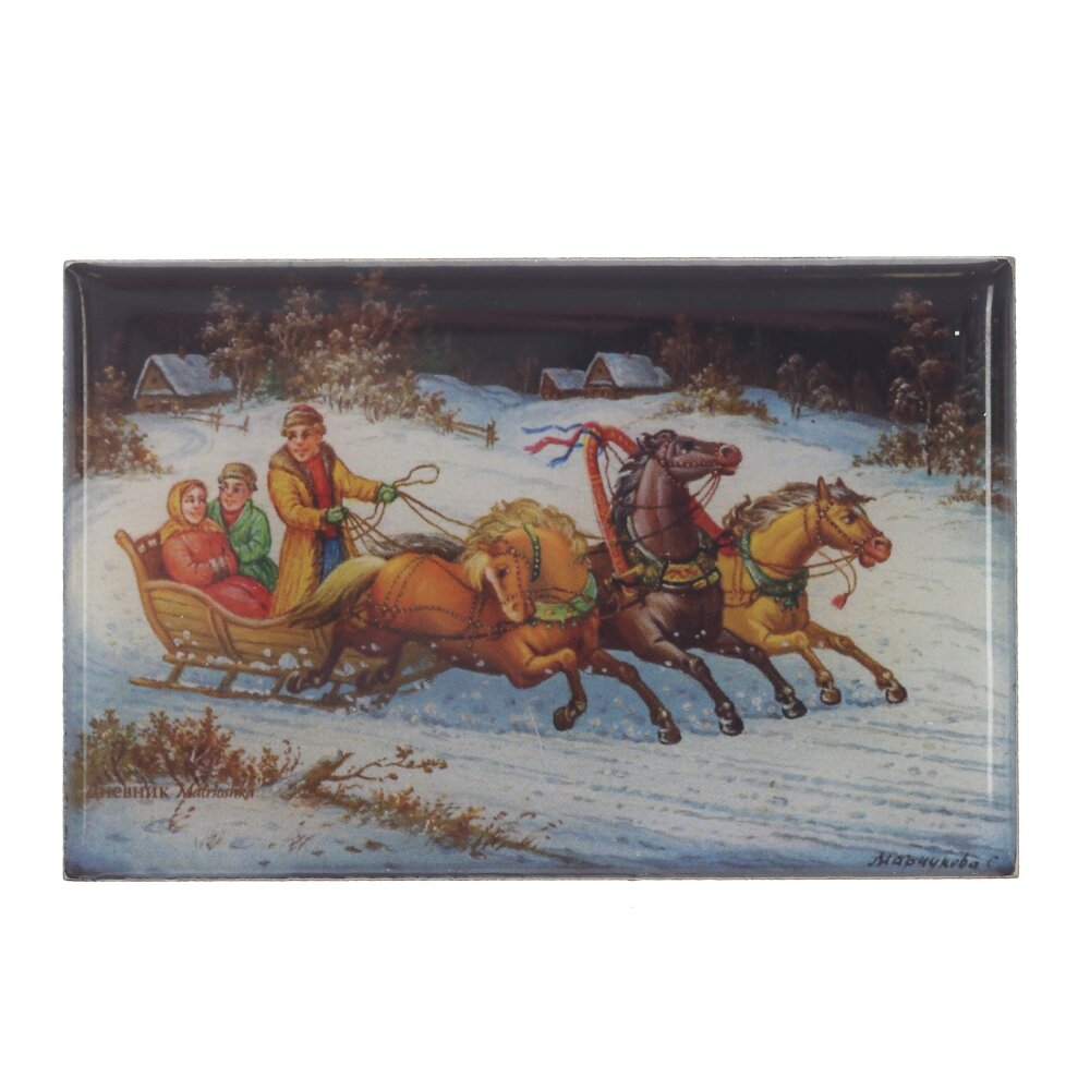 Магнит "Тройка лошадей " — это яркий и атмосферный сувенир, который станет прекрасным украшением вашего холодильника или металлической поверхности. На изображении — классическая русская тройка в праздничном убранстве, несущаяся по заснеженной дороге в разгар зимних гуляний. Детализированная иллюстрация передаёт дух народных традиций, веселья и радости. Идеален в качестве подарка, напоминания о русской культуре или украшения интерьера в стиле "русский шик". Изготовлен из прочного материала, долговечен и устойчив к выцветанию.