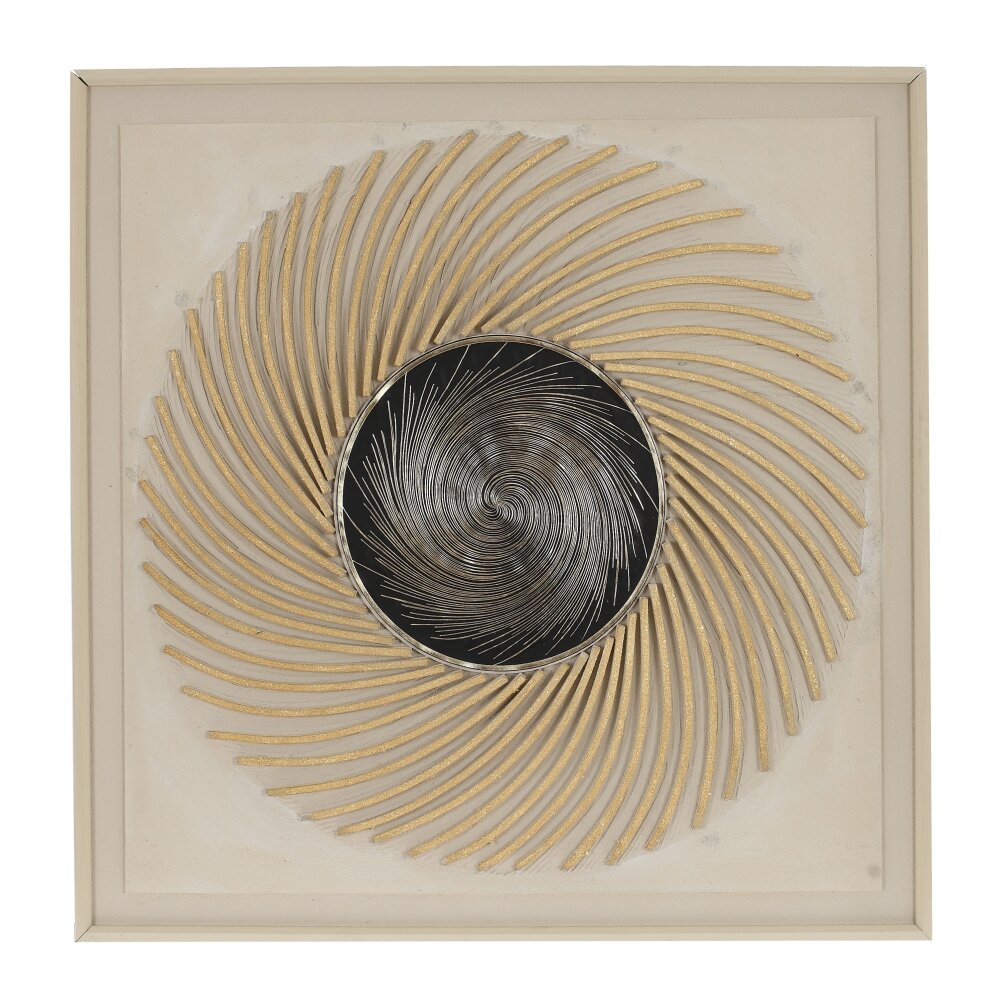 Настенное панно в современном стиле с эффектом 3D станет ярким акцентом в любом интерьере. В центре композиции расположен круг глубокого чёрного цвета с динамичным спиралевидным орнаментом под металл, создающим ощущение движения и глубины. От круга расходятся объёмные золотистые лучи, образуя изящный вихревой узор и напоминая сияние солнца. Нейтральный бежевый фон и лаконичная рама подчёркивают графичность рисунка и делают панно универсальным для гостиной, спальни или кабинета. Идеально подходит для современных, минималистичных и классических интерьеров, визуально расширяет пространство и добавляет ему благородного блеска.
