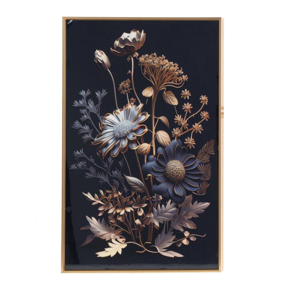 Настенное панно с изящной цветочной композицией станет ярким акцентом в любом современном интерьере. На глубоком темном фоне эффектно выделяются цветы в благородной гамме синего, бронзового и золотистого оттенков. Тонкие стебли, детально прорисованные листья и лепестки создают ощущение легкости и живого движения, а аккуратная рамка с золотистым покрытием подчеркивает изысканный характер изделия. Такое панно идеально подойдет для гостиной, спальни, коридора или рабочей зоны, гармонично сочетаясь как с классической, так и с минималистичной обстановкой. Стильный декор добавит помещению глубину, уют и утонченную роскошь, а также станет удачным подарком ценителям красивых и нестандартных интерьерных решений.