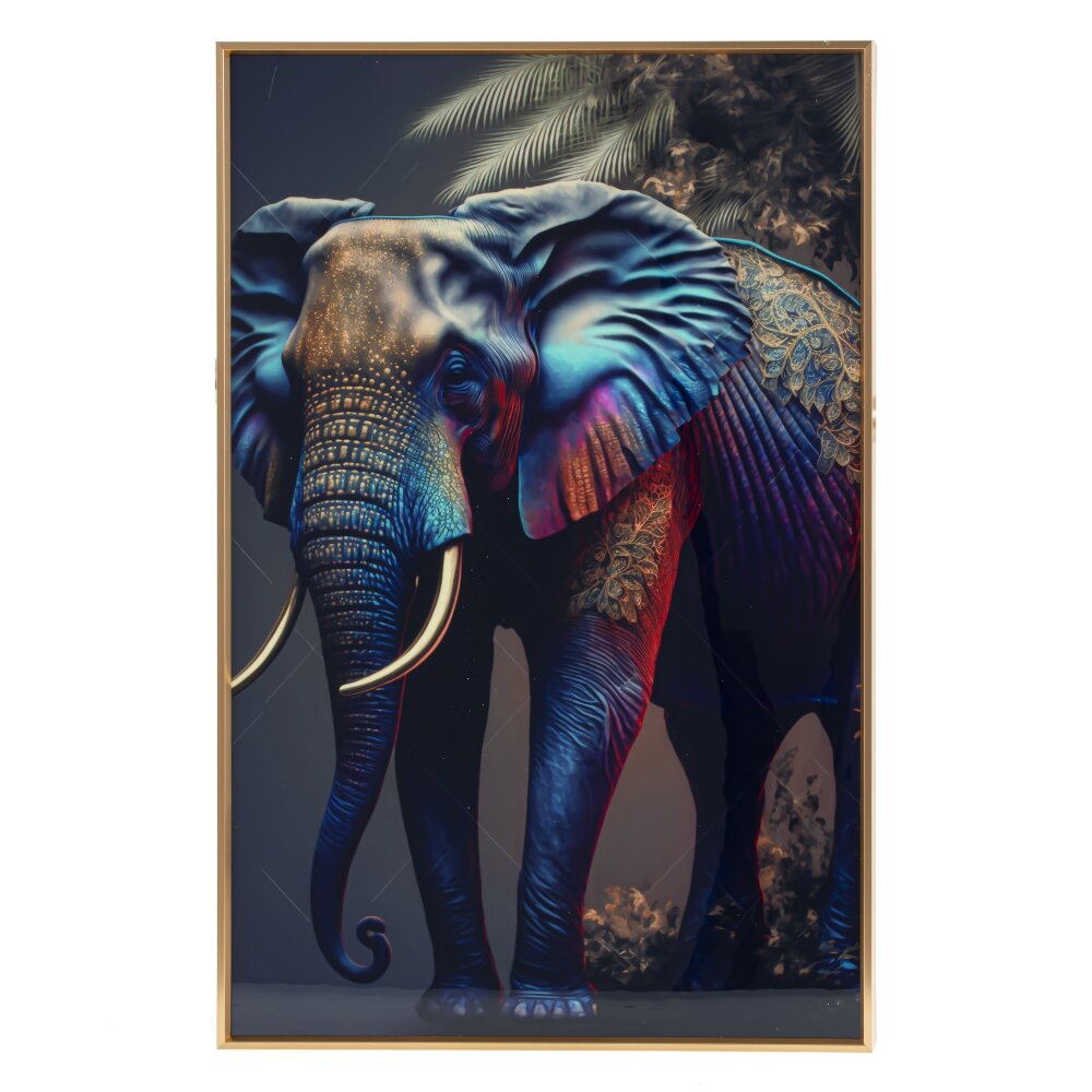 Декоративное панно с эффектным изображением слона станет ярким акцентом в любом интерьере. Глубокие насыщенные оттенки синего, фиолетового и золотого создают ощущение объёма и легкого свечения, а изящный орнамент на шкуре животного придаёт композиции восточный характер и нотку роскоши. Изделие выполнено на прочной основе с качественной детализацией рисунка, заключено в аккуратную раму благородного золотистого цвета, что подчеркивает глубину темного фона. Такое панно гармонично впишется в современный, арт-деко или эклектичный стиль, оживит гостиную, спальню, кабинет или креативное пространство. Отличный вариант подарка ценителям необычных и атмосферных картин