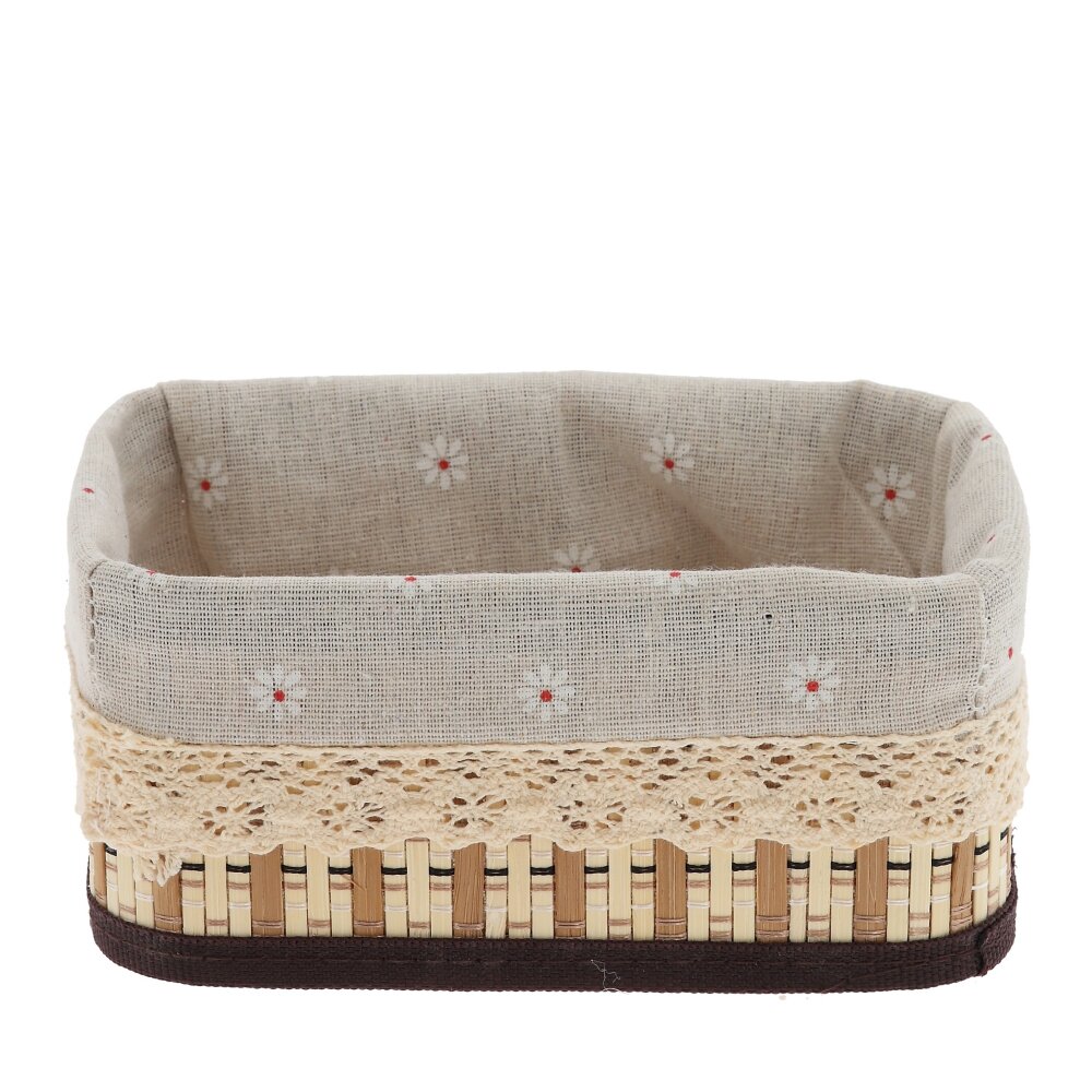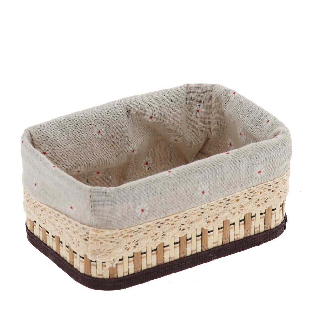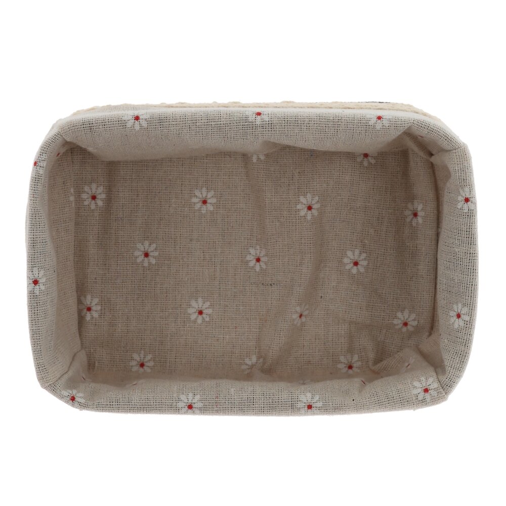 Прямоугольная плетёная корзина с текстильной вставкой – стильное и практичное решение для хранения мелочей в доме. Основание выполнено из прочного натурального материала в бежево?коричневых тонах. Внутри – съёмный тканевый чехол спокойного светло?серого цвета с мелким цветочным принтом, который легко стирать и очищать. Корзина подойдёт для хранения косметики, аксессуаров, канцелярии, кухонных принадлежностей, а также идеально смотрится в ванной, спальне или на полке в прихожей, добавляя интерьеру уют и порядок.