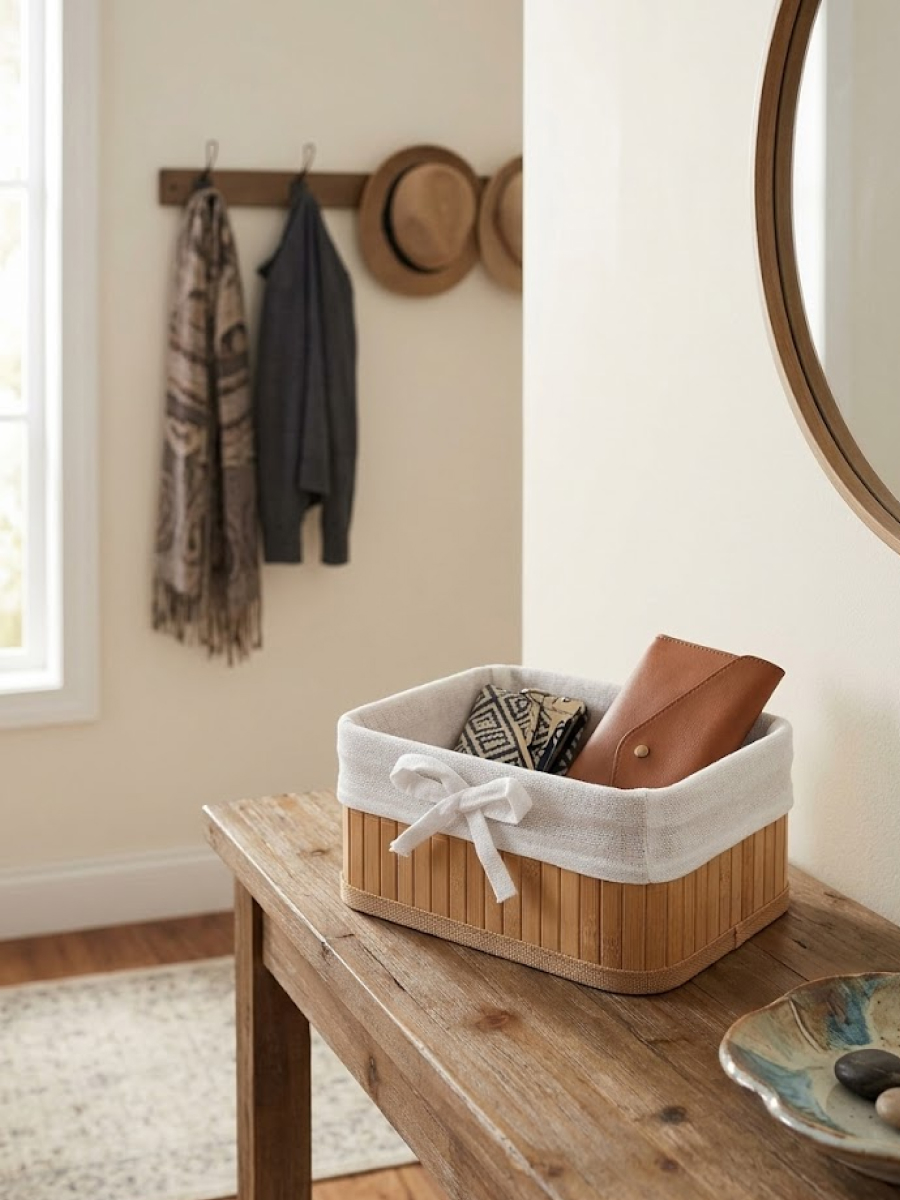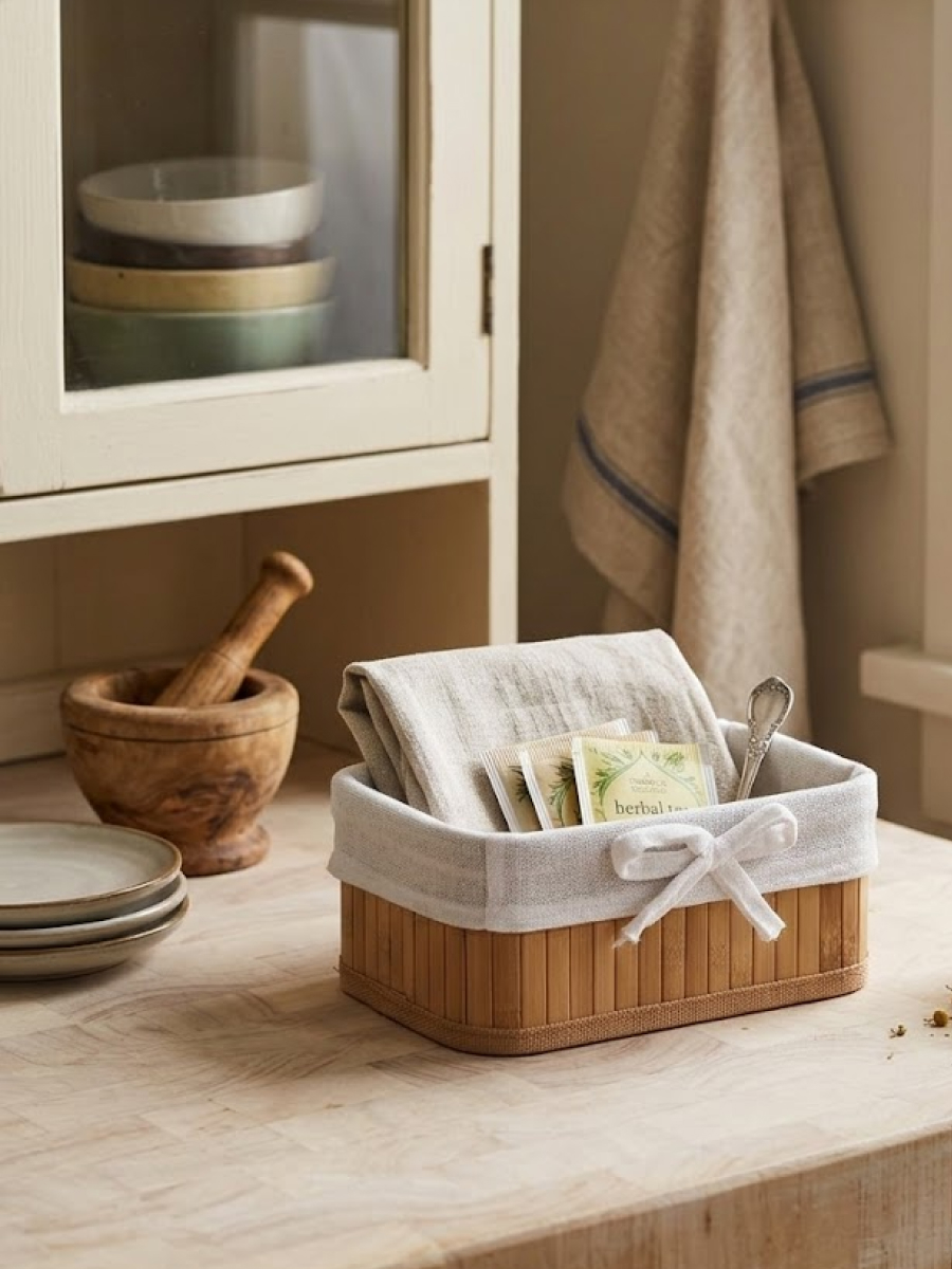 Прямоугольная плетёная корзина с текстильной вставкой – стильное и практичное решение для хранения мелочей в доме. Основание выполнено из прочного натурального материала в бежево?коричневых тонах. Внутри – съёмный тканевый чехол , который легко стирать и очищать. Корзина подойдёт для хранения косметики, аксессуаров, канцелярии, кухонных принадлежностей, а также идеально смотрится в ванной, спальне или на полке в прихожей, добавляя интерьеру уют и порядок.