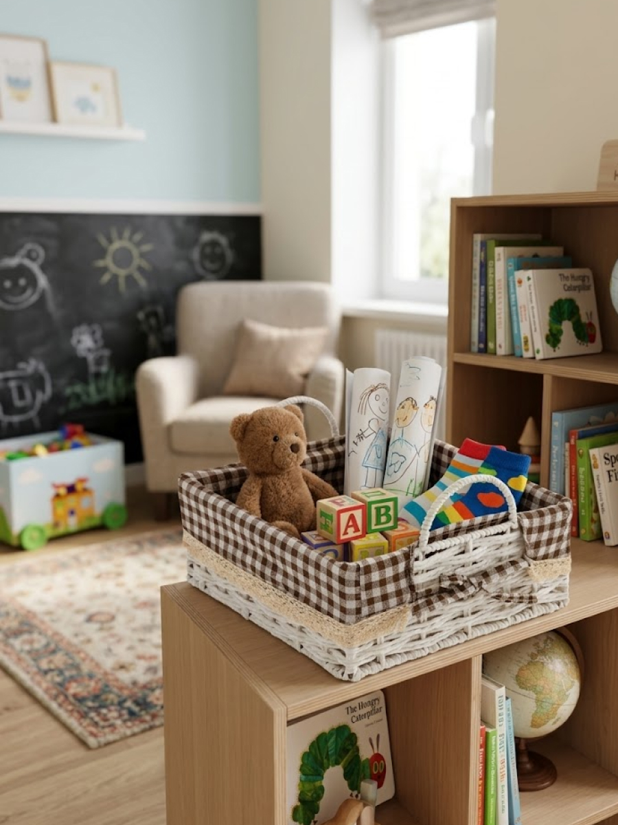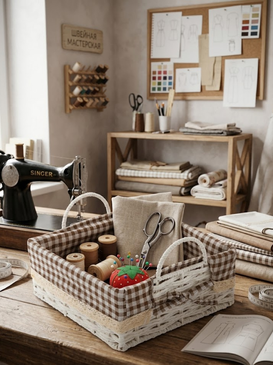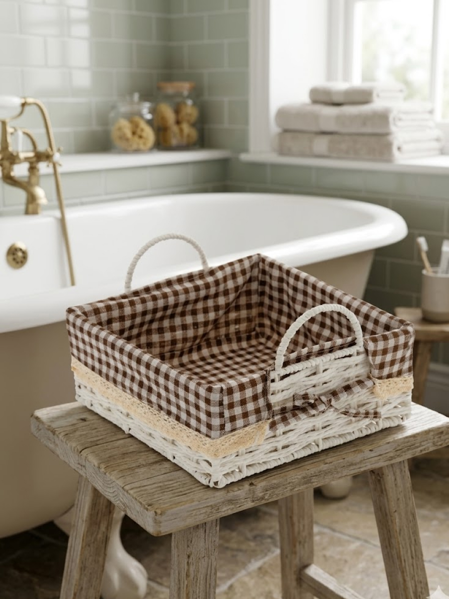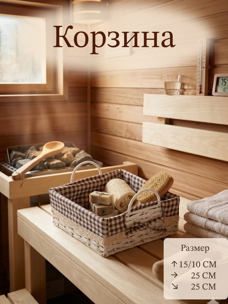 Стильная корзина – практичный и декоративный аксессуар для дома. Основа выполнена из прочного светлого плетения. Внутри – текстильный чехол в коричнево-белую клетку, который легко вынимается и стирается при необходимости. Две удобные ручки позволяют без труда переносить корзину. Изделие идеально подходит для хранения косметики, мелких аксессуаров, рукоделия, чайных пакетиков, сладостей или хлебобулочных изделий на кухне. Корзина компактна, не занимает много места на полке или столе и одновременно служит уютным элементом декора, подчеркивающим атмосферу кухни, гостиной, спальни или дачного домика.