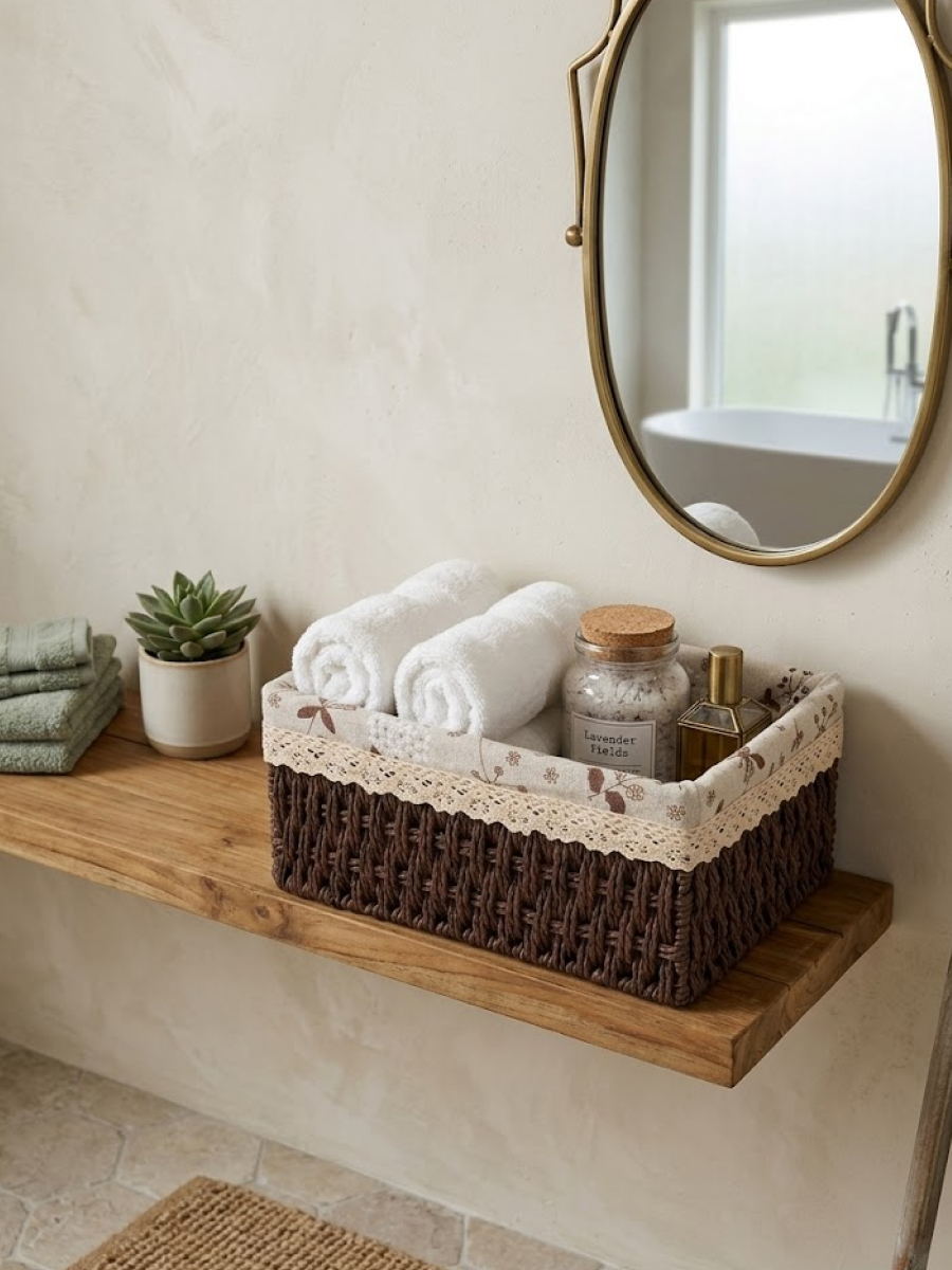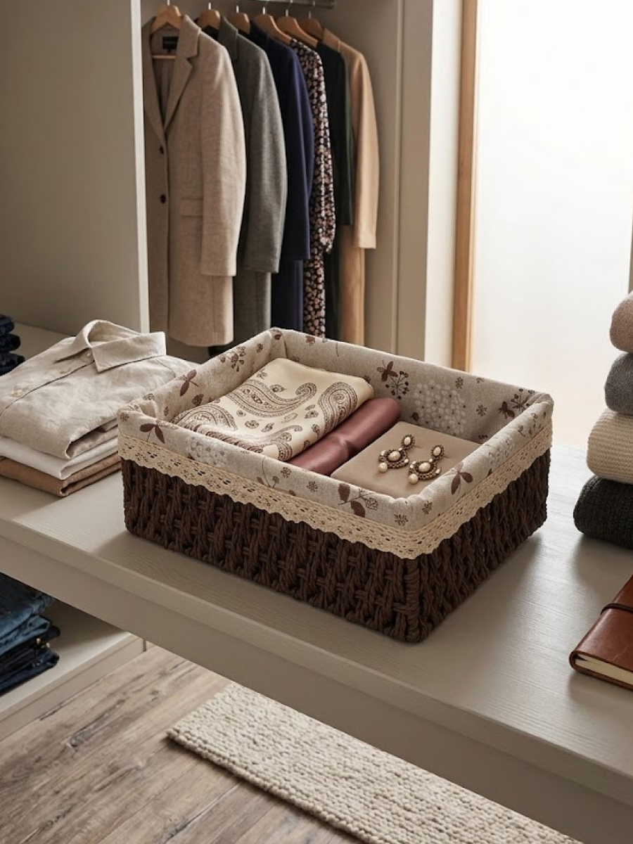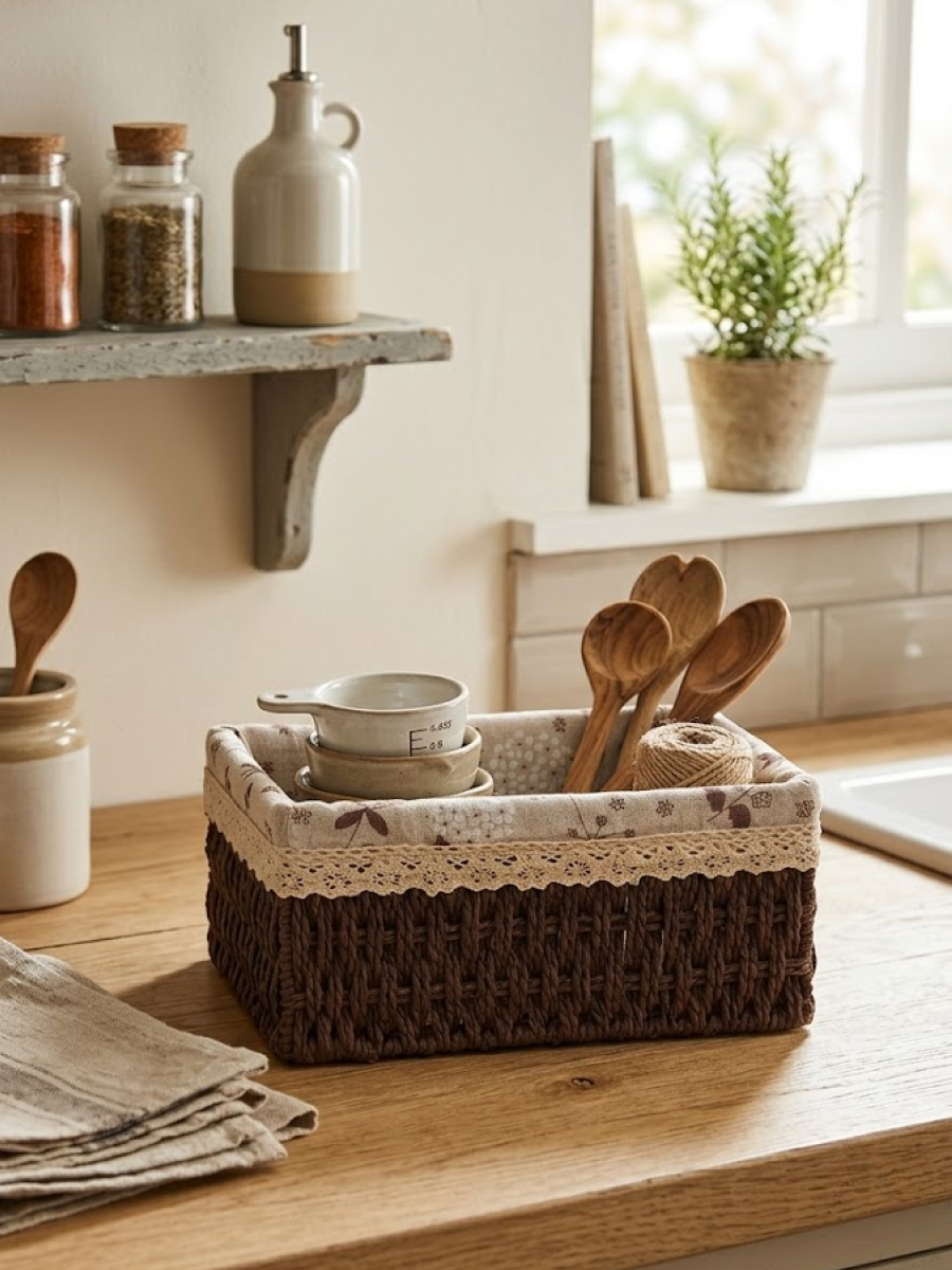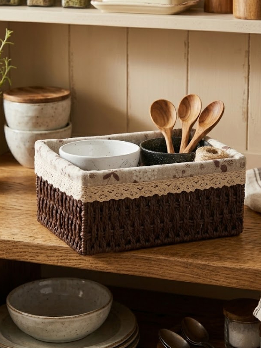 Плетеная корзина — универсальный аксессуар для хранения любых мелочей. Компактное и вместительное изделие из полимерных материалов. Тканевый чехол при необходимости снимается. Плетеная корзина станет не только практичным приобретением, но и отличным декоративным дополнением интерьера.