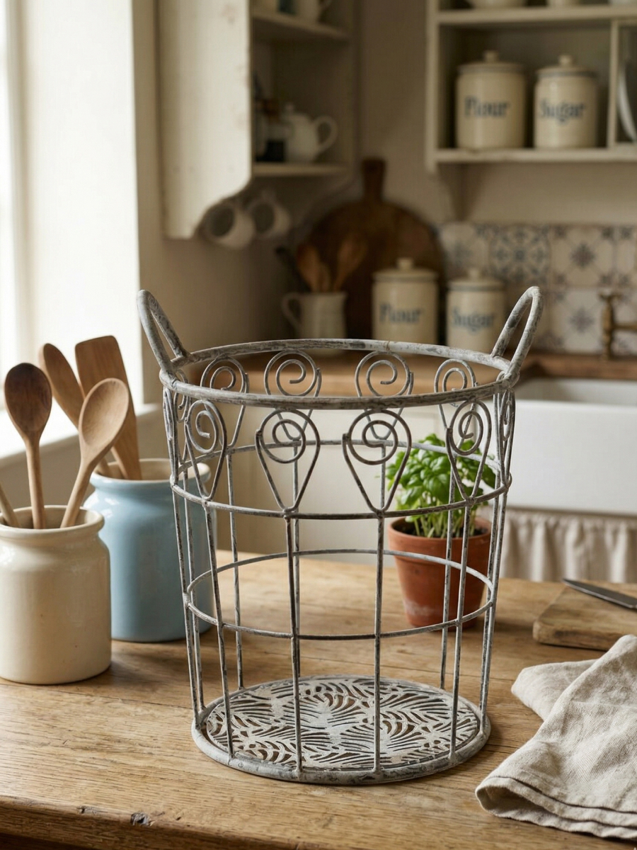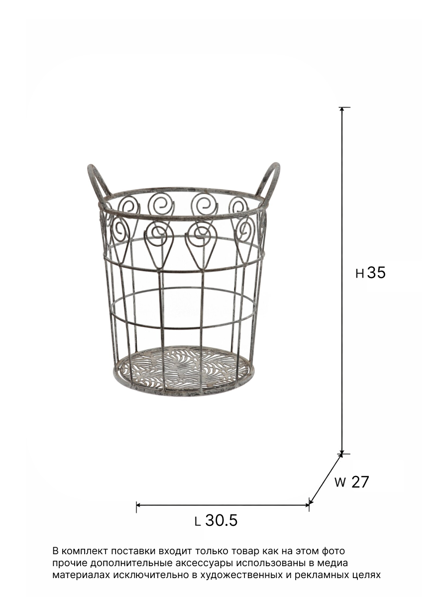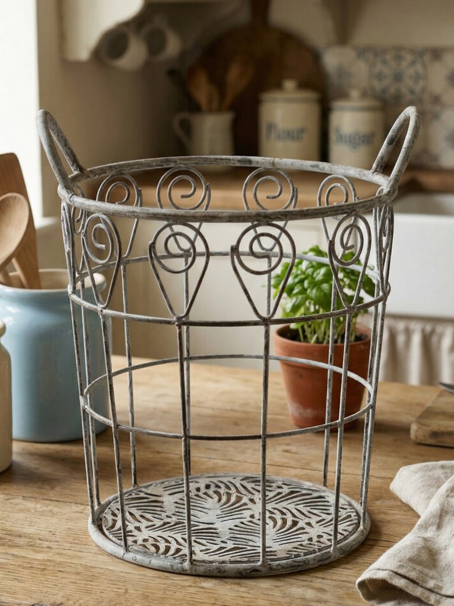 Металлическая корзина — стильное и практичное решение для хранения вещей в доме. Выполнена из прочного металла с изящным ажурным узором: завитки в верхней части придают изделию винтажный шарм, а декоративное основание с растительным орнаментом подчёркивает утончённость дизайна. Две удобные ручки позволяют легко переносить корзину. Цилиндрическая форма и открытая конструкция обеспечивают хорошую видимость содержимого и экономию пространства. Корзина подойдёт для хранения текстиля, игрушек, аксессуаров или использования в качестве декоративного элемента в прихожей, гостиной или на кухне. Сочетание функциональности и эстетики делает этот предмет незаменимым в любом интерьере.
