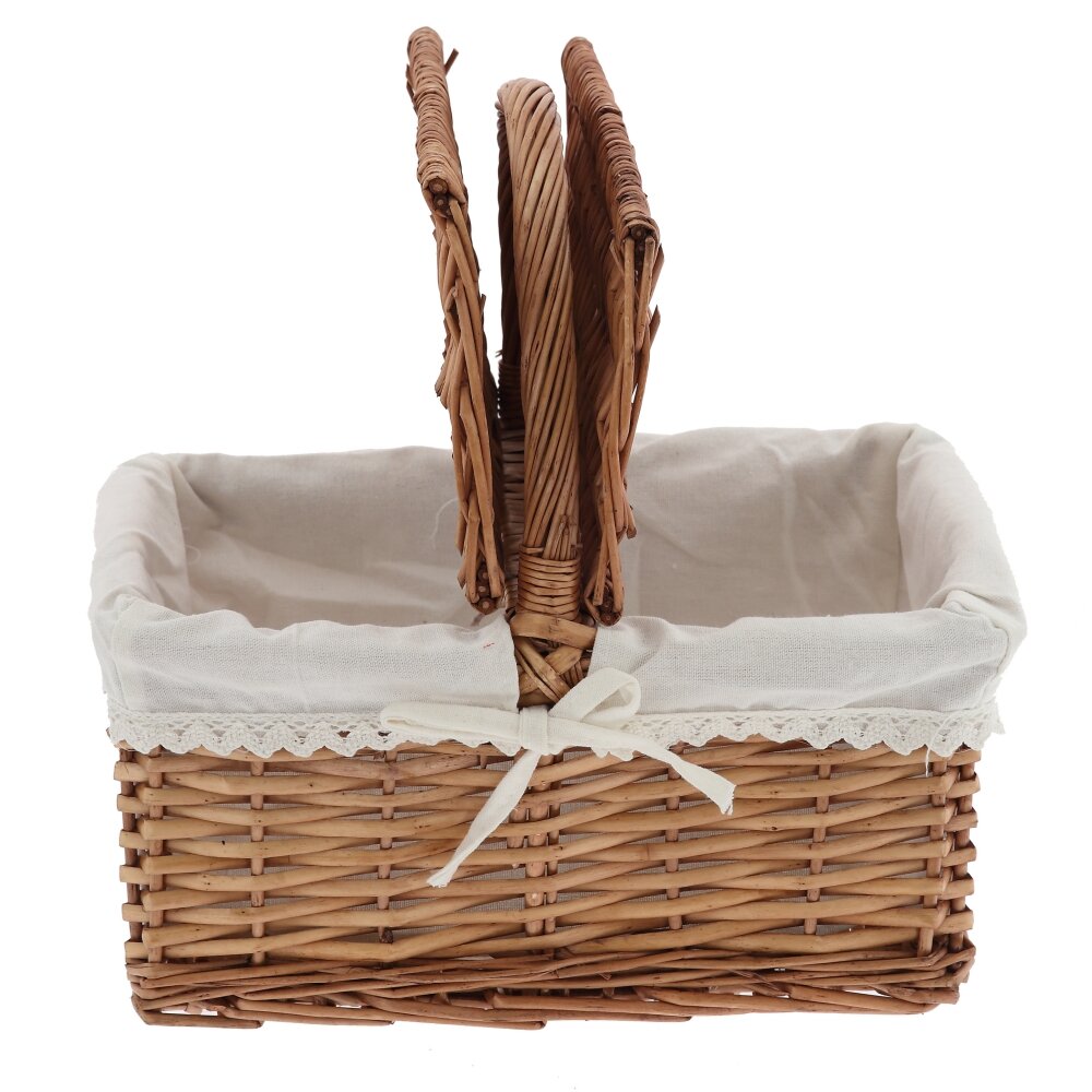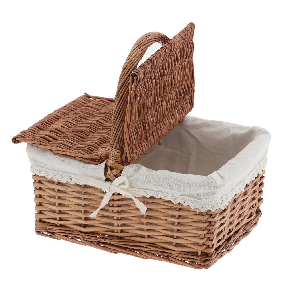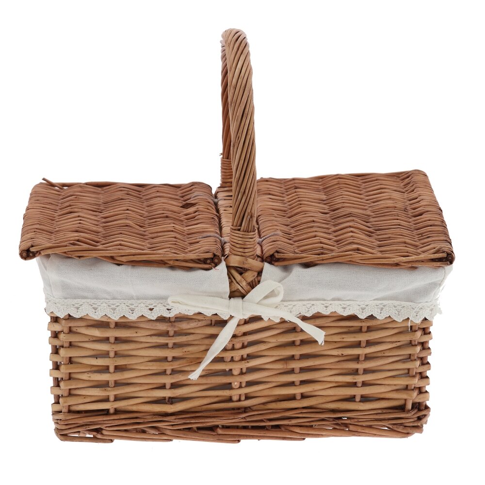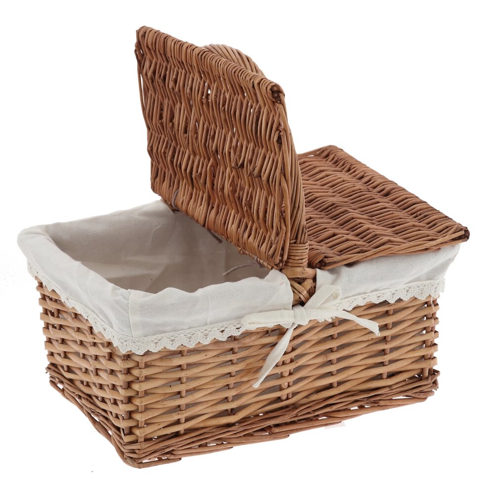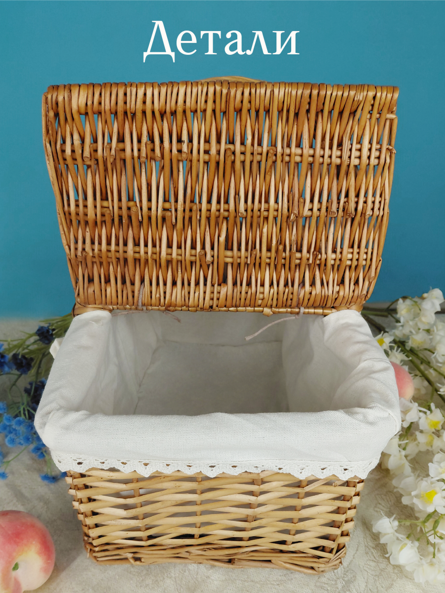 Элегантная плетёная корзина в винтажном стиле – практичный и декоративный аксессуар для вашего дома и отдыха. Корзина выполнена из прочной лозы в благородном коричневом оттенке, оснащена удобной ручкой и двусторонней откидной крышкой, которая надёжно защищает содержимое от пыли и солнечных лучей. Внутри корзина оформлена съёмным чехлом из ткани , по краю украшенным ажурным кружевом и бантиком. Такой декор придаёт изделию уютный, деревенский шарм и позволяет использовать корзину не только для хранения мелочей, рукоделия или косметики, но и как красивый элемент сервировки стола, подарочную упаковку или пасхальную корзинку. Пасхальные корзинки предназначены для хранения и переноски крашеных яиц, куличей, творожных пасок и других традиционных пасхальных угощений. Корзина для пасхи служит прекрасным элементом декора, украшая праздничный стол своим ярким и стильным внешним видом. В целом, корзинка для пасхального декора – это не только функциональный, но и красивый элемент праздничного декора, который добавит уюта и тепла в ваш дом на Пасху. Лёгкая, удобная и компактная, она гармонично впишется в любой интерьер. Оригинальный дизайн этой корзины не останется незамеченным, ведь плетеная пасхальная корзинка для яиц и куличей – неотъемлемые атрибуты пасхального праздника.