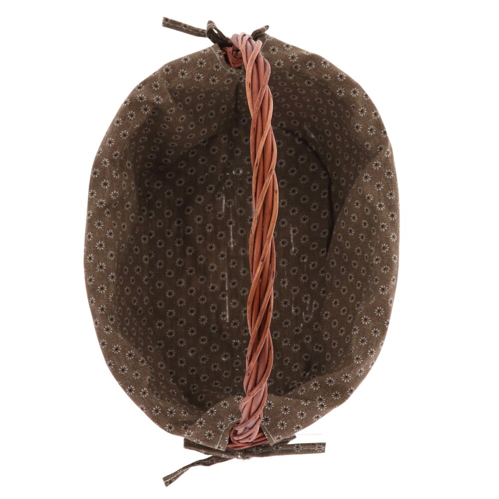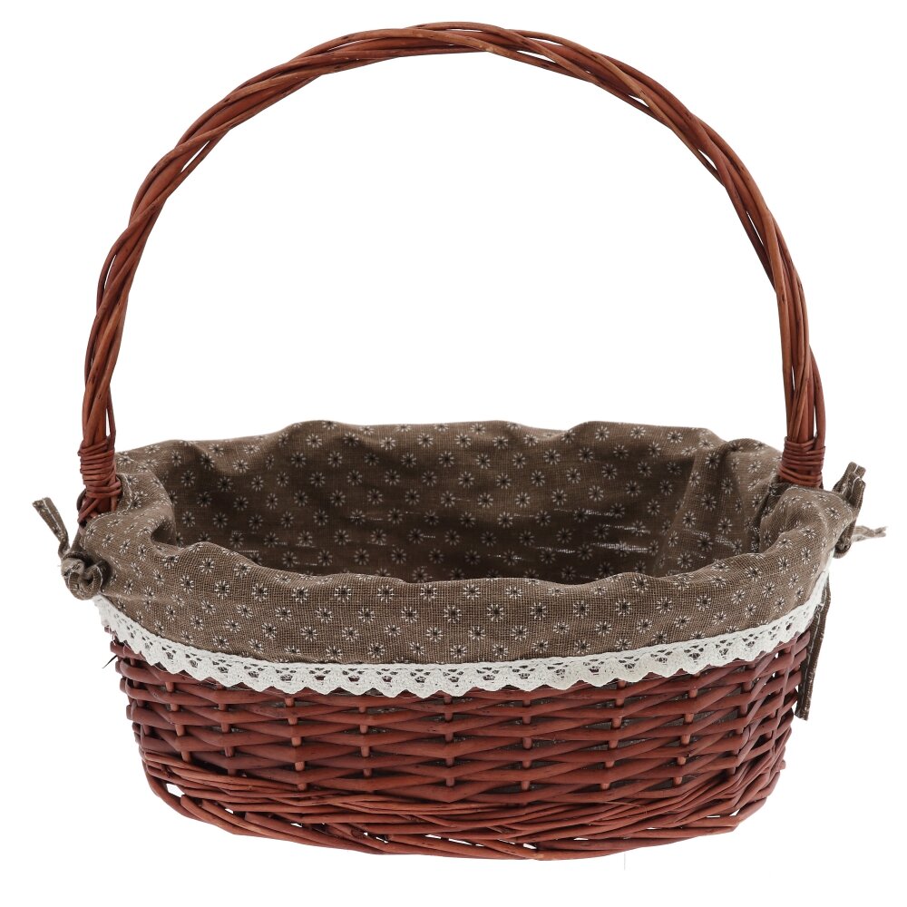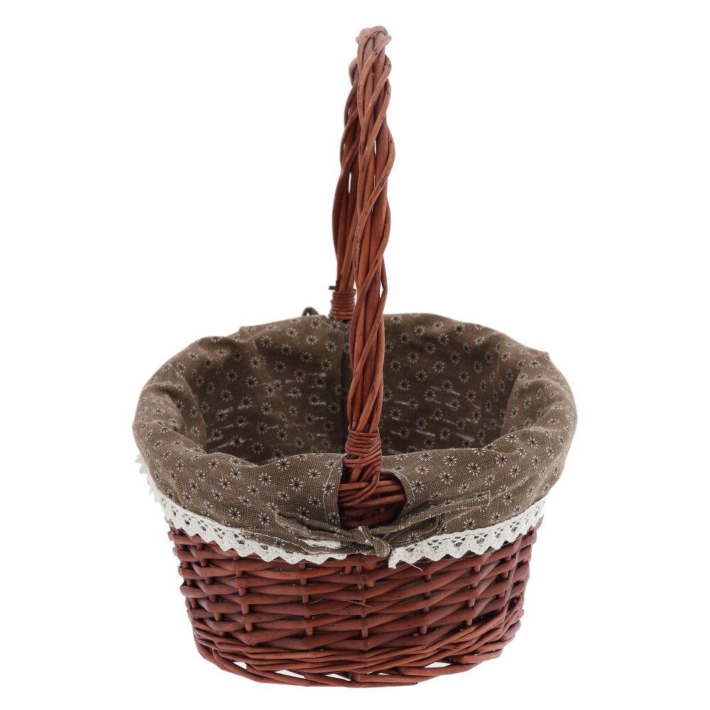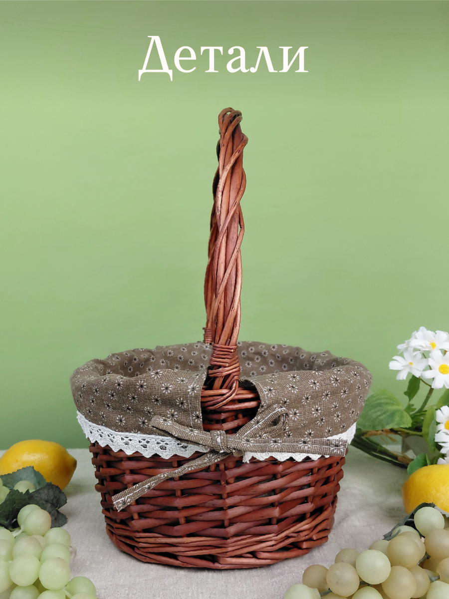 Элегантная плетёная корзина в винтажном стиле – практичный и декоративный аксессуар для вашего дома и отдыха. Корзина выполнена из натуральной лозы тёплого коричневого оттенка, что придаёт ей уютный, «деревенский» шарм. Внутри она полностью облицована мягкой тканевой вставкой коричневого цвета с мелким цветочным принтом, защищающей продукты и мелкие предметы от повреждений. Верхний край ткани украшен аккуратным кружевом, благодаря чему корзина выглядит особенно нарядно и подойдёт не только для похода за покупками, но и для сервировки стола, пикников, фотосессий, пасхальных и праздничных композиций. Прочная ручка удобно лежит в руке и выдерживает повседневные нагрузки. Пасхальные корзинки предназначены для хранения и переноски крашеных яиц, куличей, творожных пасок и других традиционных пасхальных угощений. Корзина для пасхи служит прекрасным элементом декора, украшая праздничный стол своим ярким и стильным внешним видом. В целом, корзинка для пасхального декора – это не только функциональный, но и красивый элемент праздничного декора, который добавит уюта и тепла в ваш дом на Пасху. Лёгкая, удобная и компактная, она гармонично впишется в любой интерьер. Оригинальный дизайн этой корзины не останется незамеченным, ведь плетеная пасхальная корзинка для яиц и куличей – неотъемлемые атрибуты пасхального праздника.