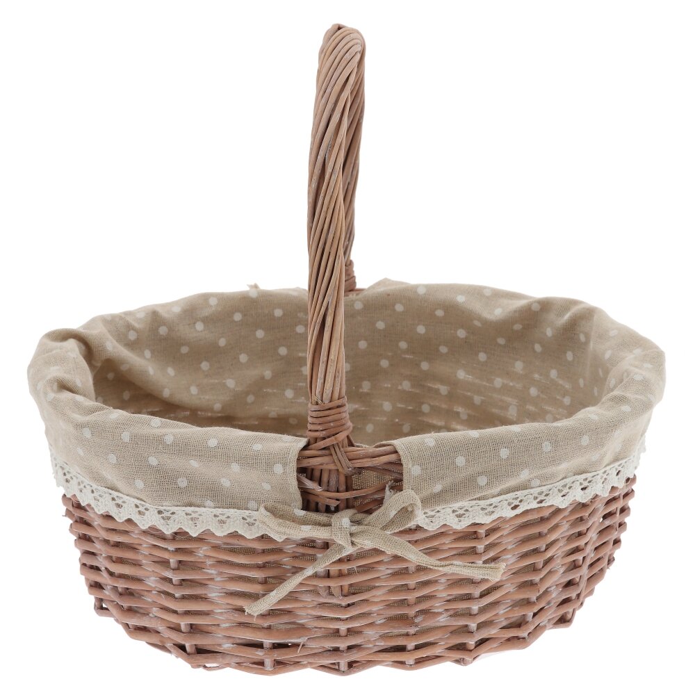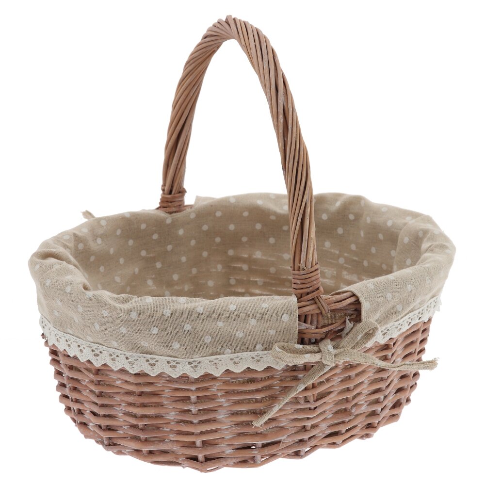 Элегантная плетёная корзина в винтажном стиле – практичный и декоративный аксессуар для вашего дома и отдыха. Основа выполнена из прочной лозы натурального оттенка, аккуратно и плотно сплетённой для надёжности и долговечности. Внутри корзина оформлена съёмным бежевым чехлом из ткани в белый горошек, по краю украшенным ажурным кружевом и бантиком. Такой декор придаёт изделию уютный, деревенский шарм и позволяет использовать корзину не только для хранения мелочей, рукоделия или косметики, но и как красивый элемент сервировки стола, подарочную упаковку или пасхальную корзинку. Пасхальные корзинки предназначены для хранения и переноски крашеных яиц, куличей, творожных пасок и других традиционных пасхальных угощений. Корзина для пасхи служит прекрасным элементом декора, украшая праздничный стол своим ярким и стильным внешним видом. В целом, корзинка для пасхального декора – это не только функциональный, но и красивый элемент праздничного декора, который добавит уюта и тепла в ваш дом на Пасху. Лёгкая, удобная и компактная, она гармонично впишется в любой интерьер. Оригинальный дизайн этой корзины не останется незамеченным, ведь плетеная пасхальная корзинка для яиц и куличей – неотъемлемые атрибуты пасхального праздника.