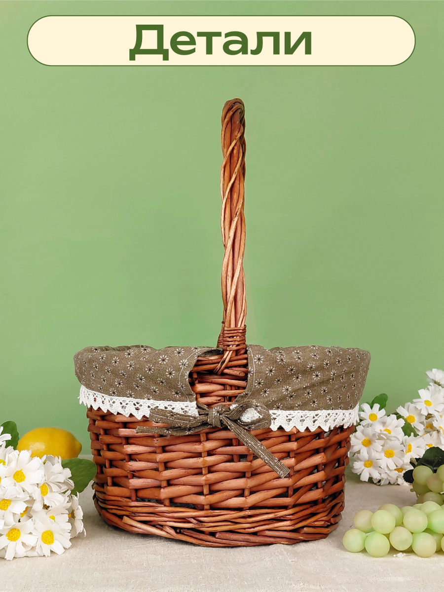 Элегантная плетёная корзина в винтажном стиле – практичный и декоративный аксессуар для вашего дома и отдыха. Корзина выполнена из натуральной лозы тёплого коричневого оттенка, что придаёт ей уютный, «деревенский» шарм. Внутри она полностью облицована мягкой тканевой вставкой коричневого цвета с мелким цветочным принтом, защищающей продукты и мелкие предметы от повреждений. Верхний край ткани украшен аккуратным кружевом, благодаря чему корзина выглядит особенно нарядно и подойдёт не только для похода за покупками, но и для сервировки стола, пикников, фотосессий, пасхальных и праздничных композиций. Прочная ручка удобно лежит в руке и выдерживает повседневные нагрузки. Пасхальные корзинки предназначены для хранения и переноски крашеных яиц, куличей, творожных пасок и других традиционных пасхальных угощений. Корзина для пасхи служит прекрасным элементом декора, украшая праздничный стол своим ярким и стильным внешним видом. В целом, корзинка для пасхального декора – это не только функциональный, но и красивый элемент праздничного декора, который добавит уюта и тепла в ваш дом на Пасху. Лёгкая, удобная и компактная, она гармонично впишется в любой интерьер. Оригинальный дизайн этой корзины не останется незамеченным, ведь плетеная пасхальная корзинка для яиц и куличей – неотъемлемые атрибуты пасхального праздника.
