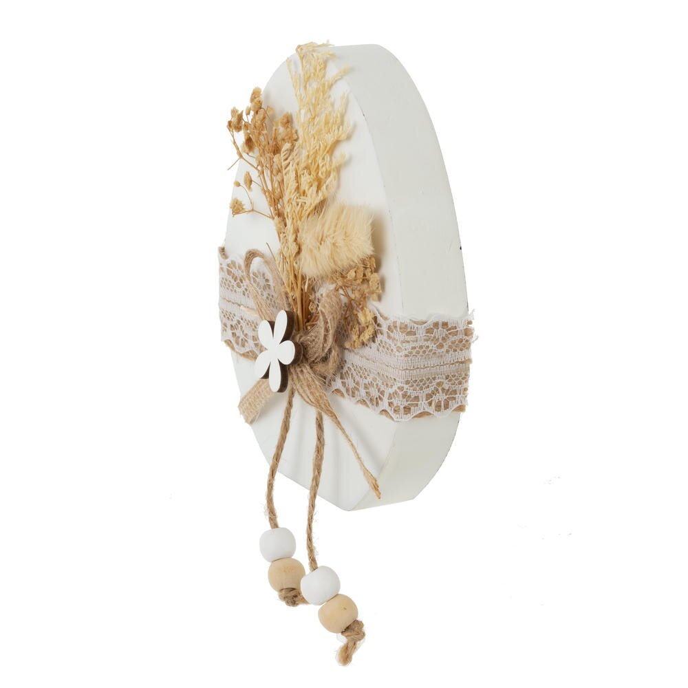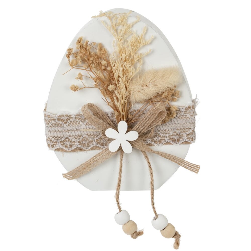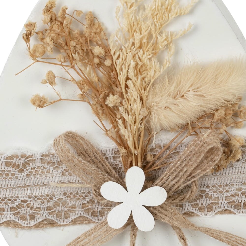 Фигурка декоративная «Нарядное яйцо» – изящный акцент для уютного интерьера в стиле эко, бохо или прованс. Имеет размеры: длина-10 см, ширина-2 см, высота-12 см. Основой служит яйцо из дерева, оформленное широкой полосой бежевого кружева. Центр композиции украшен натуральным шпагатом, завязанным бантом, деревянным цветком и подвесками с деревянными бусинами. Верх декора дополняют сухоцветы в мягких бежево-песочных тонах, создающие ощущение природной легкости и тепла. Такая фигурка гармонично смотрится на полке, каминной или праздничной сервировке, подчеркивая атмосферу Пасхи, весенних и семейных праздников. Отличный вариант для подарка и украшения дома без лишней вычурности. Преобразите свой дом к Пасхе с помощью этой очаровательной фигурки!