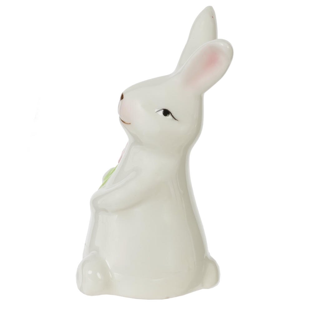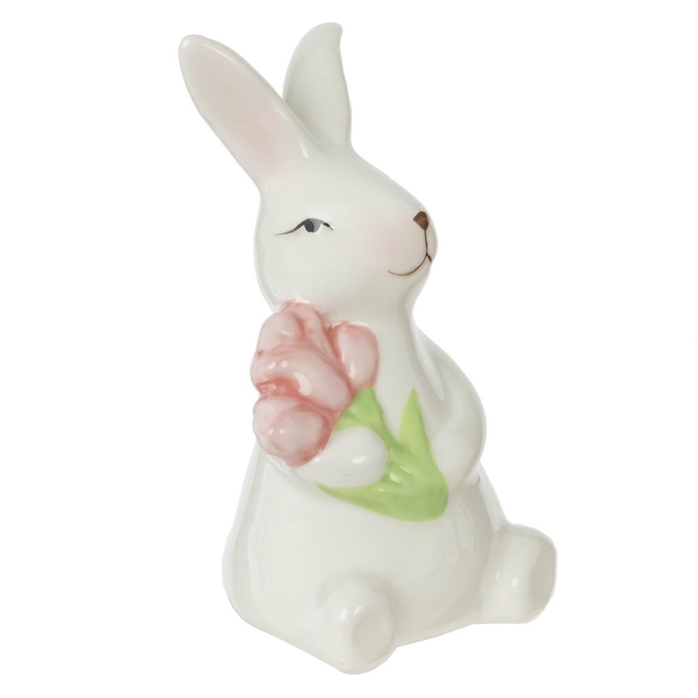 Декоративная фигурка «Заяц» – изящное пасхальное украшение для дома. Милый керамический зайчик выполнен в нежно-белом цвете с глянцевым покрытием и трогательным выражением мордочки: он слегка улыбается и как будто подмигивает. В лапках зверька – букет розовых цветов с ярко?зелёными листьями, который символизирует весну и обновление. Пастельные оттенки легко впишутся в любой интерьер, украсят пасхальный стол, полку или подоконник. Такая фигурка создаст атмосферу уюта и праздника, станет прекрасным дополнением к композициям с яйцами и свечами, а также приятным сувениром для близких и друзей. Материал: керамика.