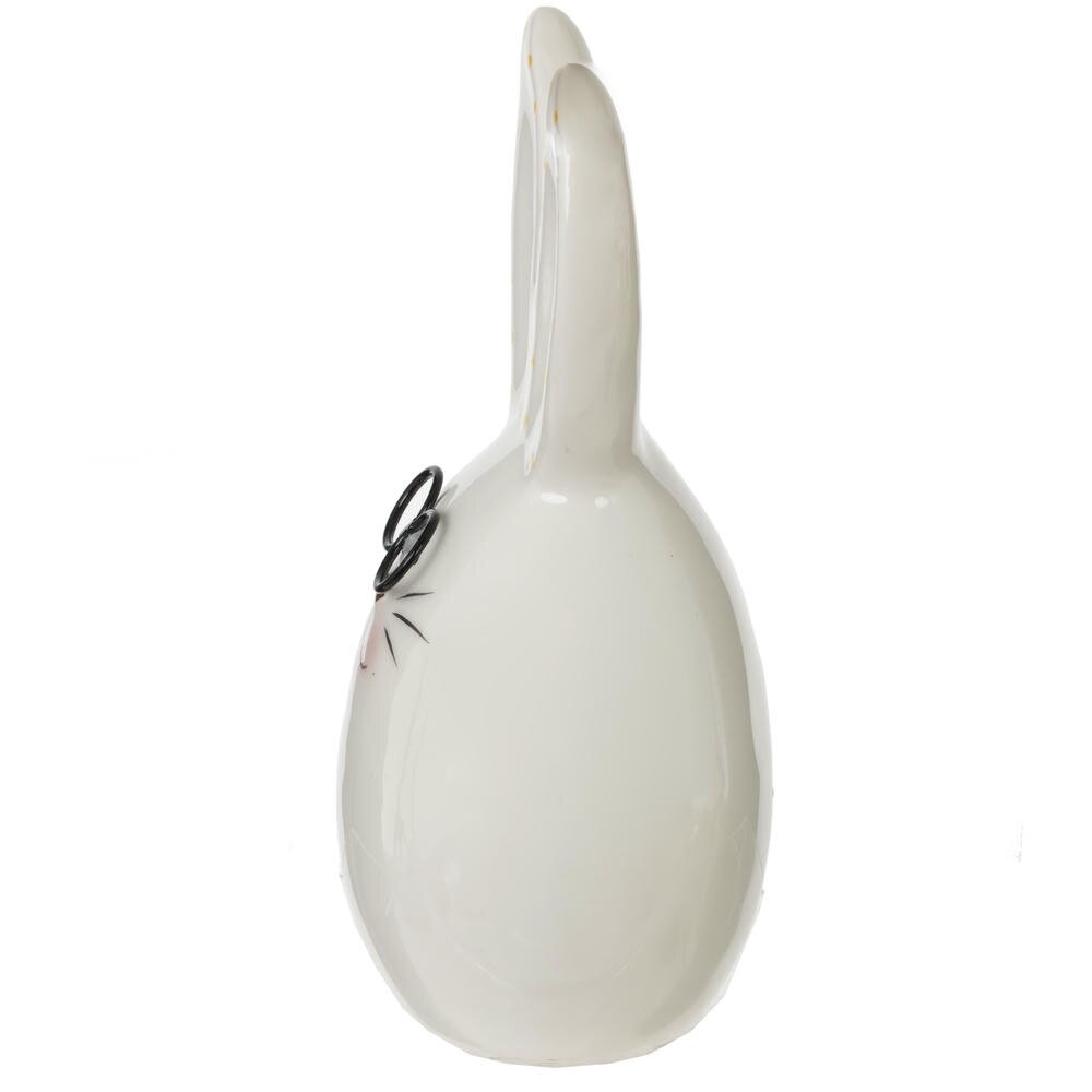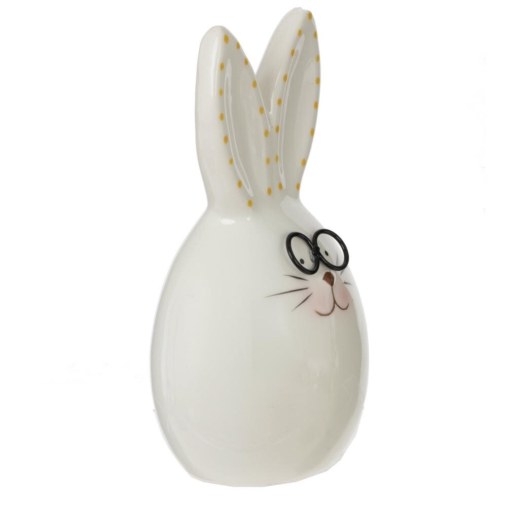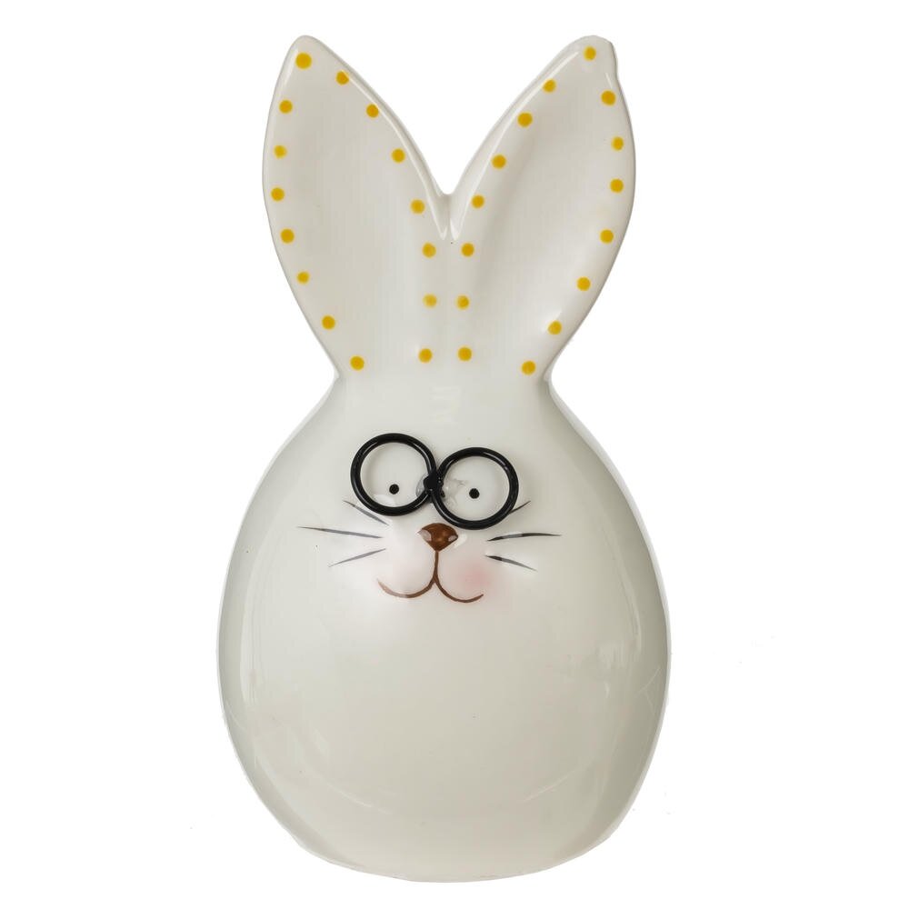 Фигурка Зайчика в очках «Умник» - прекрасное украшение для дома и отличный элемент коллекционирования. Декоративная фигурка имеет размеры: длина 8,5 см, ширина 7 см, высота 15 см. Милый зайчонок выполнен из гладкой белой керамики в форме слегка вытянутого яйца, что особенно уместно к светлому празднику Пасхи. Забавные круглые очки, румяные щёчки и тонкие усики придают фигурке дружелюбный, немного книжный характер. Большие ушки украшены аккуратными жёлтыми горошинами, создающими весёлое весеннее настроение. Такой заяц отлично смотрится на праздничном столе рядом с куличами и крашеными яйцами, подходит для оформления детской, кухни или гостиной. Подобное изделие можно использовать не только как украшение, но и как элемент композиции, объединяя его с другими декоративными объектами. Пасхальная фигурка это отличный подарок к пасхе, на день рождения или 8 марта. Зайчика можно подарить на новый год или любой другой праздник.