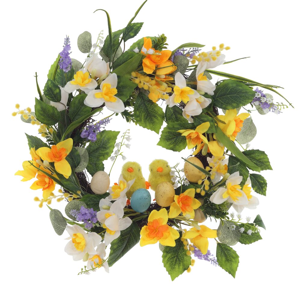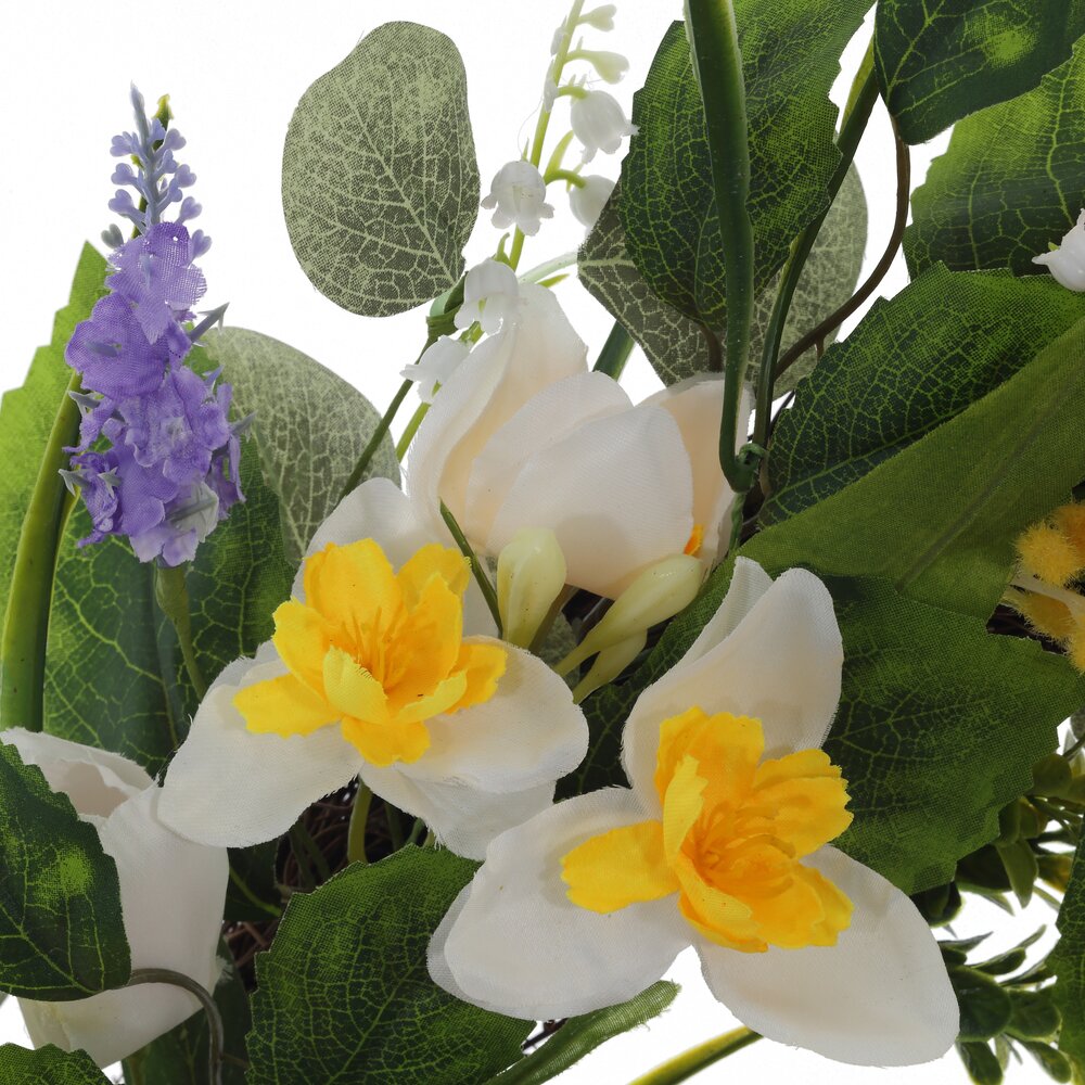 Венок декоративный станет выразительным акцентом весеннего интерьера и создаст атмосферу светлого праздника Пасхи. Размер цветочного венка: диаметр 50 см, толщина 12 см. Основа оформлена пышной зеленью и нежными весенними цветами в жёлто-белой гамме с фиолетовыми акцентами. Композицию дополняют декоративные пасхальные яйца и милые цыплята, символизирующие обновление и начало новой жизни. Венок можно повесить на входную дверь, стену, над камином, использовать как центр композиции на столе или в фотозоне. Лёгкий и прочный, он не осыпается и долго сохраняет аккуратный вид, подойдёт как для квартиры, так и для загородного дома. Благодаря своему стильному дизайну, он добавит красоты и комфорта в ваш дом. Венок в свежей и природной гамме гармонично впишется в любой интерьер. Венок с искусственными цветами отлично подойдет в качестве декора для сада, крытых веранд и беседок. Обратите внимание, что после получения венка необходимо аккуратно расправить его ветки, чтобы придать им объём. Во время транспортировки и распаковки ветки могут выпадать, но вы легко сможете вернуть их на место. Крючок или петелька для подвешивания не входят в комплект.